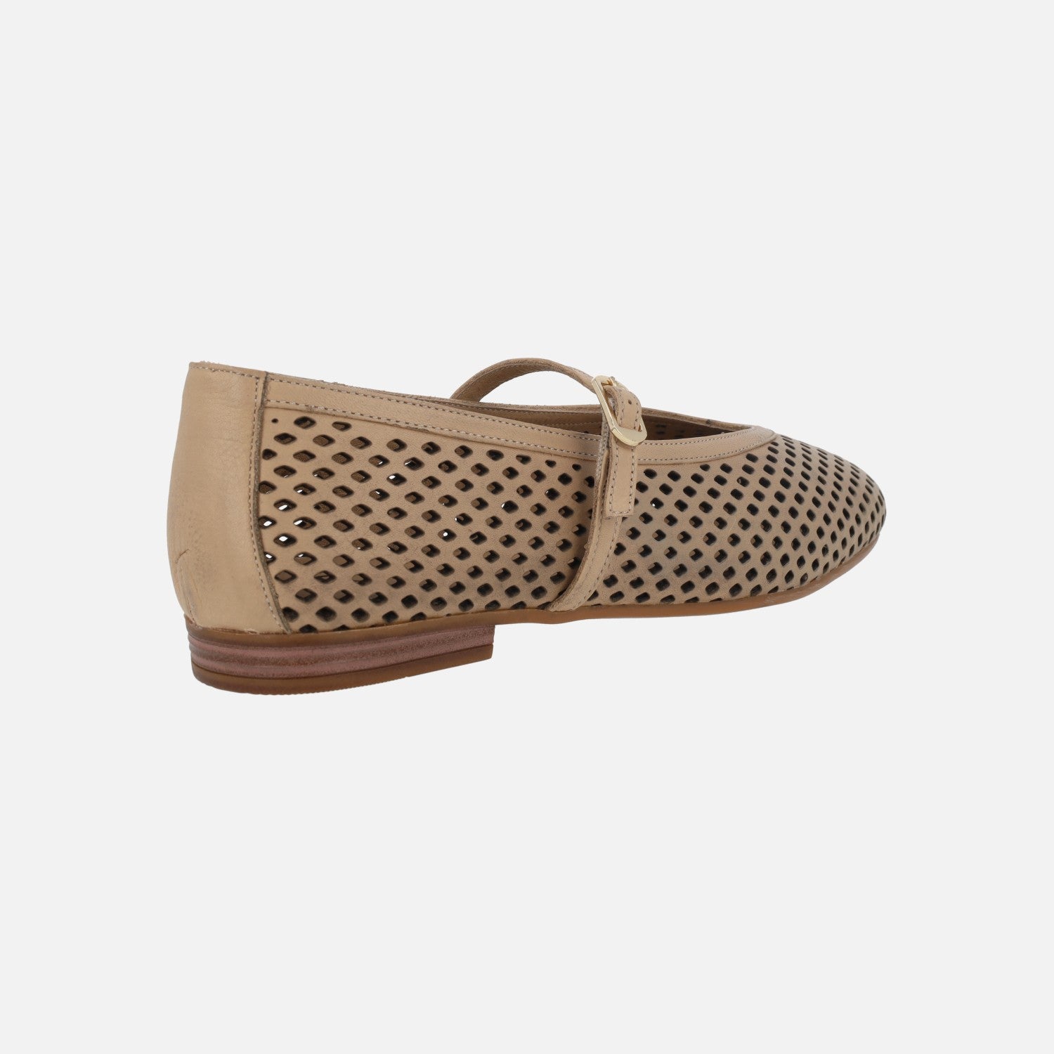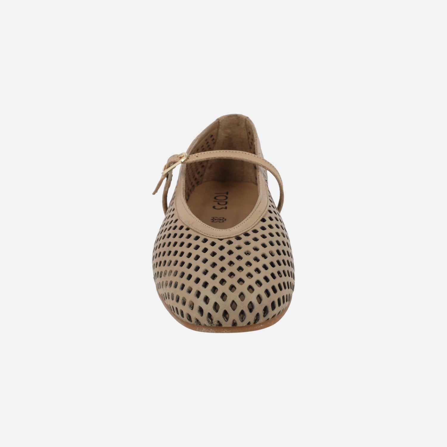 Mary Jane style ballerinas for women from the Top3 brand model 1550, available in brown and cappuccino. Brown or beige leather ballerinas with openwork detail and bracelet with adjustable buckle crossing the instep. Leather interiors. Synthetic outsole with barely 2 cm heel.