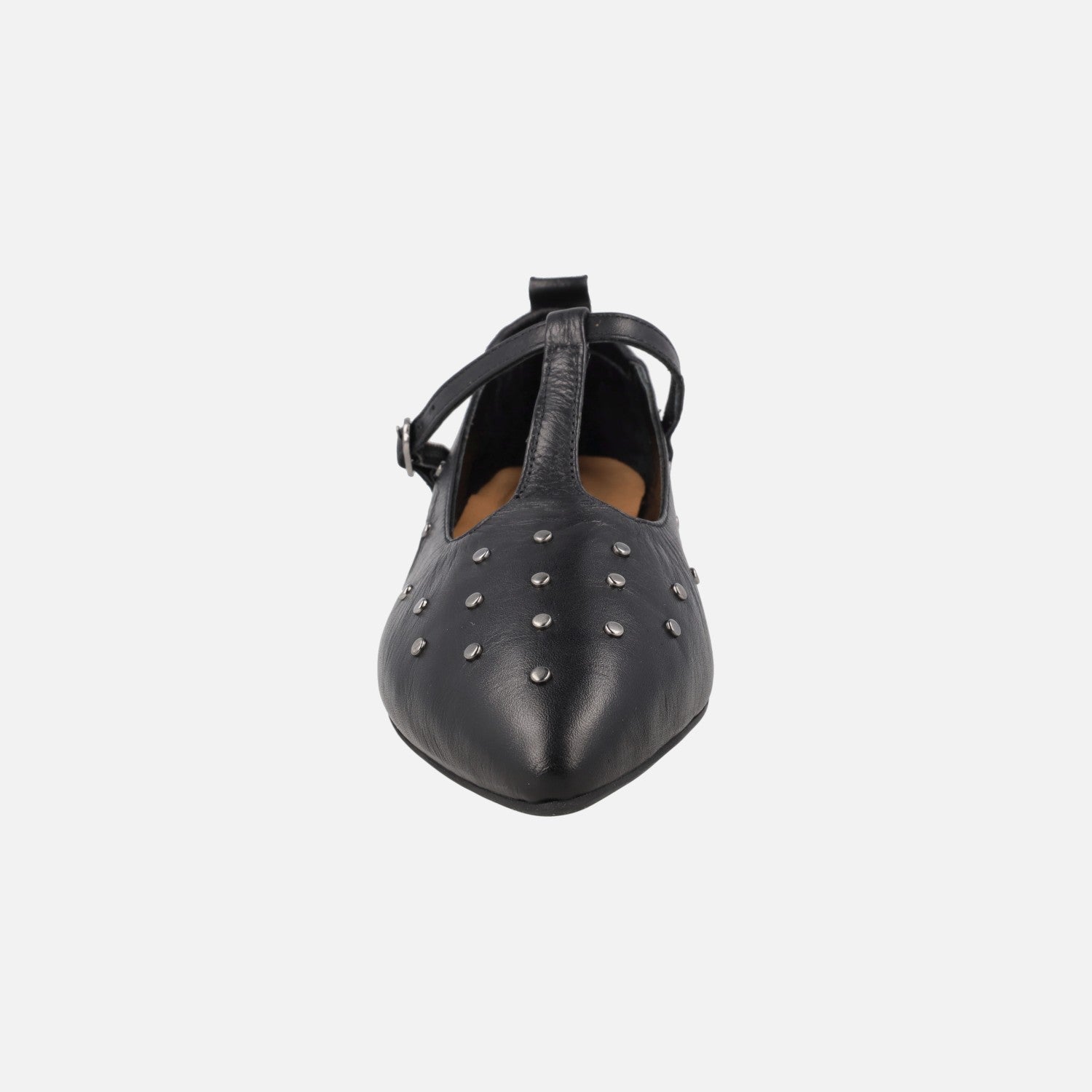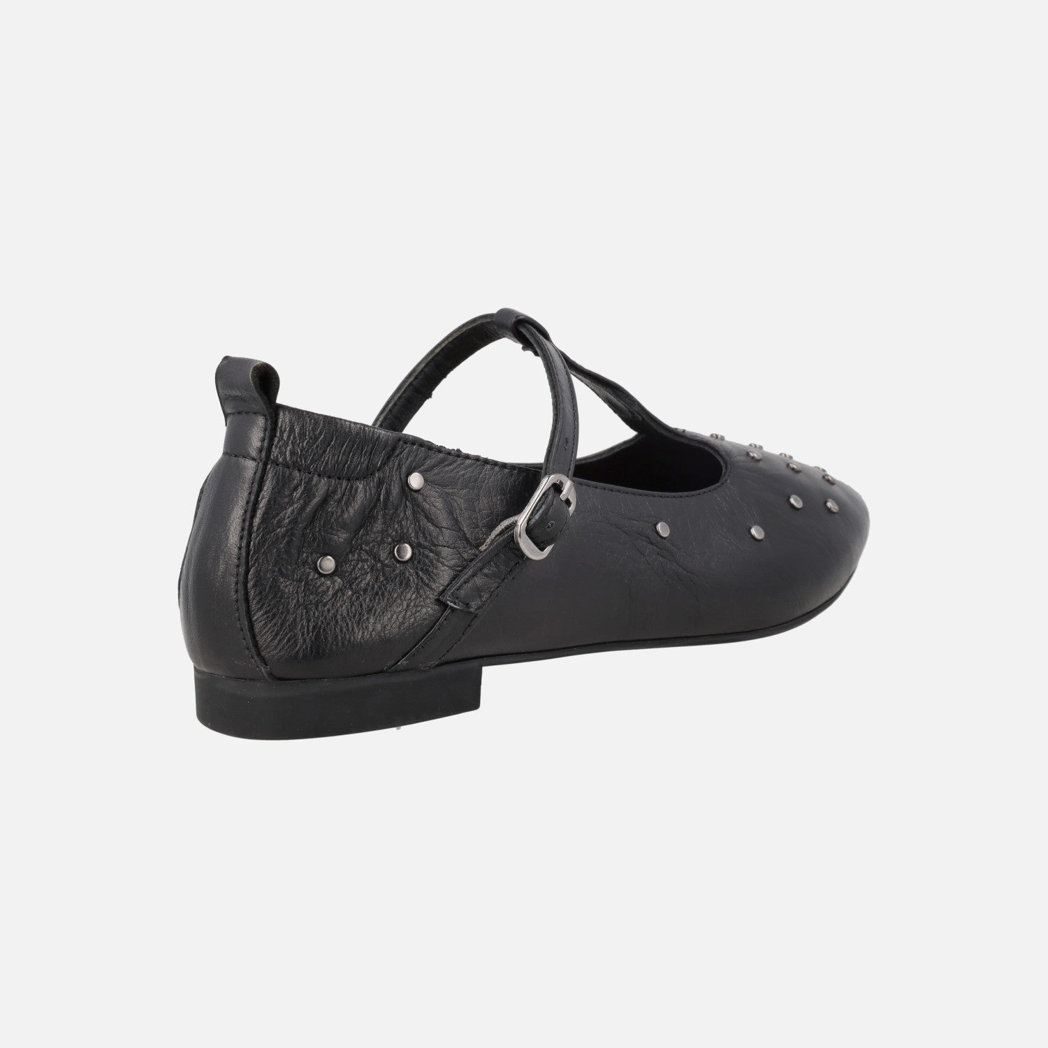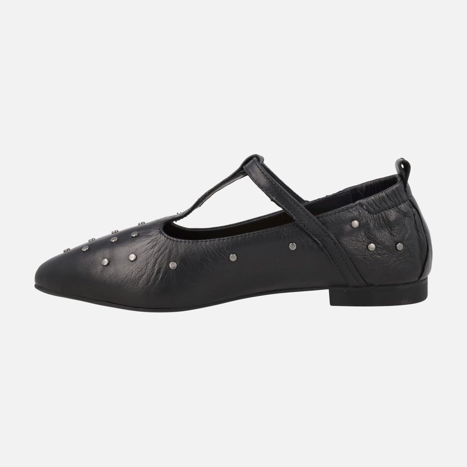 Mary jane-style leather flats of the TOP3 brand, model 722 Black. Black leather ballerinas with a vertical and horizontal strip crossing the instep, making a T, with buckle closure. Metallic studs detail. Leather interiors. Flat outsole, barely 1 cm high.
