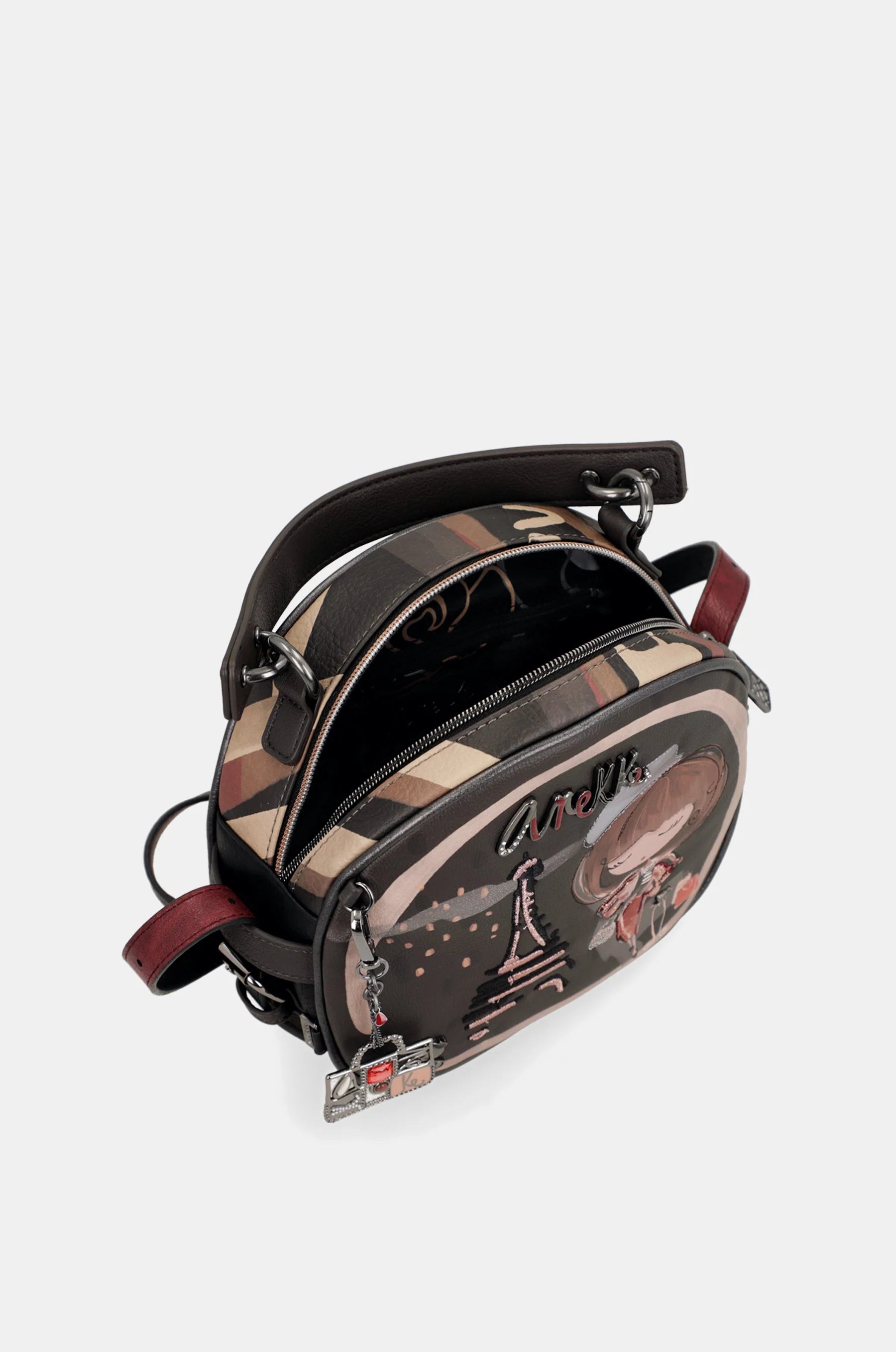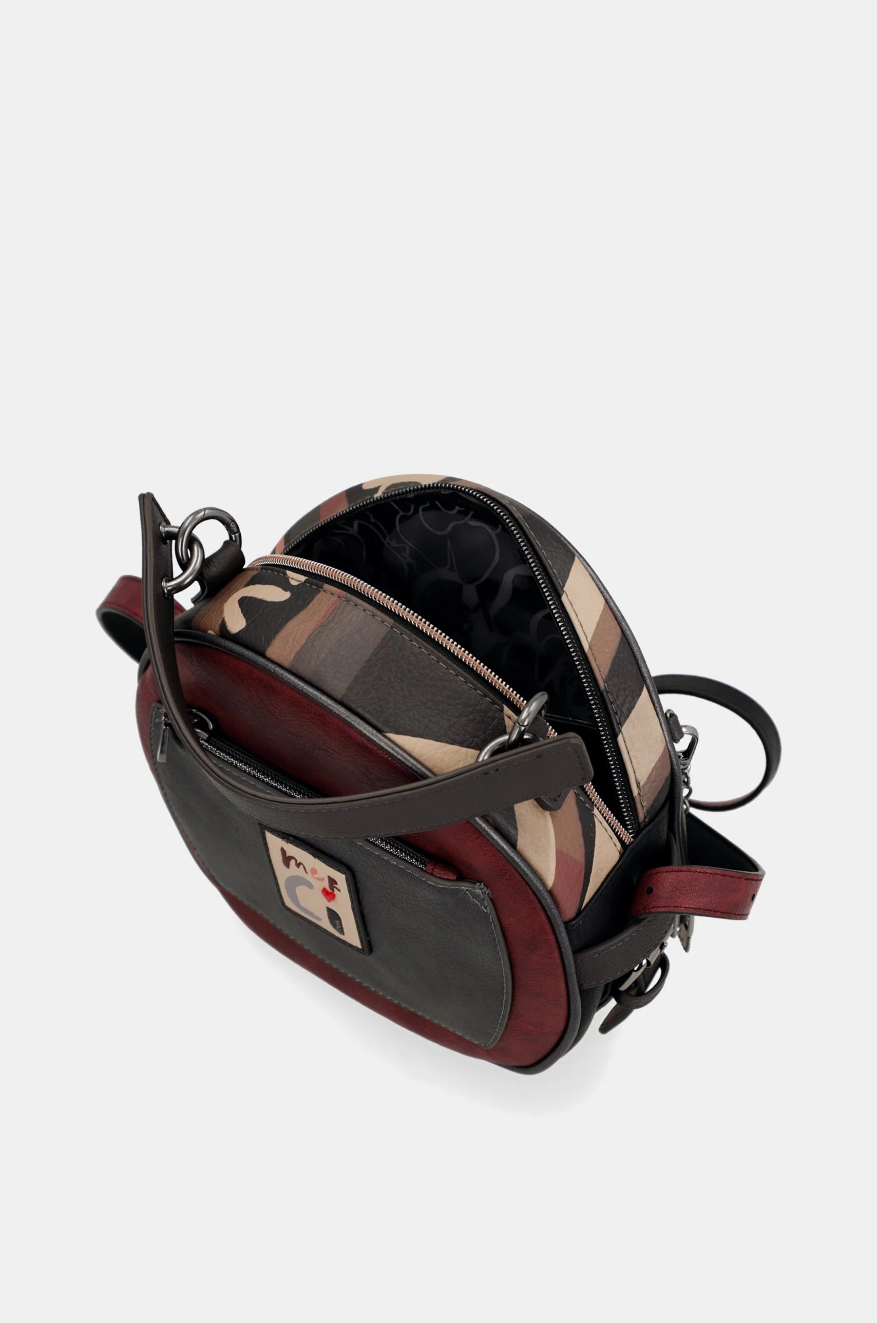 Semicircular bags of the ANEKKE brand model Mademoiselle 41803-081. Bag made of synthetic materials, 100% PU, in brown combined, taupe and red details. Main compartment with zip closure. Back pocket also with zip closure. Embroidered and metallic details. 100% polyester textile interior. Little handle at the top to carry by hand. Adjustable handle for crossbody, 65 cm with a maximum to the shoulder. Measures: 20 cm high x 20 cm lower width x 22.5 cm central width x 9 cm deep.
