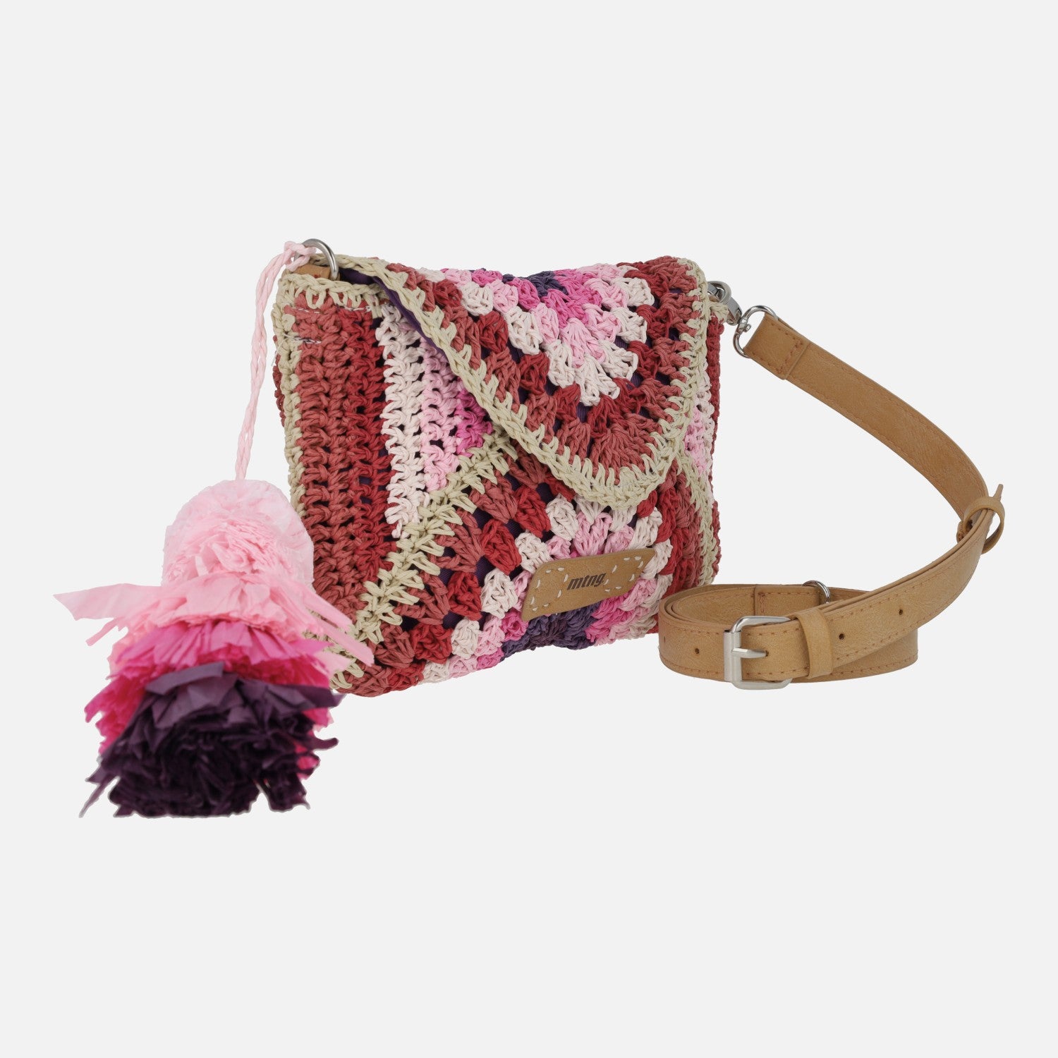 Crossbody Bags of the Mustang brand Model Dari brand, available in three combinations: Violet/Red, Black/brown or natural/makeup. Bags made in raffia paper, Crochet -style. Flap with a magnetized brooch closure. Textile interior (polyester). Crossbody handle included, to carry by the shoulder or crossed, made of synthetic materials, removable and adjustable up to a maximum of 62 cms on the shoulder. Tassel ornament with multicolored pompoms. Measures: 19.5 cm high x 23 cm wide x 2 cm background.