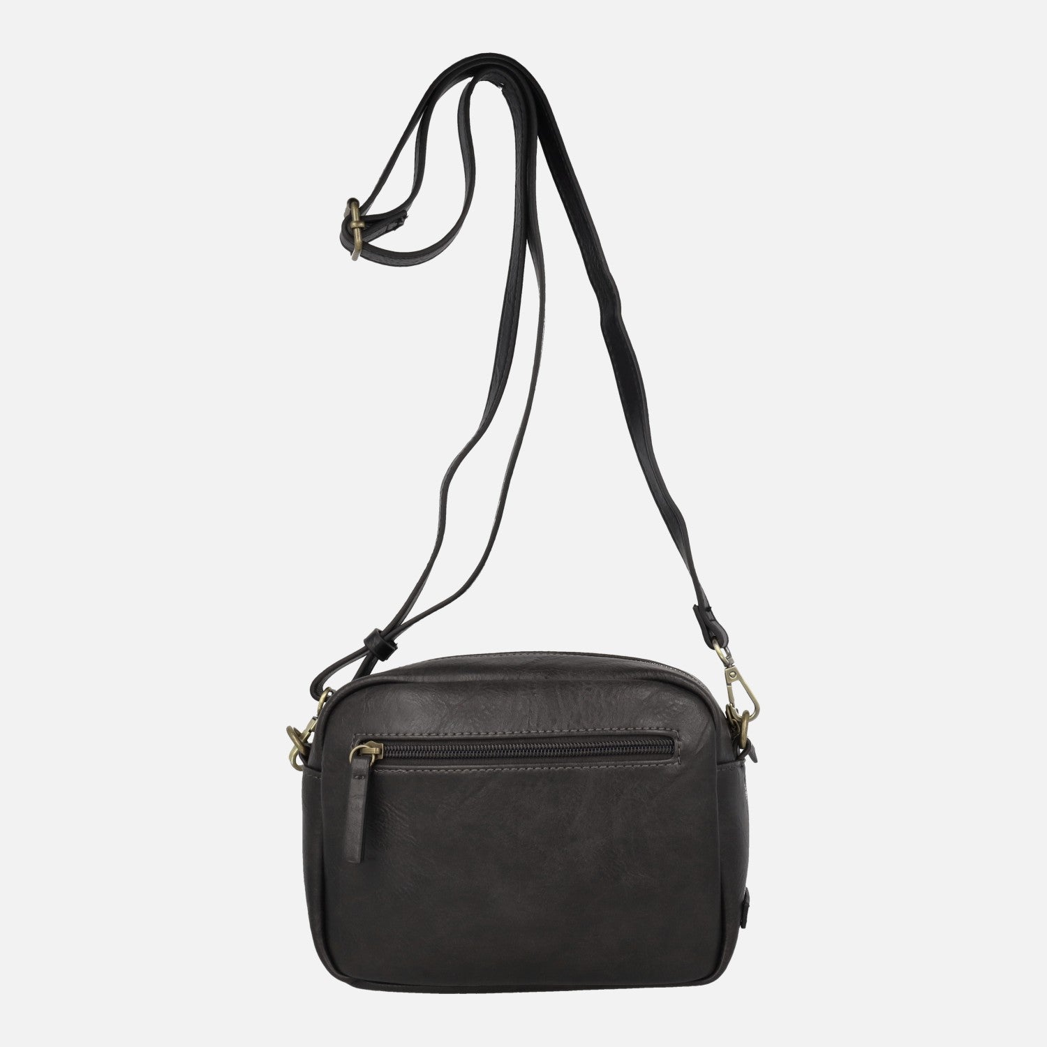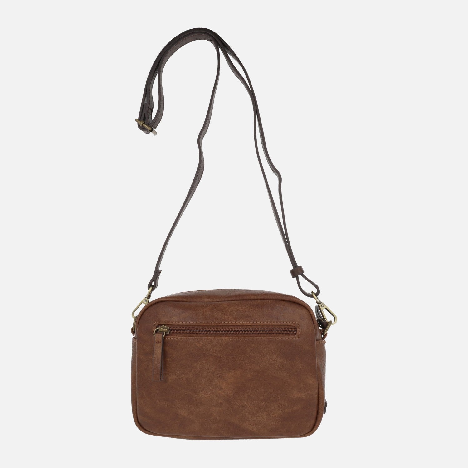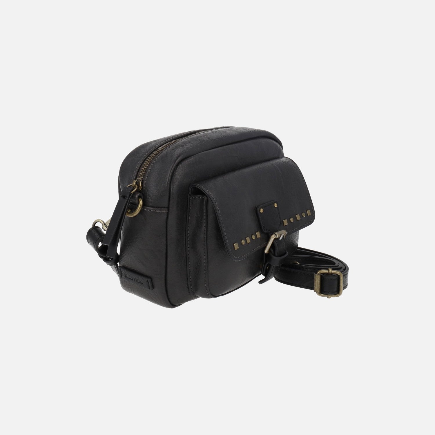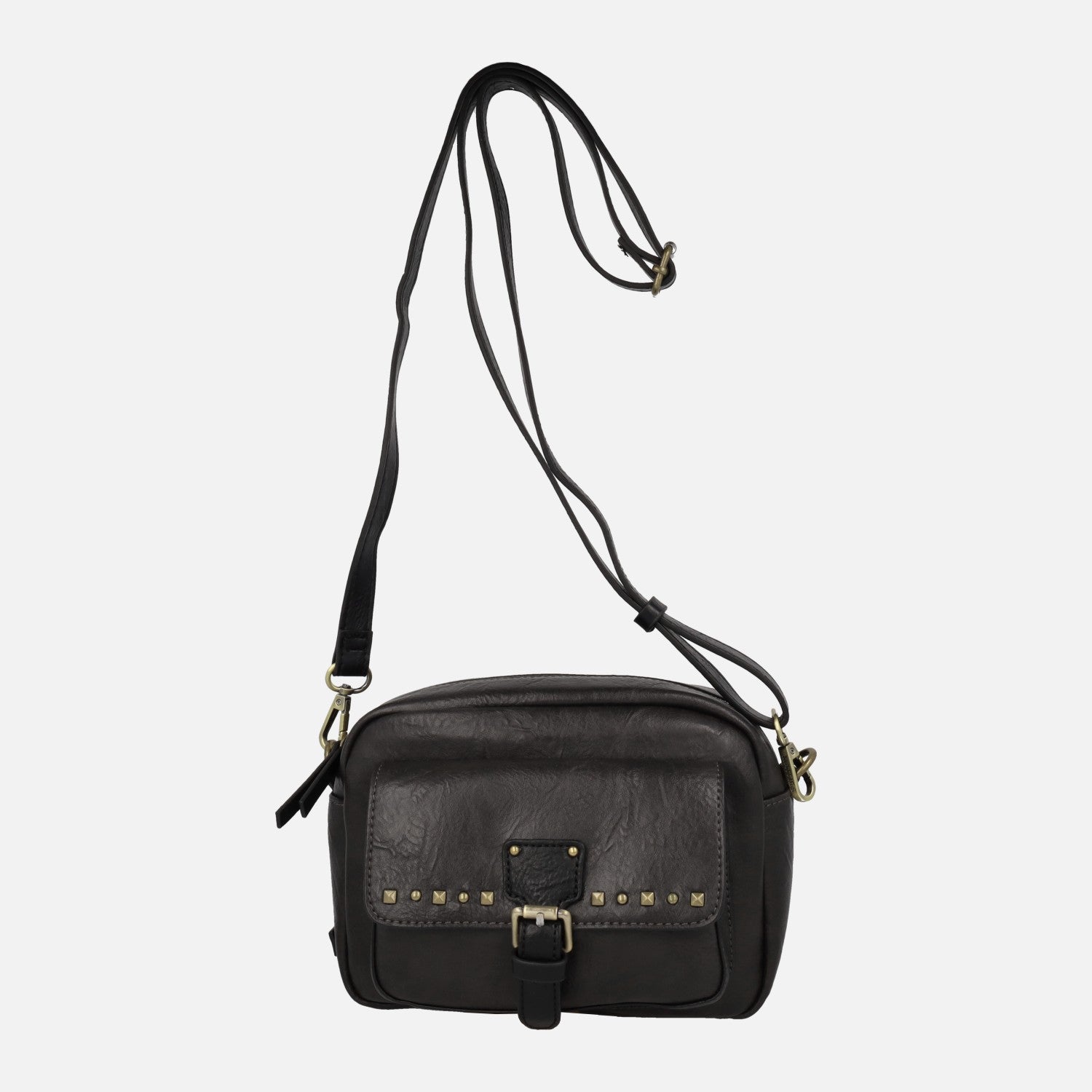 Small size shoulder bags from the Matties brand, model Verota 20971, available in Black and in brown. Made of imitation leather (synthetics) imitating natural leather, with studded detail. Main zipper closure. Front pocket with magnetic snap closure, back pocket with zipper. Adjustable shoulder strap with buckle. Measurements: 18 cm high x 21 cm wide x 8 cm deep.