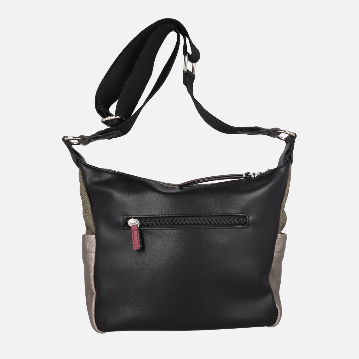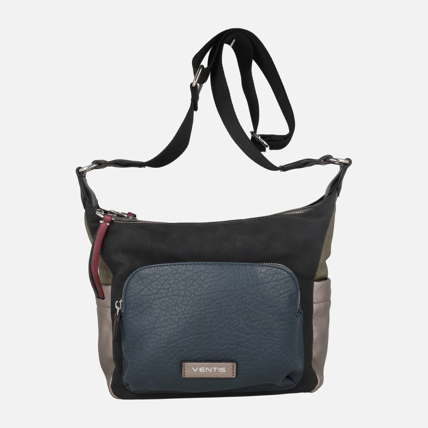 Crossbody bags for women from the Ventis brand model 252130 03 Blue. Bags made of synthetic materials (PU) combining Black, blue, khaki and metallics. It has two main compartments, both with zipper closure. Front and back pockets both with zipper. Two side pockets with magnetic snap closure. Polyester fabric interior with pockets. Adjustable handle for carrying as a shoulder bag. Measurements: 20 cm high x 24 cm bottom width x 29 cm top width x 10.5 cm depth.
