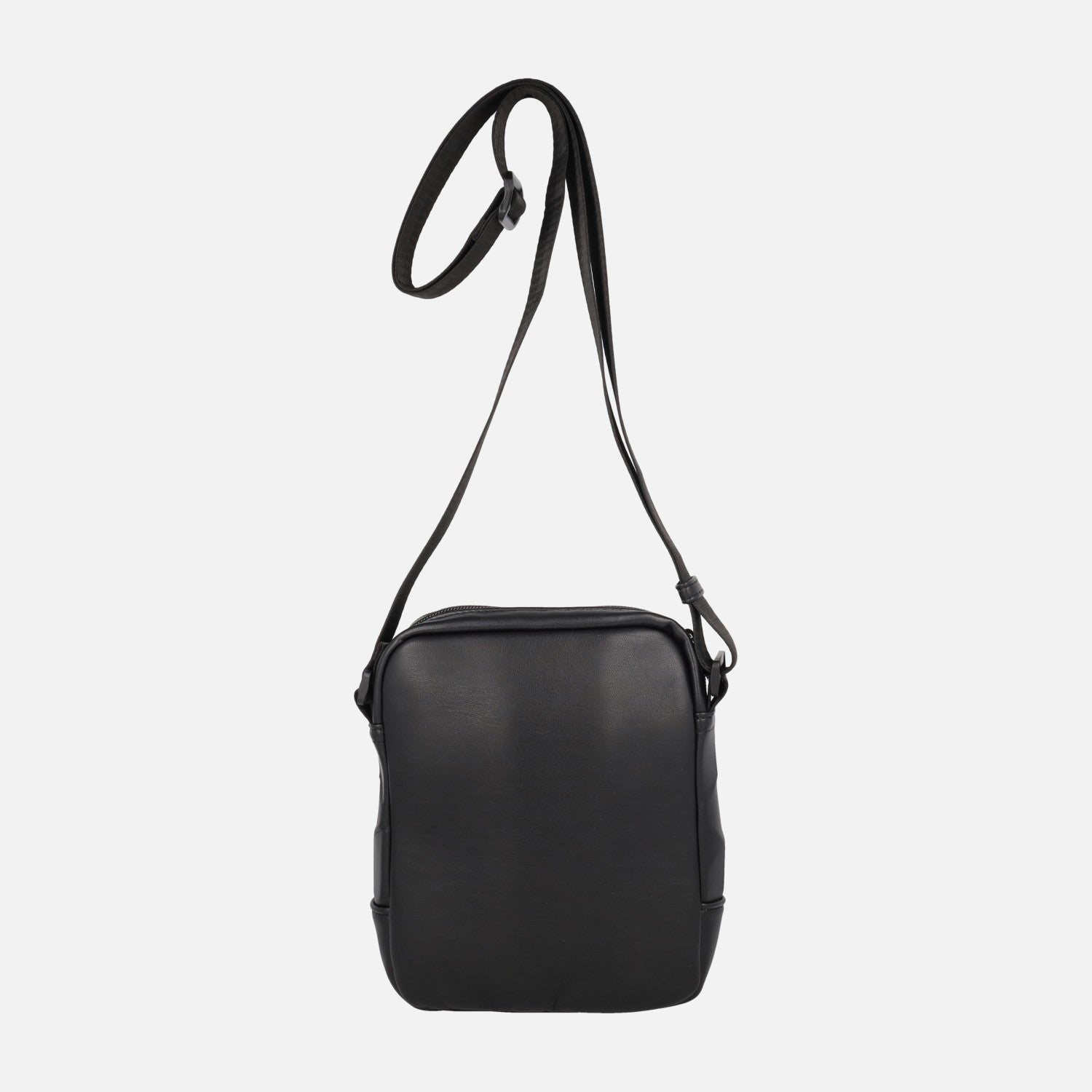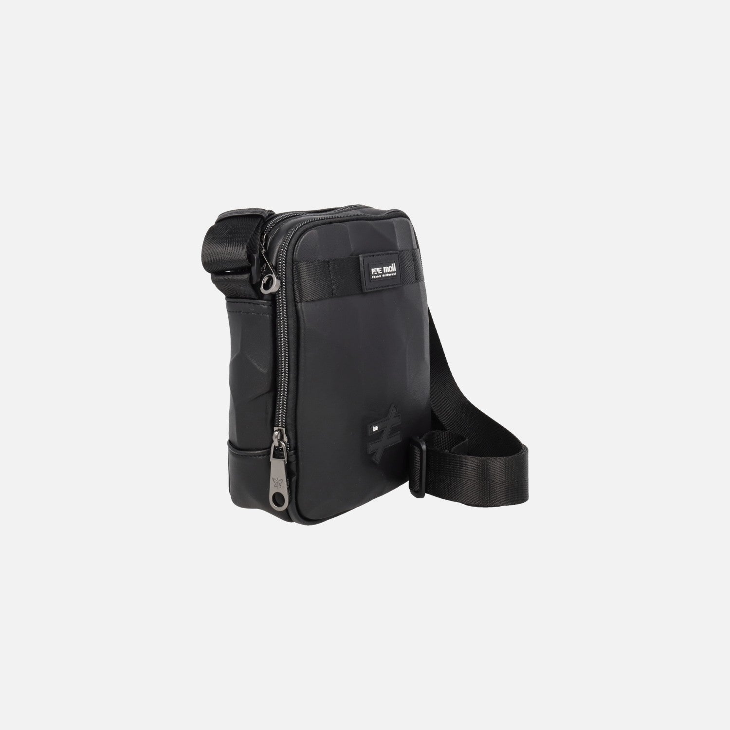Reporter style shoulder bags for men brand Pepe Moll model 252503 Adam black. Bags made of vegan synthetic materials, 100% polyurethane, in color Black, with geometric finish and leather effect. Two main zippered compartments. Textile interior with pockets. Adjustable shoulder strap handle. Measurements: 20 cm high x 16 cm wide x 6 cm deep.