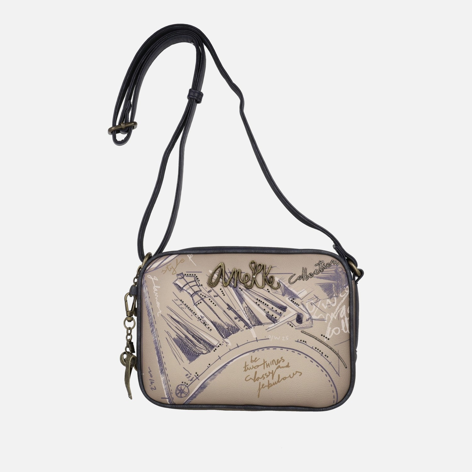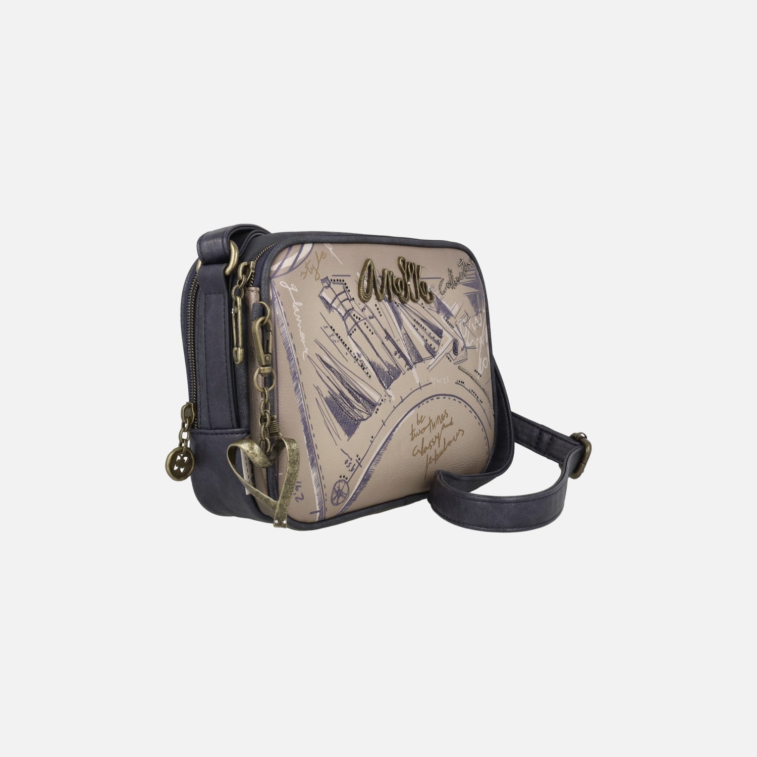 Beautiful Studio Model 41843-183 Anekke brand crossbody bags. Bags made of synthetic materials, combining blue and taupe. Embroidery and rhinestones ornament, it also carries a keychain. Two independent main compartments with zipper. Textile interior with pockets. Adjustable handle up to 65 cm on the shoulder maximum. Measures: 17 cm high x 23 cm wide x 8 cm back.
