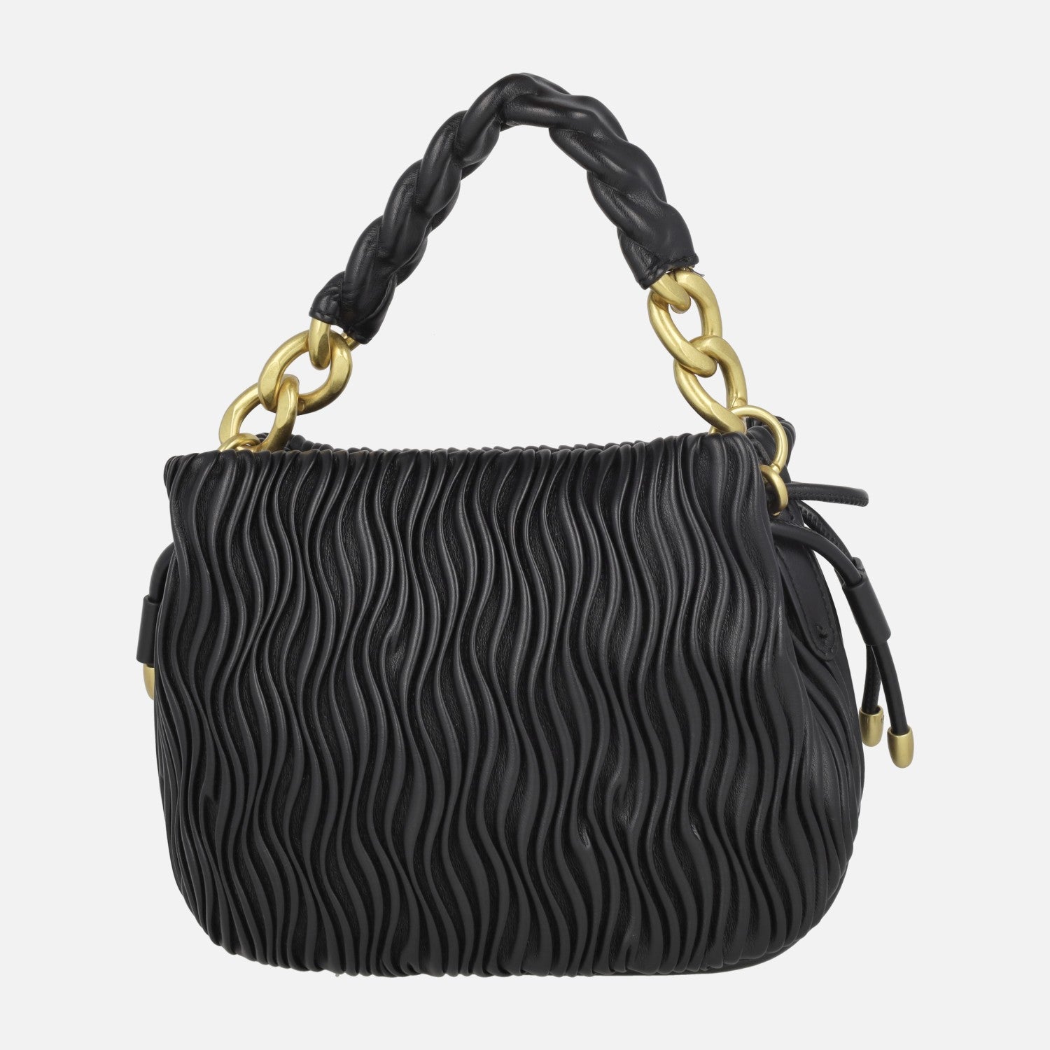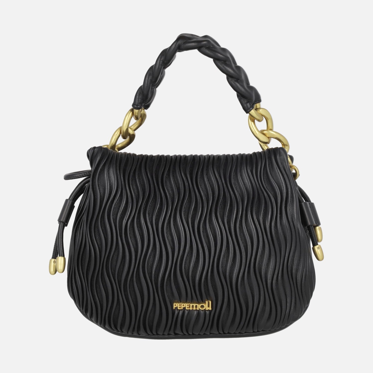 Pepe Moll bags model 252261, available in Black and in brown. Bags with a 100% polyurethane exterior, with a gathered texture making waves. Zipper closure. Textile interior with interior pockets. Short chain handle with a lined part, to be carried by hand and removable. It also includes an adjustable and removable handle for carrying as a shoulder bag.  Measurements: 19 cm high x 25 cm bottom width x 20.5 cm top width x 10 cm depth.