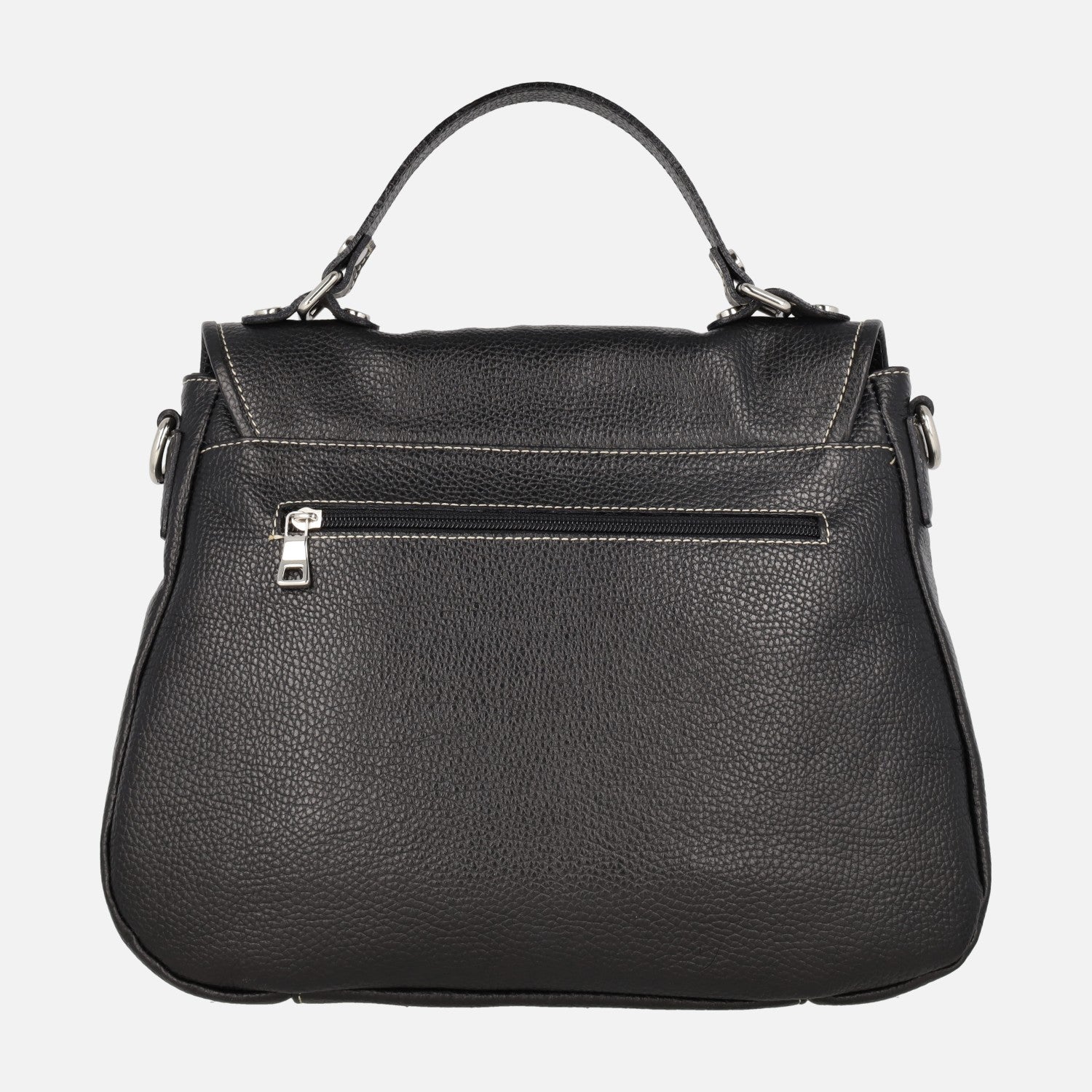 Gonvi Model 332 brand handbags in Black. Classic style bags, made of leather, with a lid and Gonvi logo printed on it. Back pocket with zipper. Handle to wear by hand and handle also included for crossbody. Main compartment with lid closure with magnetized brooch and zipper. Textile interior with pockets. Measures: 27 cm high x 31 cm lower width x 28 cm upper width x 10 cm background.