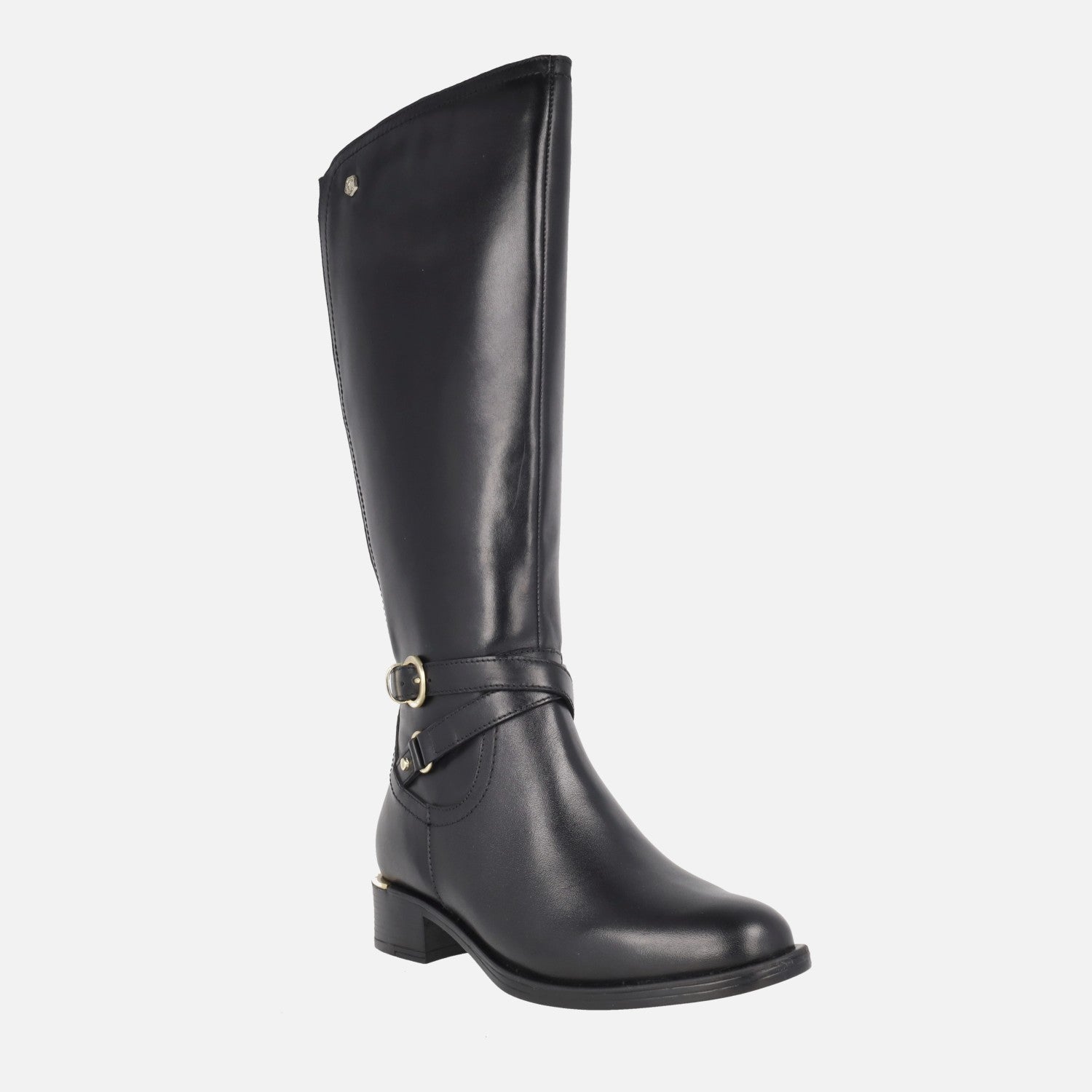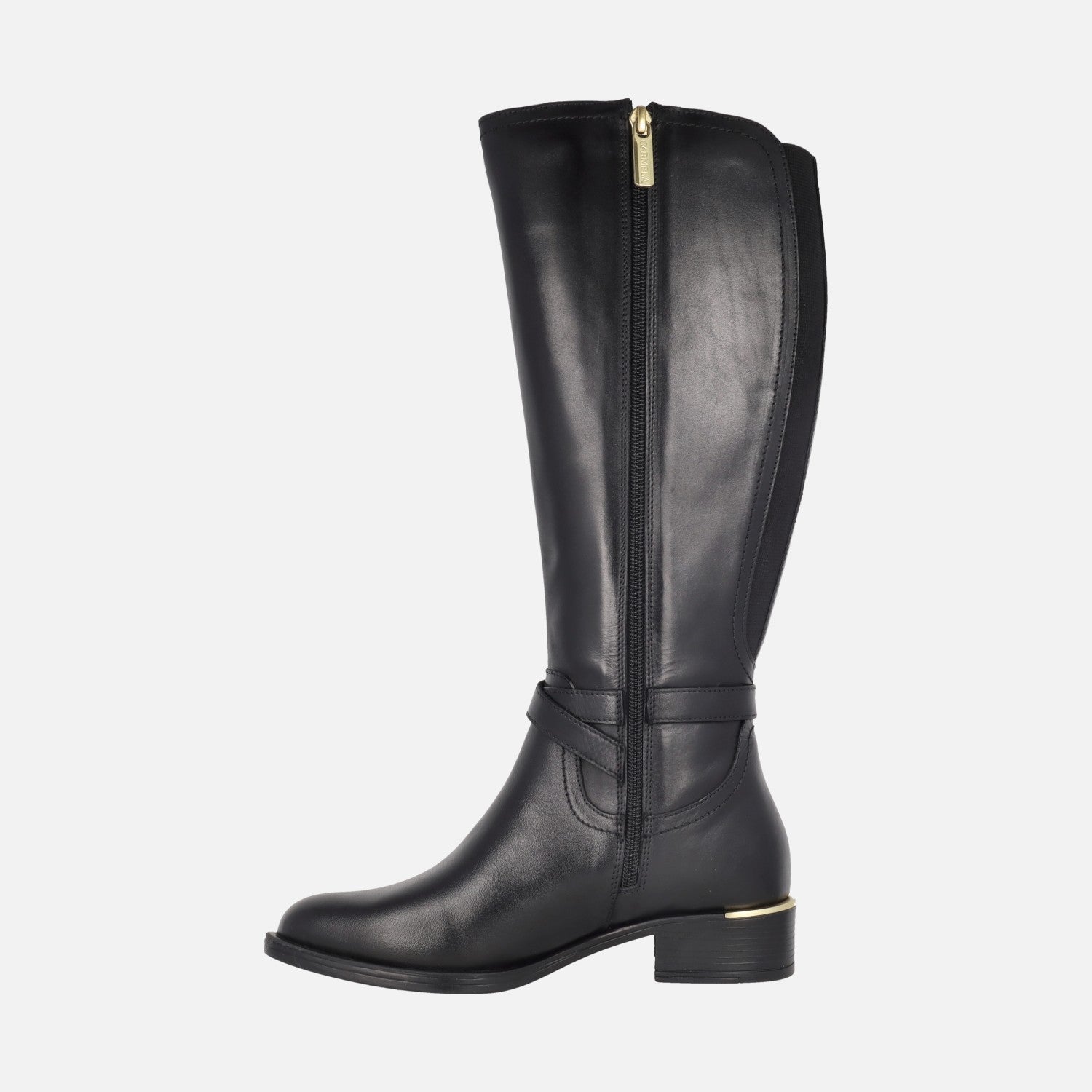 High leg boots of the Carmela Shoes brand model 162020 Black. Black leather boots, with zip closure on the inner side. Elastic back, for a greater fit in the leg. Golden metallic hardware. Mixed indoor in leather and fabric. 37 cm high leg. Synthetic ousole with 4 cm heel.