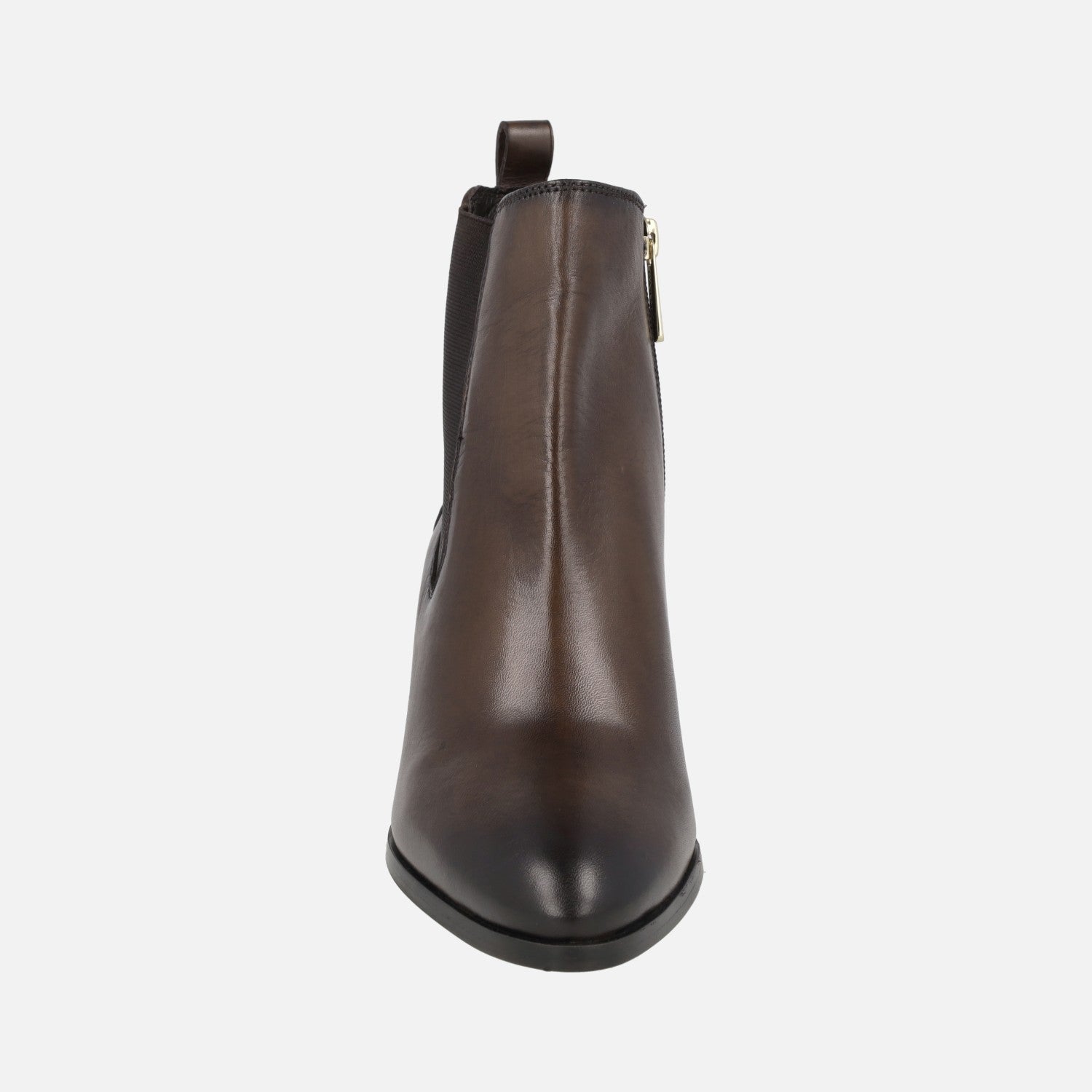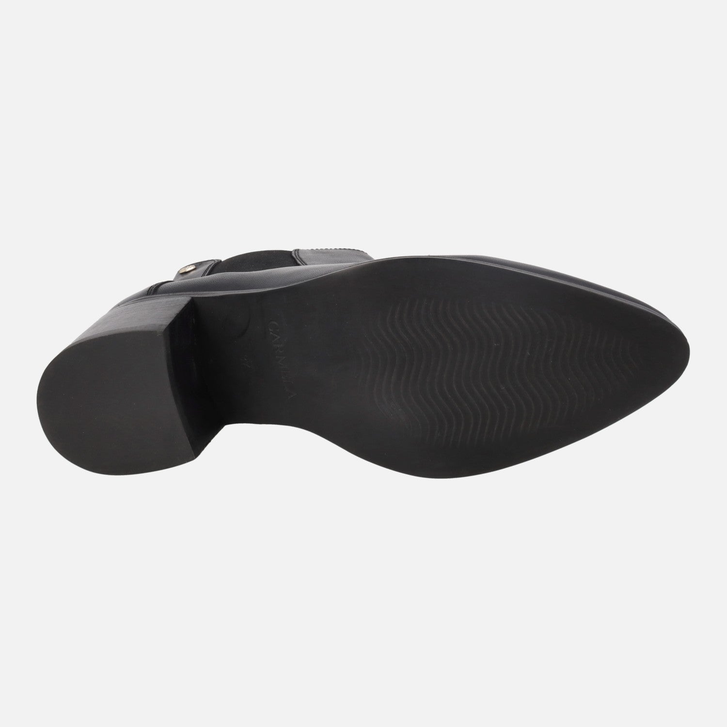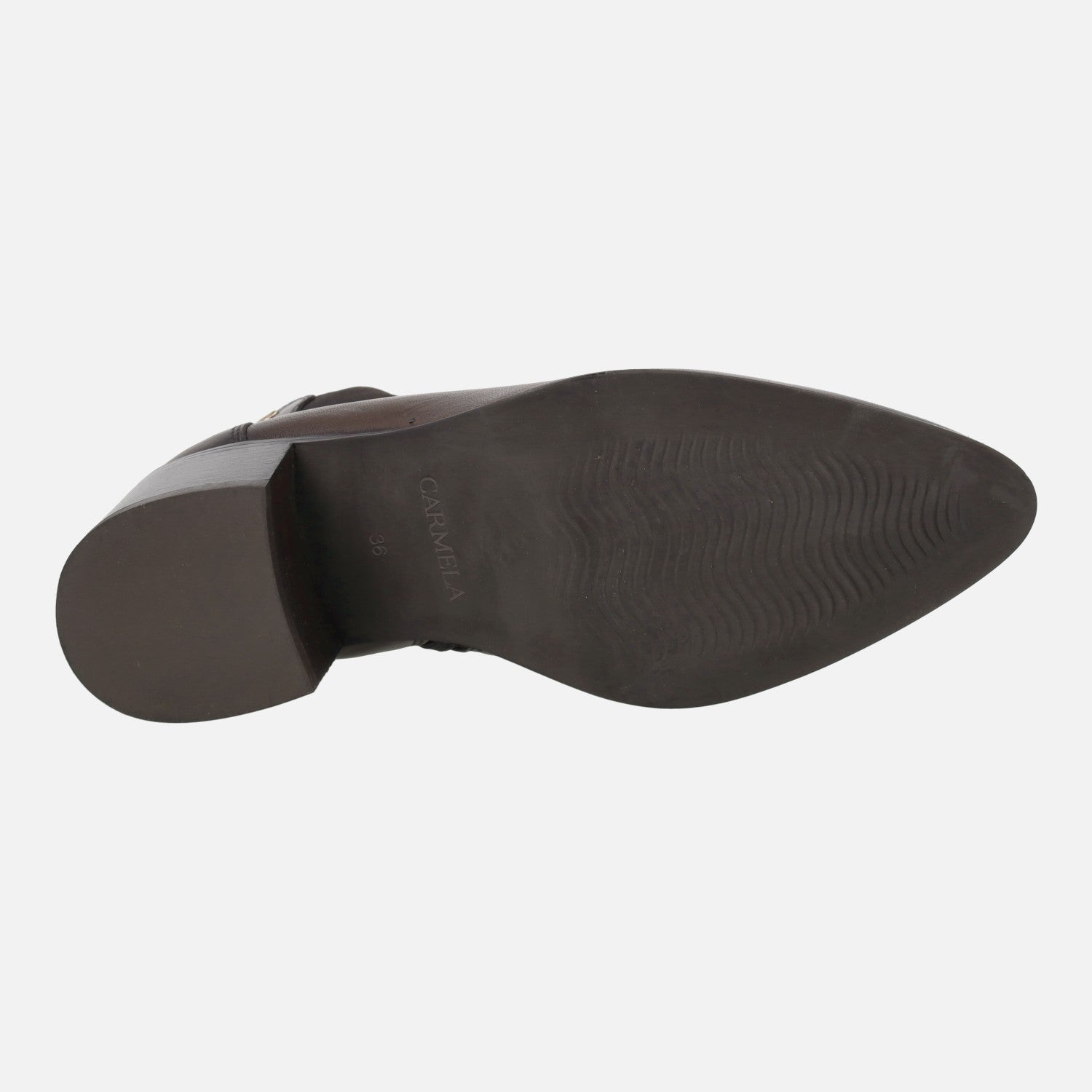 Leather booties of the carmela shoes brand model 162715. Black boots or chocolate brown, leather with elastic on the outer side and zip closure on the inner side. Interiors in skin and fabric combined. 13 cm cane with shooter. Synthetic floor 6 cm heel.