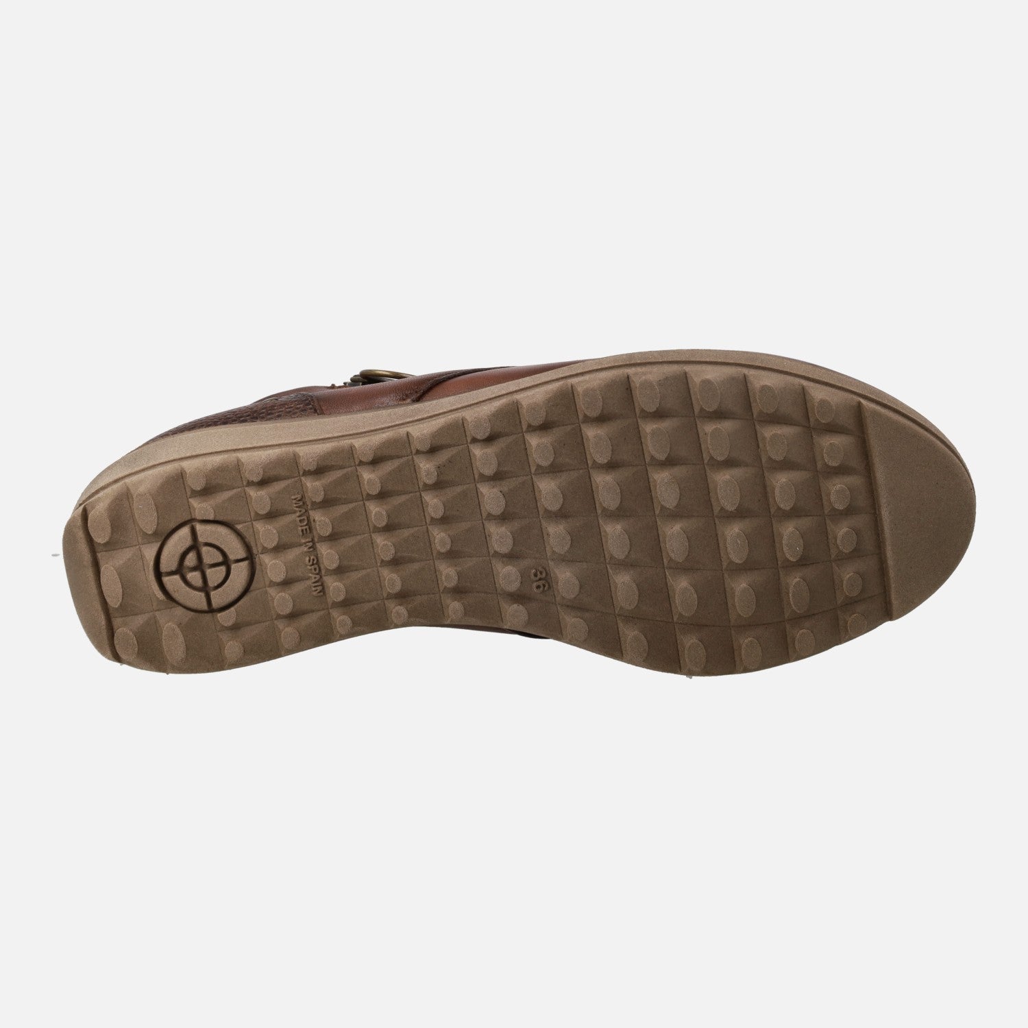 Comfort booties for Women of the brand Giorda Model Bo27942 brown. Leather ankle boots, leather brown, with a slightly darker printed leather in the heel. Lace -up closure and also zipper on the outer side. Furry lining, leather insoles. Synthetic outsole with 4 cm wedge (1.5 cm front). Approximately 8.5 cm leg. Metal Bronze details. Made in Spain.