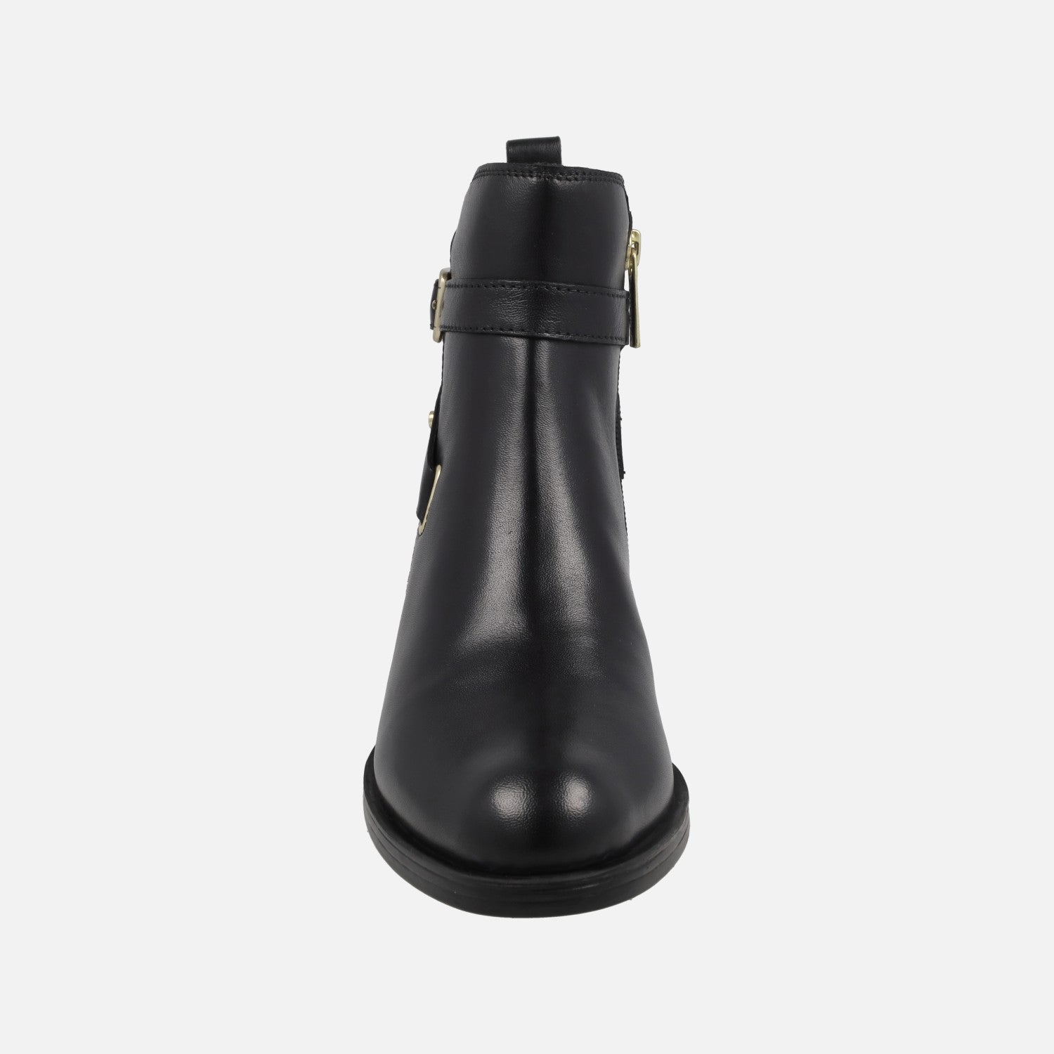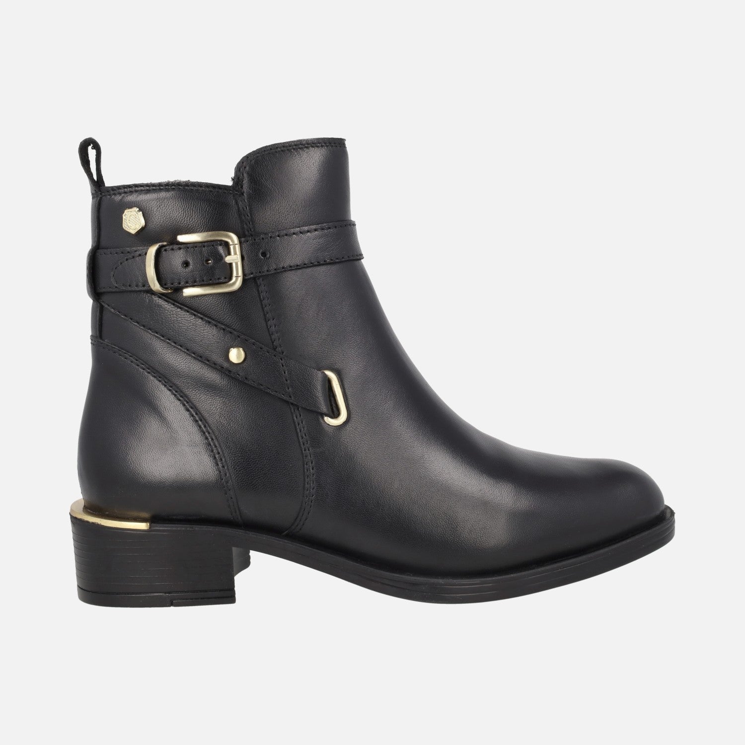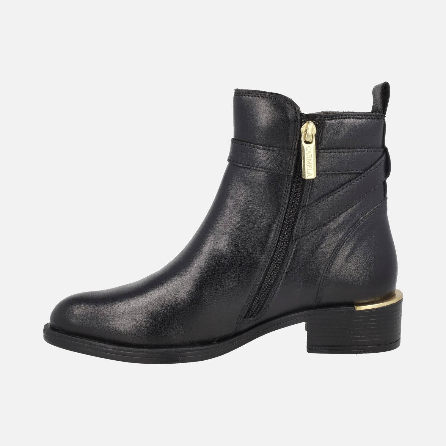 Black leather boots of the carmela brand model 162475 Black. Booties made of black leather, with zip closure on the inner side. Golden metallic hardware. Mixed leather and fabric interior. 13 cm leg. 4 cm heel rubber outsole.