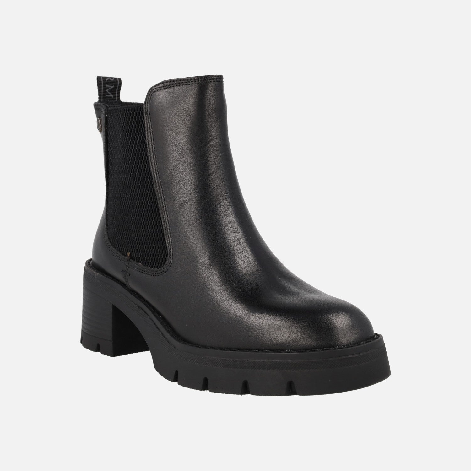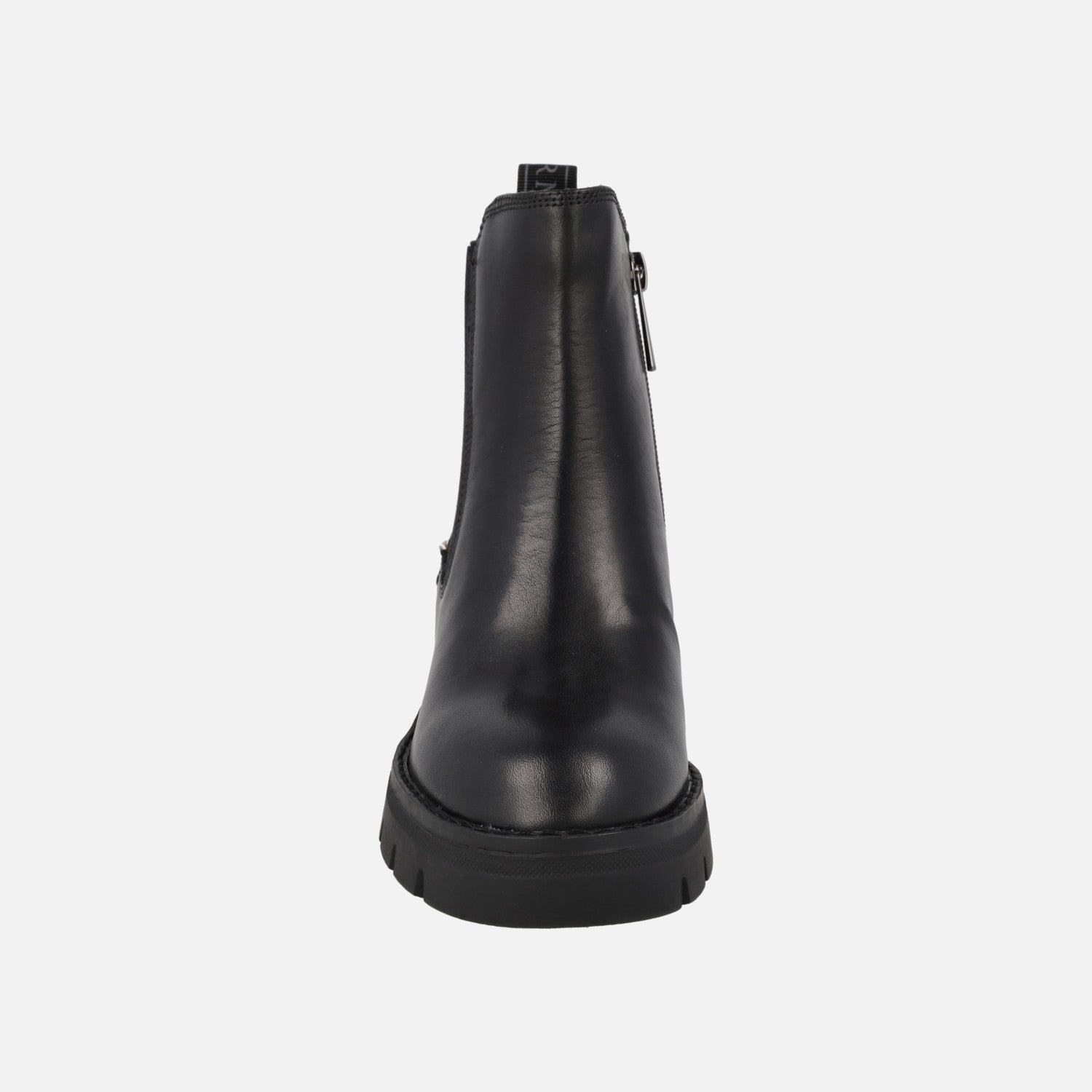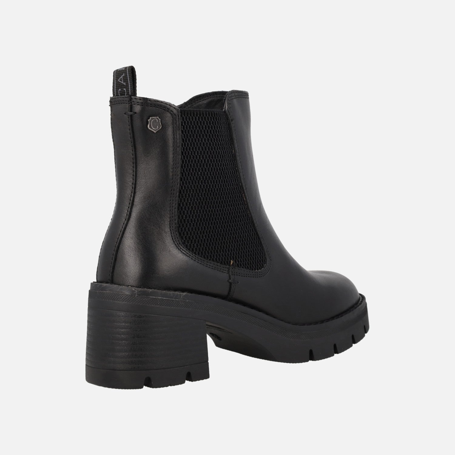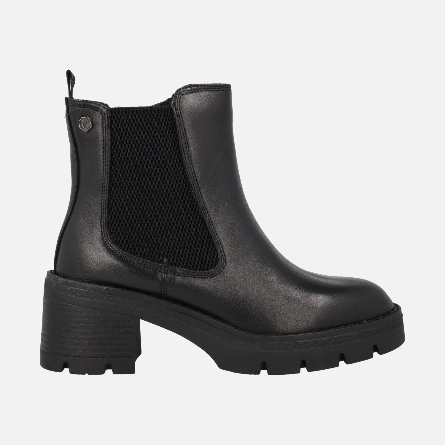 Black leather ankle boots Carmela shoes brand model 162573 Black. Black ankle boots, with leather exterior and elastic piece on the outer side, Chelsea style. Zipper on the inner side. Textile lining, removable leather insoles. Rubber outsole, with 6 cm heel (2.5 cm front platform). 11 cm leg height, with handle.