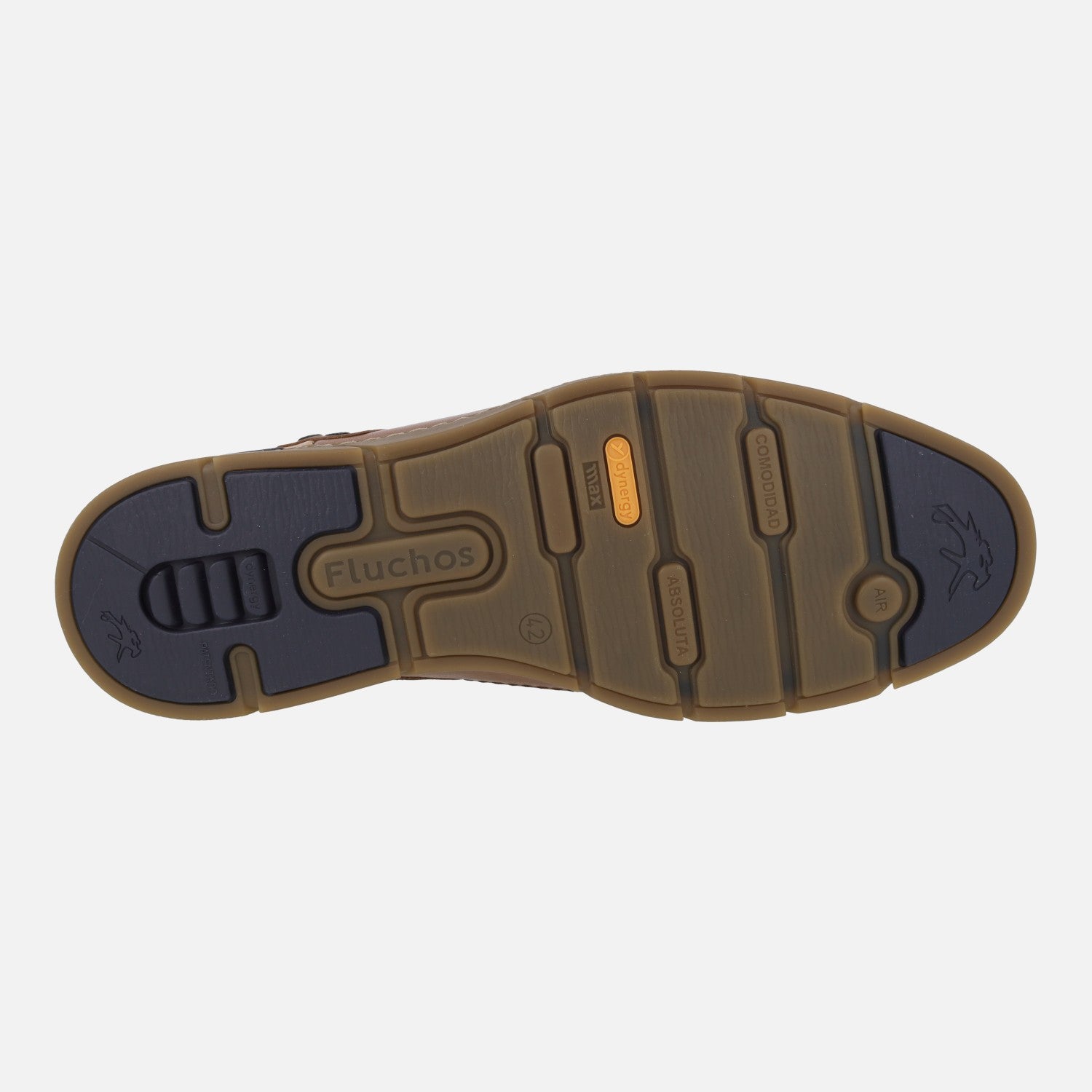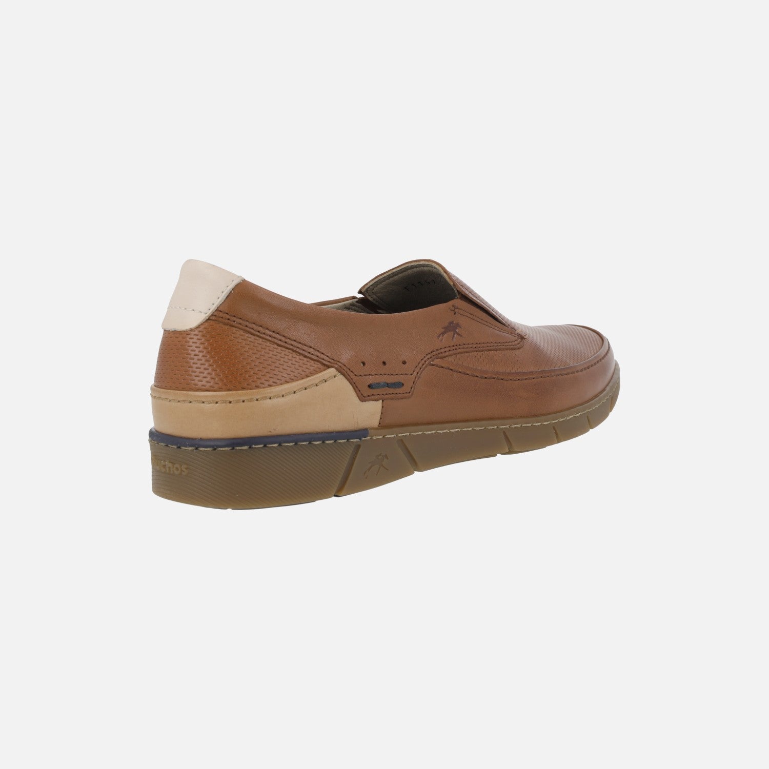 Comfort moccasins for men from the Fluchos brand model Barry F1157 Habana cuero. Brown leather loafers with beige details. Side elastics for better fit and support. Textile interior with removable insoles. TR Dynergy max outsole.