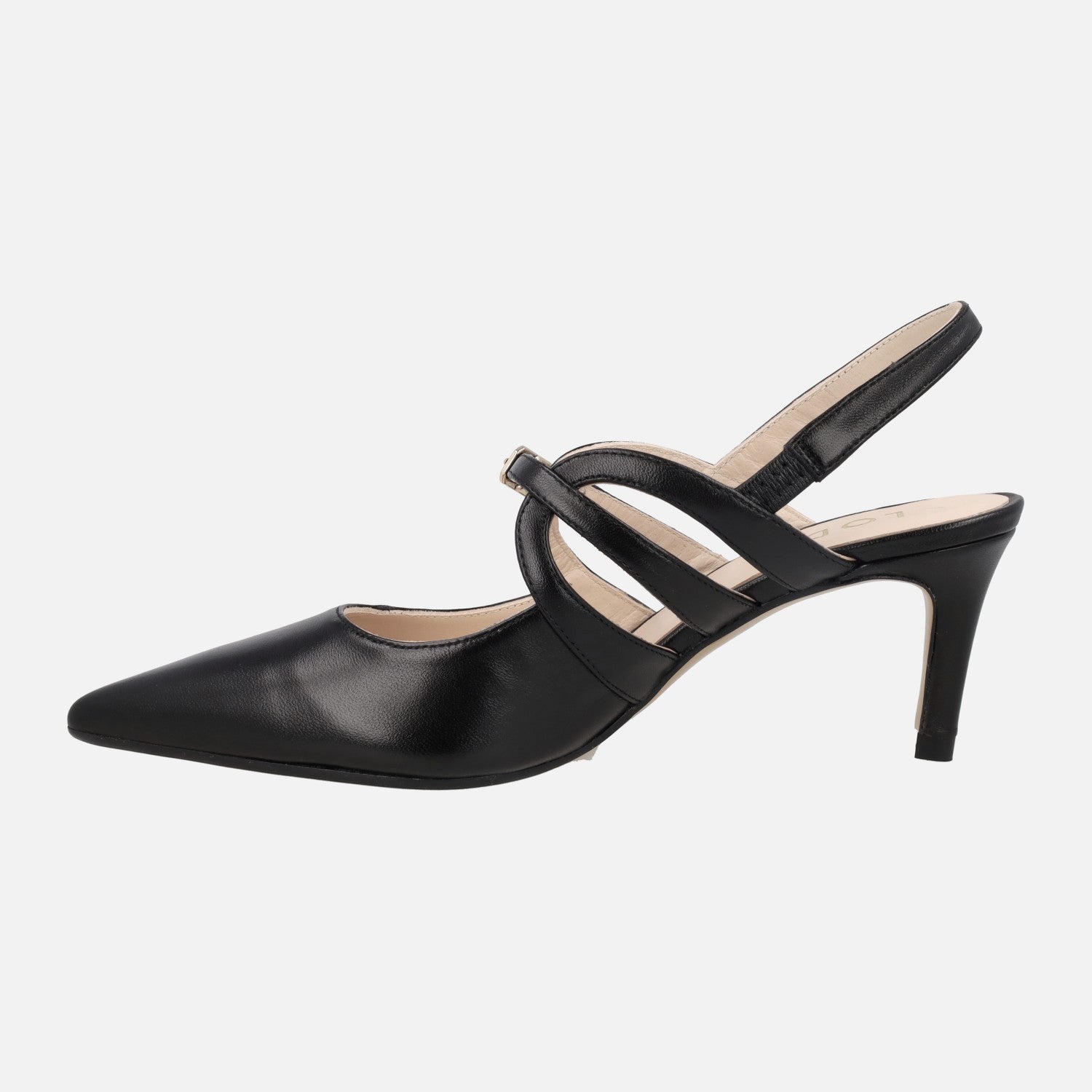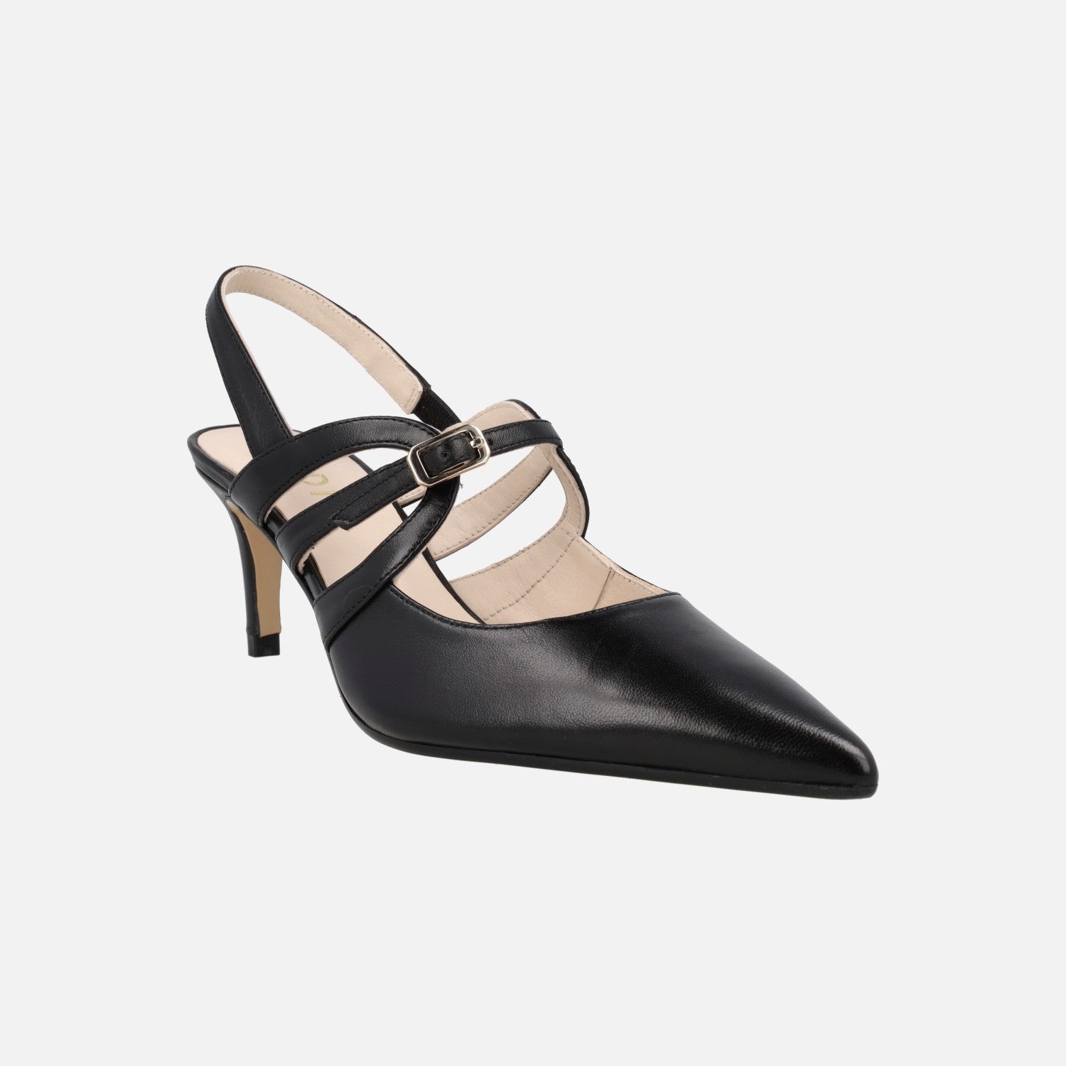 Slingback pumps from the Spanish brand Lodi Natur model, available in black leather or salinas (beige) leather. High-heeled shoes, with a sharp last, made of leather with a strap that crosses the instep and closes with a buckle. Heel strap with elastic piece for better support. Leather-lined interiors, newgel sole. Synthetic outsole with heels of approximately 6.5 cm. Made in Spain.