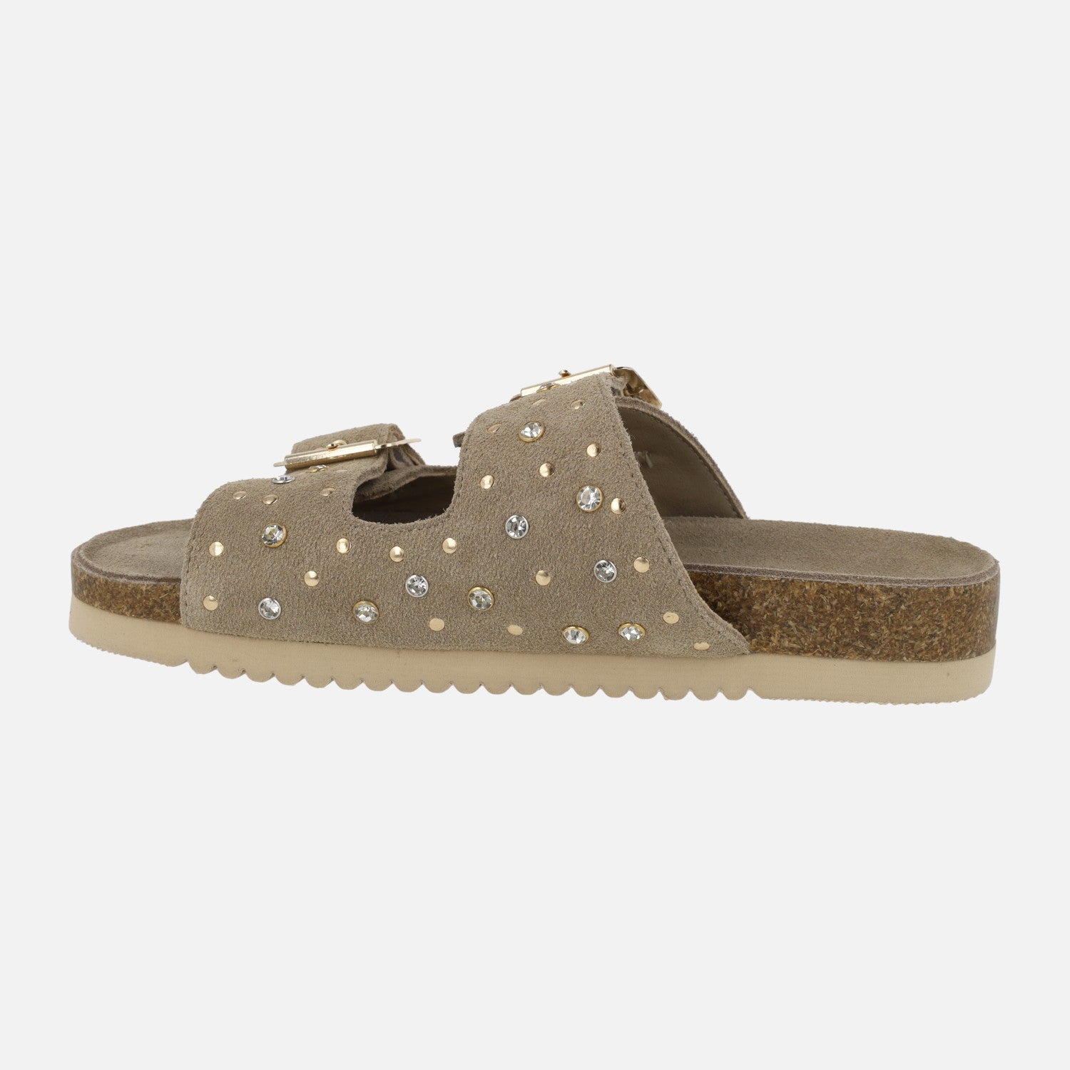 Organic sandals from the Carmela shoes brand, model 163282, available in camel and taupe. Suede leather sandals with appliqué detail, studs and decorative crystals. Two adjustable buckles. Interior in leather and microfiber. Bio cork and synthetic effect outsole, approximately 3 cm high from where the foot rests (the lower sole is slightly U-shaped).
