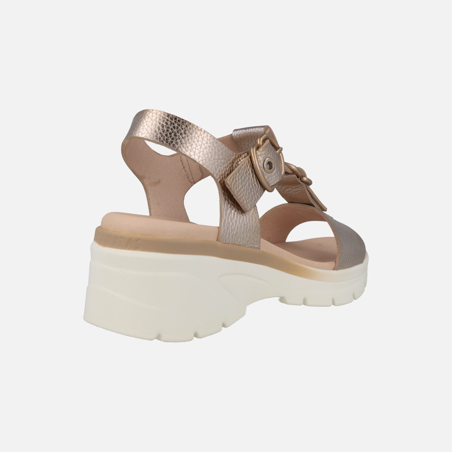 Sandals for women from the Hispanitas brand model HV264799 Cava. Sandals made of gold metallic leather, with gold buckle detail. Interior in breathable microfiber fabric. Synthetic outsole, with a back wedge approximately 7 cm high, with a 2.5 cm front platform.