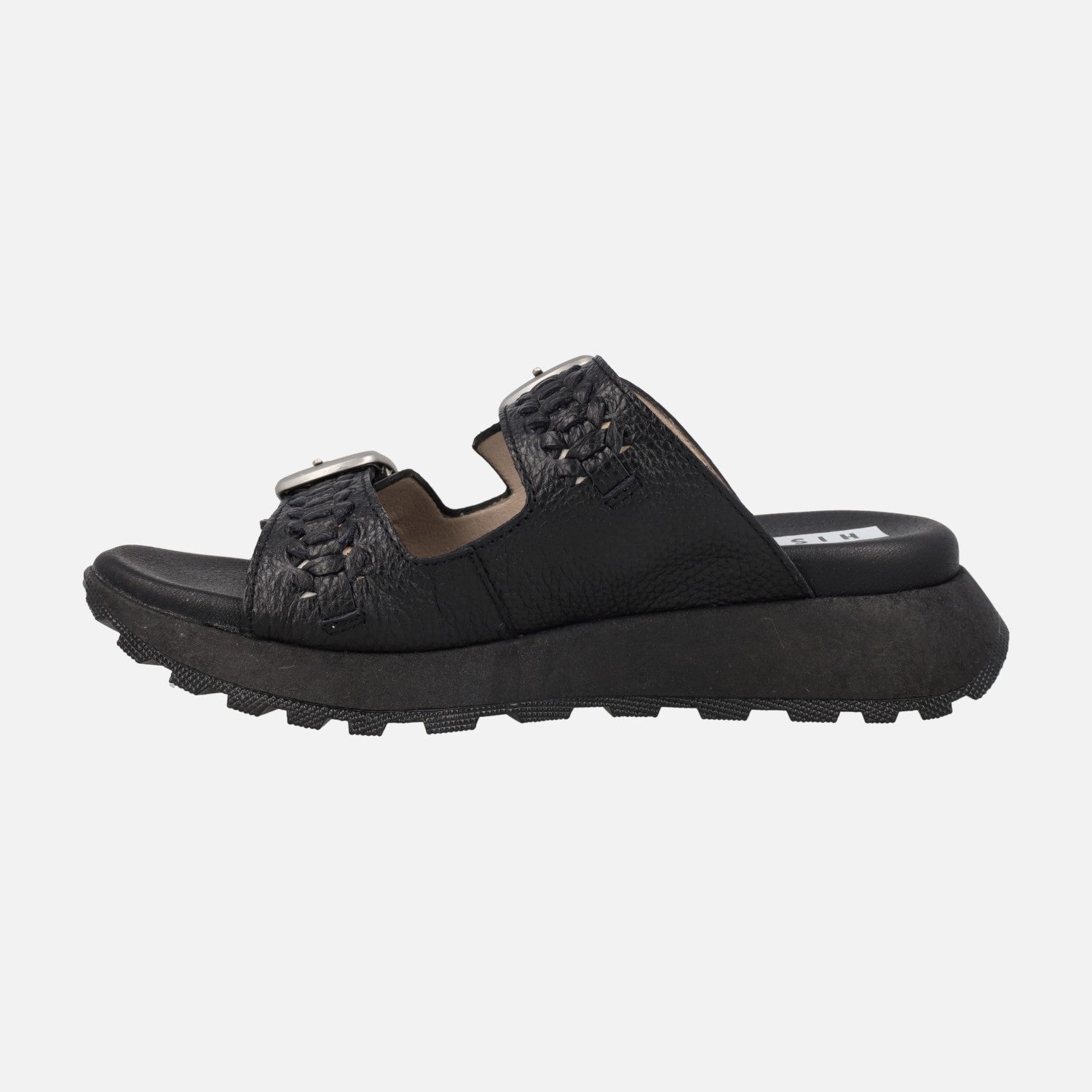 Sports style sandals from the Hispanitas brand, model Ambar HV264783 Black. Black leather sandals with two silver buckles detail. Breathable microfiber interior. Thick rubber outsole, with 5 cm height at the back and 2 cm front platform.
