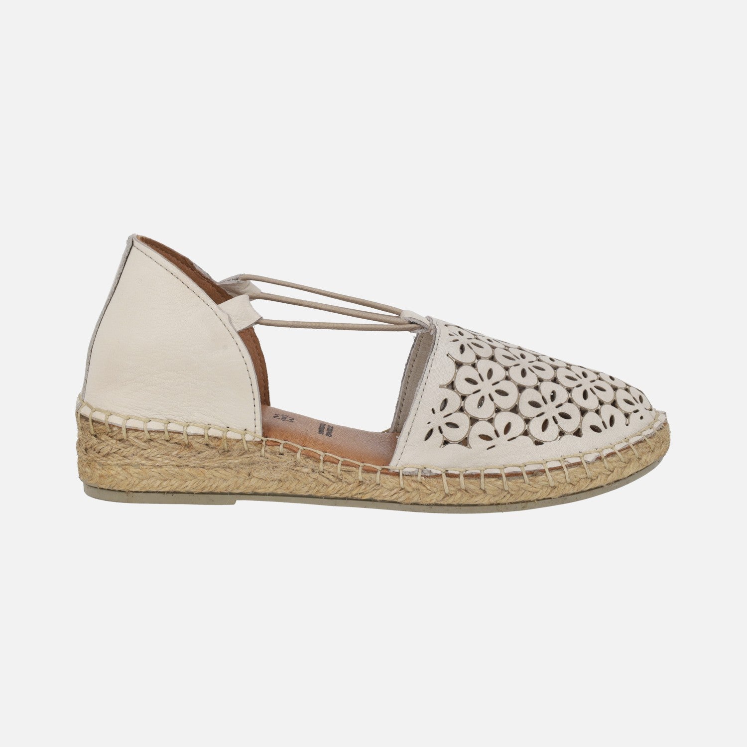 Women's espadrilles from the TOP3 brand, model SR1747, available in off white and camel. Low espadrilles made of leather with die-cut uppers making flowers. Side elastics for better support. Leather interiors. Rubber outsole, natural fiber midsole. Back height approximately 3.5 cm (2 cm at the front).
