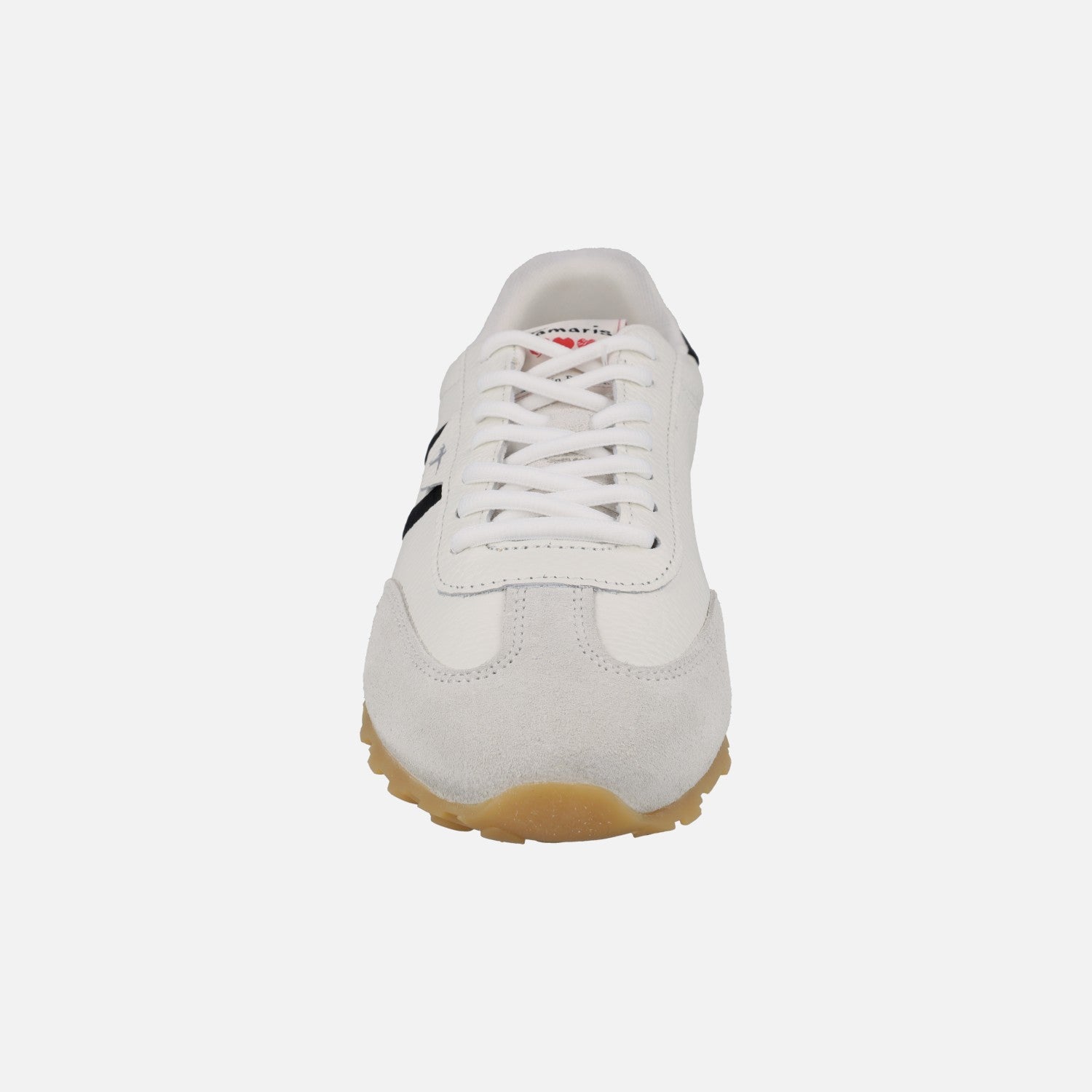 Beautiful sports sneakers new collection from the Tamaris brand model 1-23614-46 125. Low sneakers, made of white leather combined with two fabric stripes in Black. Textile interior with removable insoles. Rubber outsole approximately 1.5 cm back height. Lace closure.