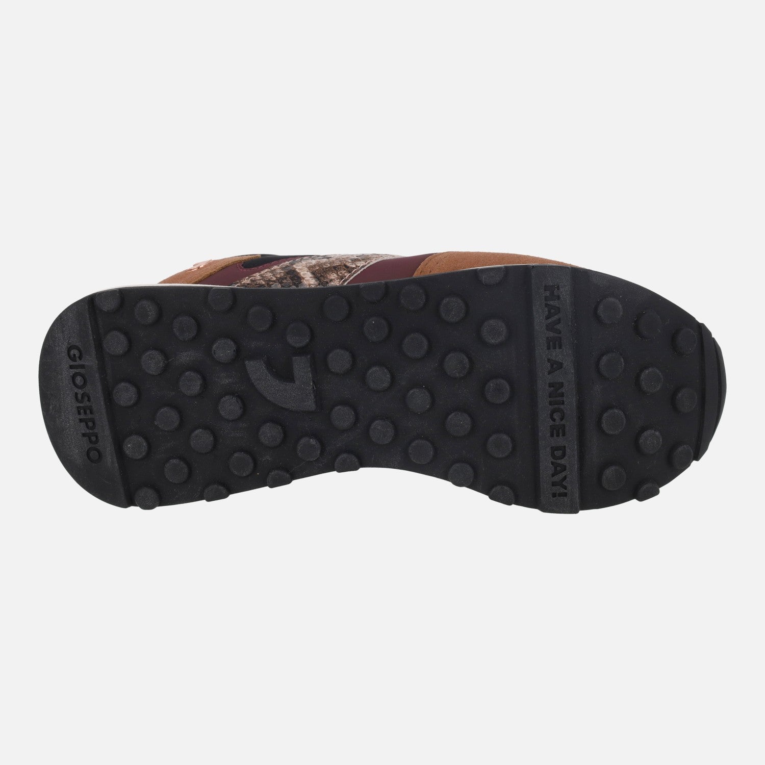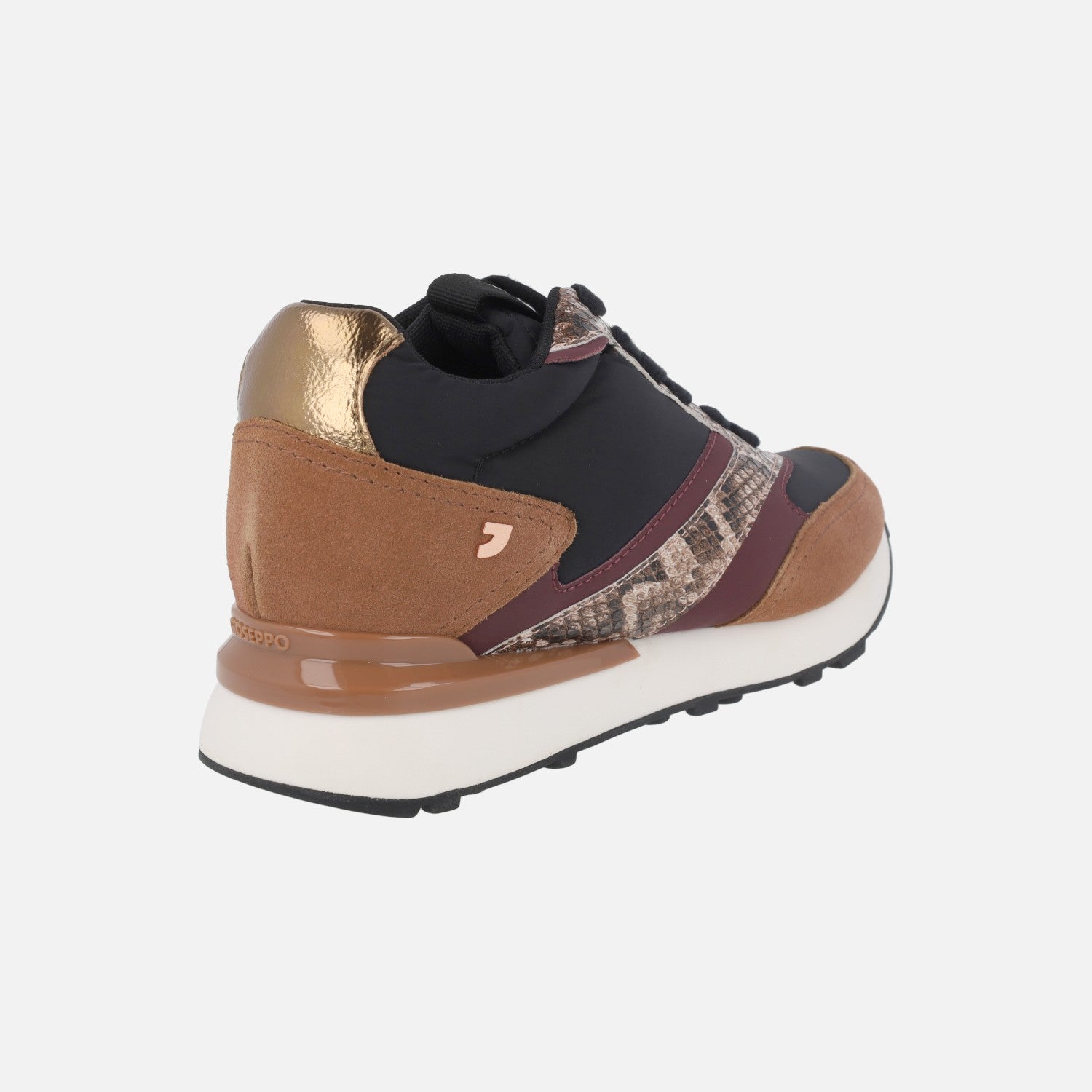 Women's sneakers from the new GIOSEPPO collection model 76490-P Black Hemlock. Sneakers with inner wedge, made in leather combined with fabric and synthetics, in brown combined, Black, Bordeaux and snake print. Closing with textile laces. Textile interior. Eva and TPR outsole, with a total back height of 6 cm counting the inner wedge (3 cm) and 2 cm in the front.
