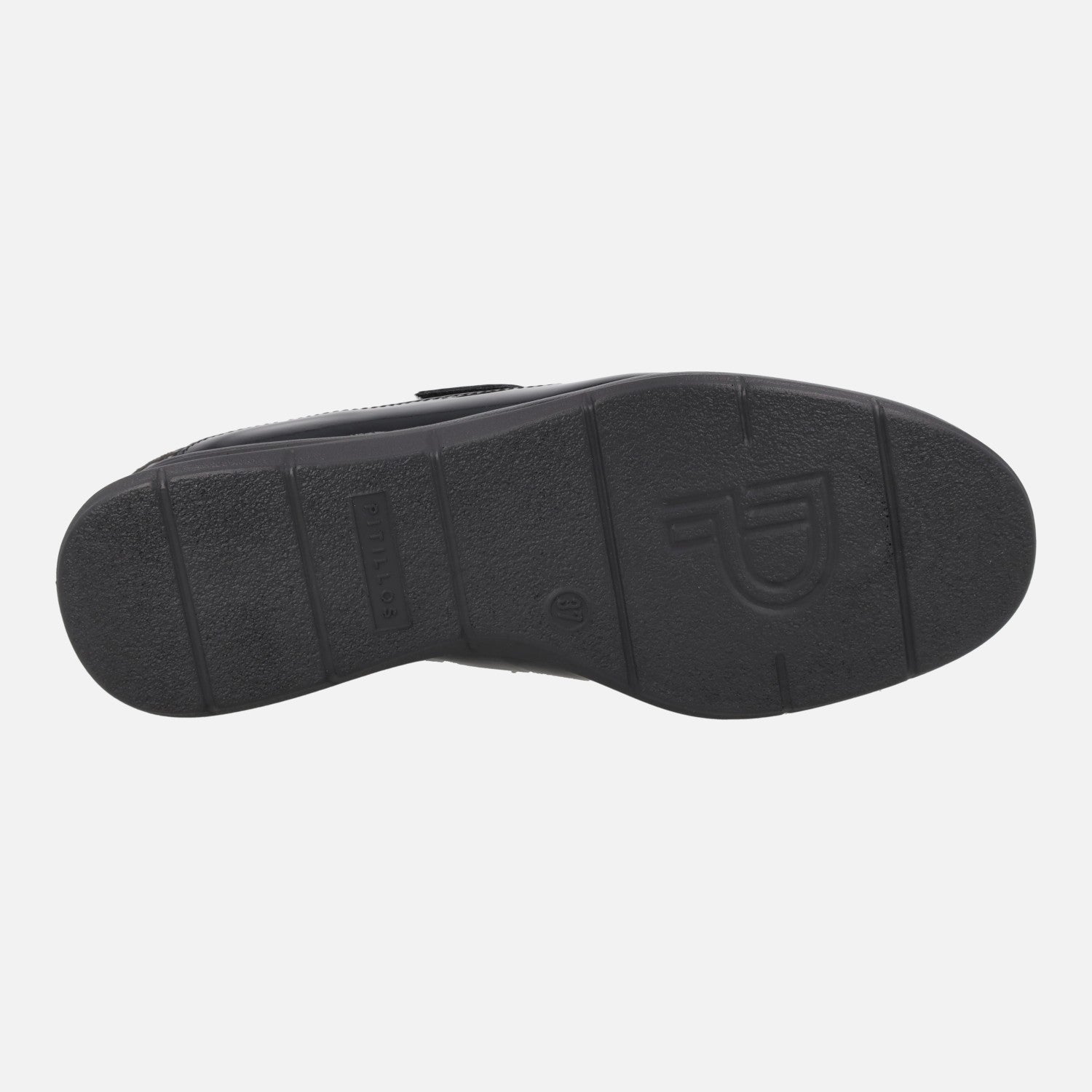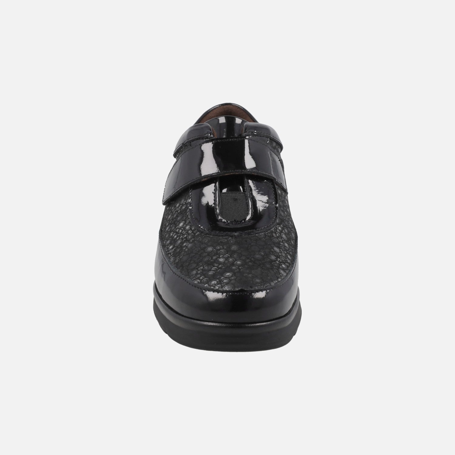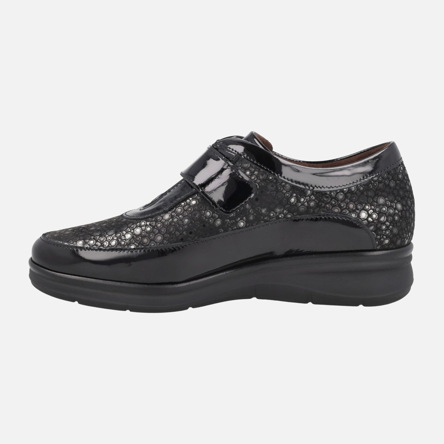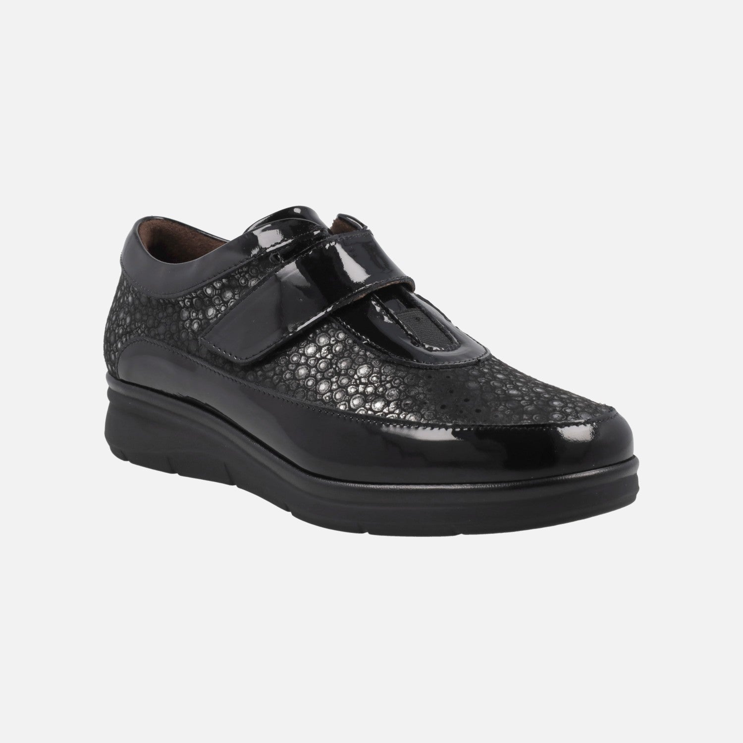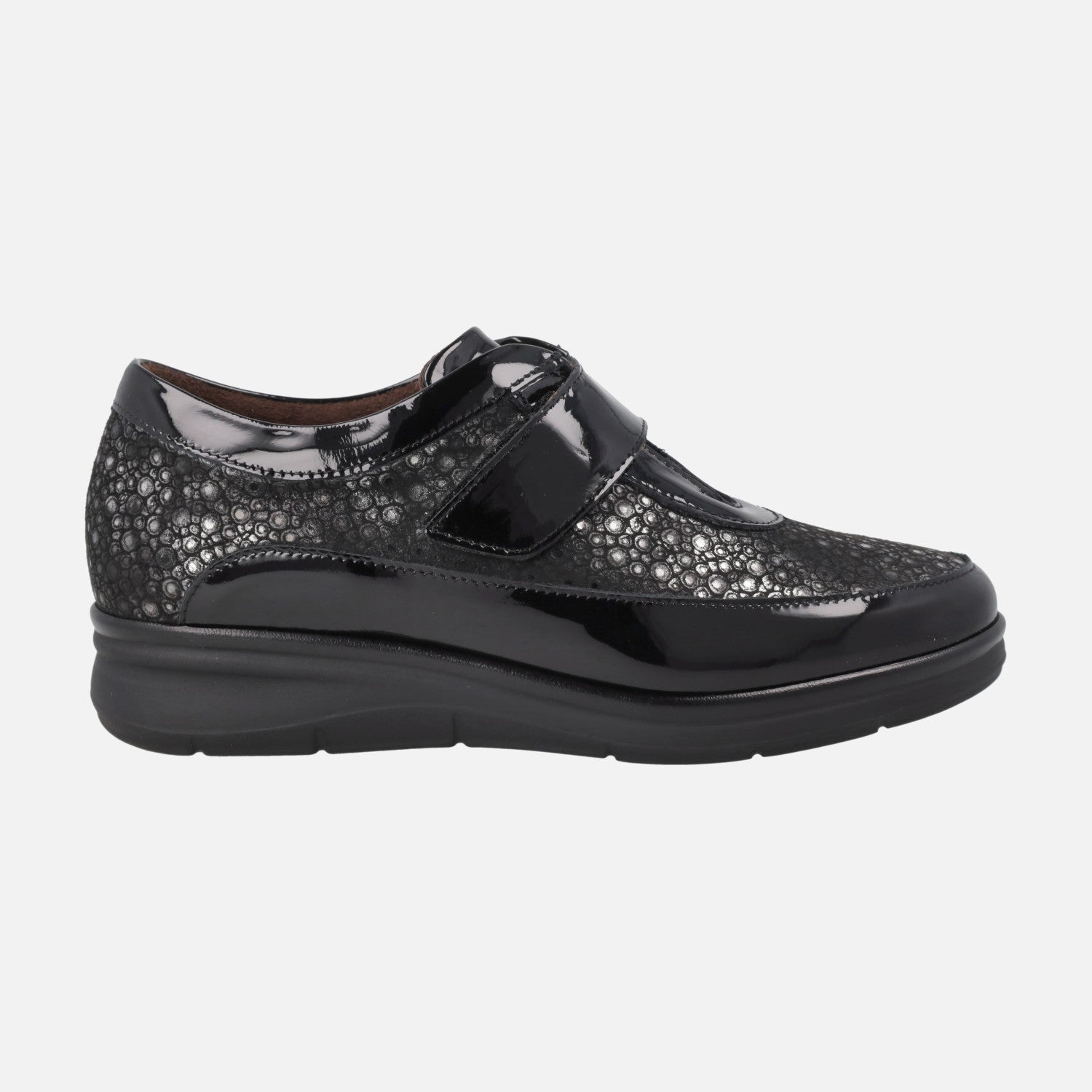 Women's sports shoes model 10703 from the Pitillos brand. They are made of Patent Leather Black combined with printed lycra and have a velcro closure. The interior is made of fabric. The insole is removable and made of fabric. The floor is synthetic, with 3.5 cm height at the back. Fabricados en España.