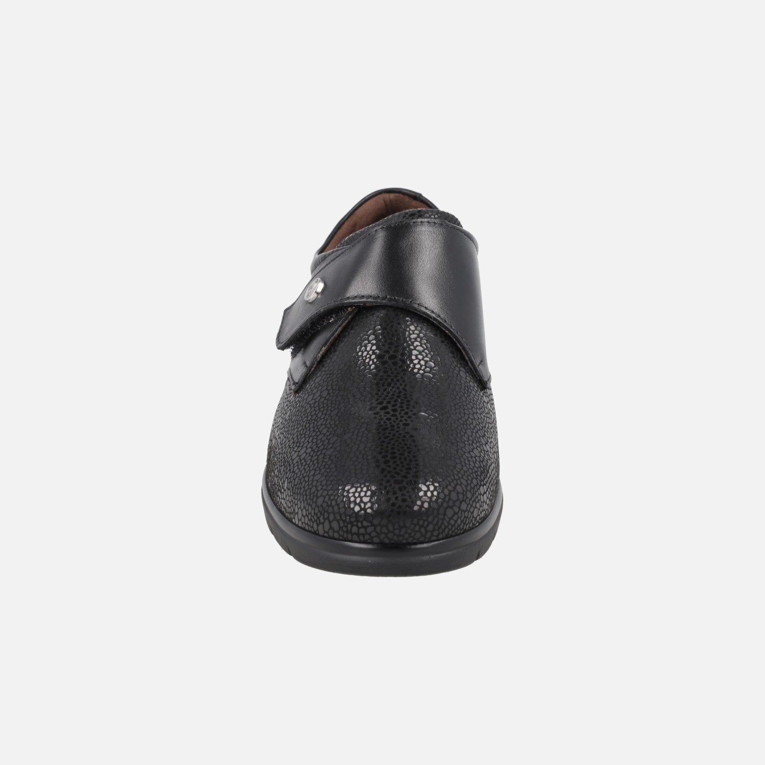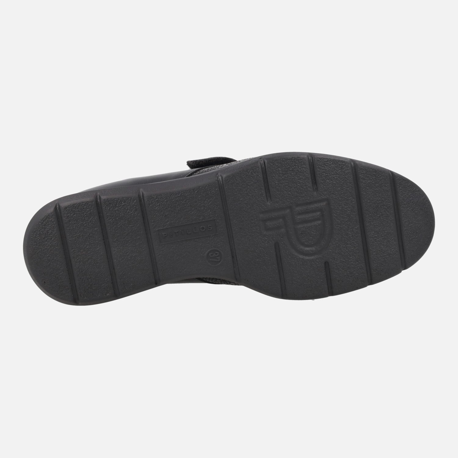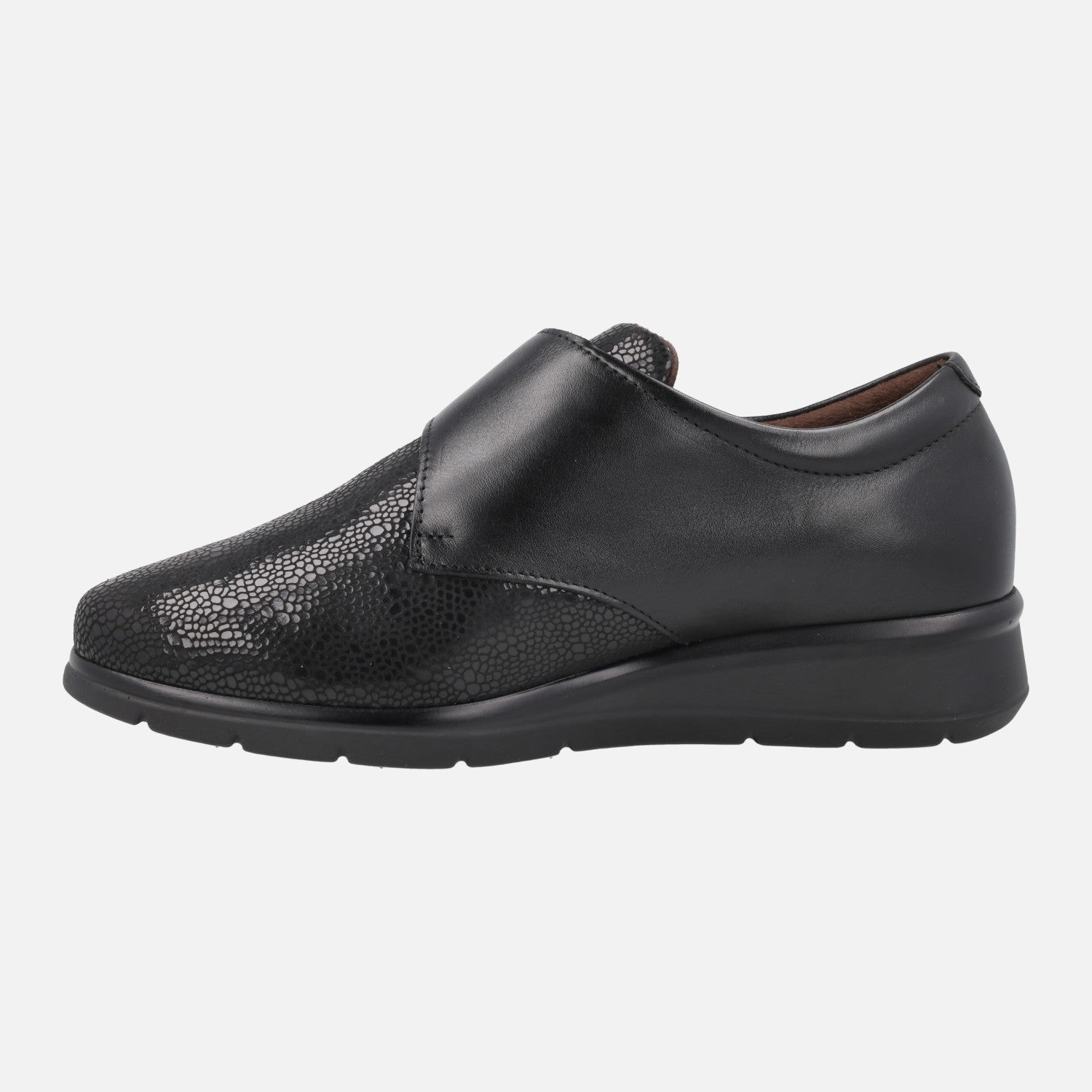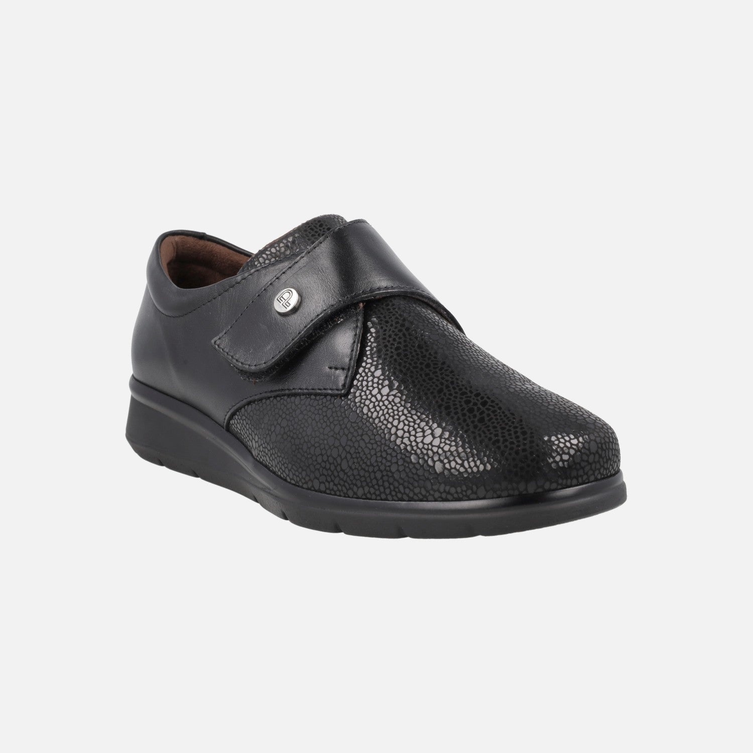 Women's shoes made of black leather and engraved lycra, with velcro closure. Model 10710 from the Pitillos brand. Fabric interior and removable fabric insole. Synthetic wedge sole, with 3.5 cm at the back and 1 cm at the front.