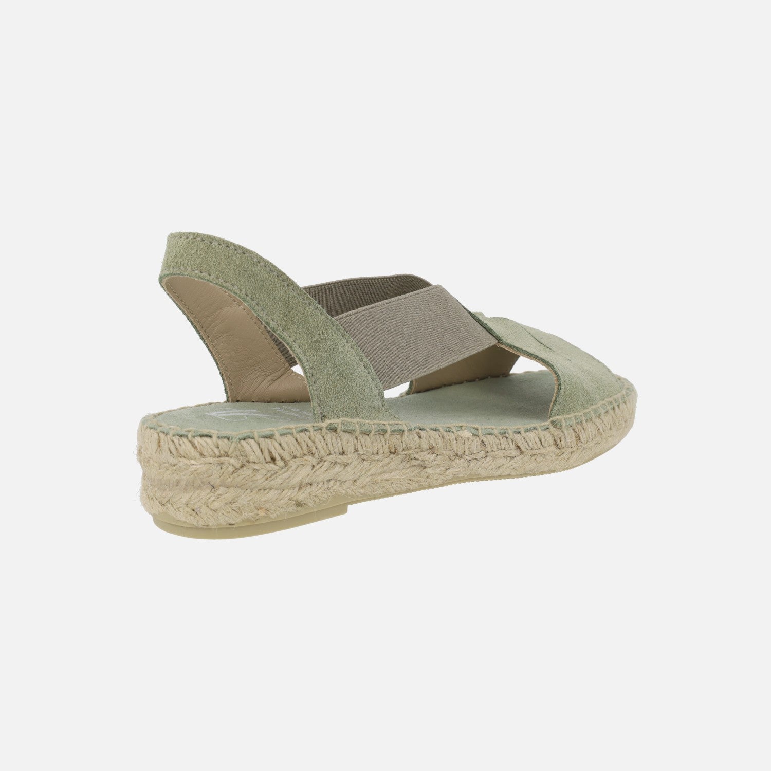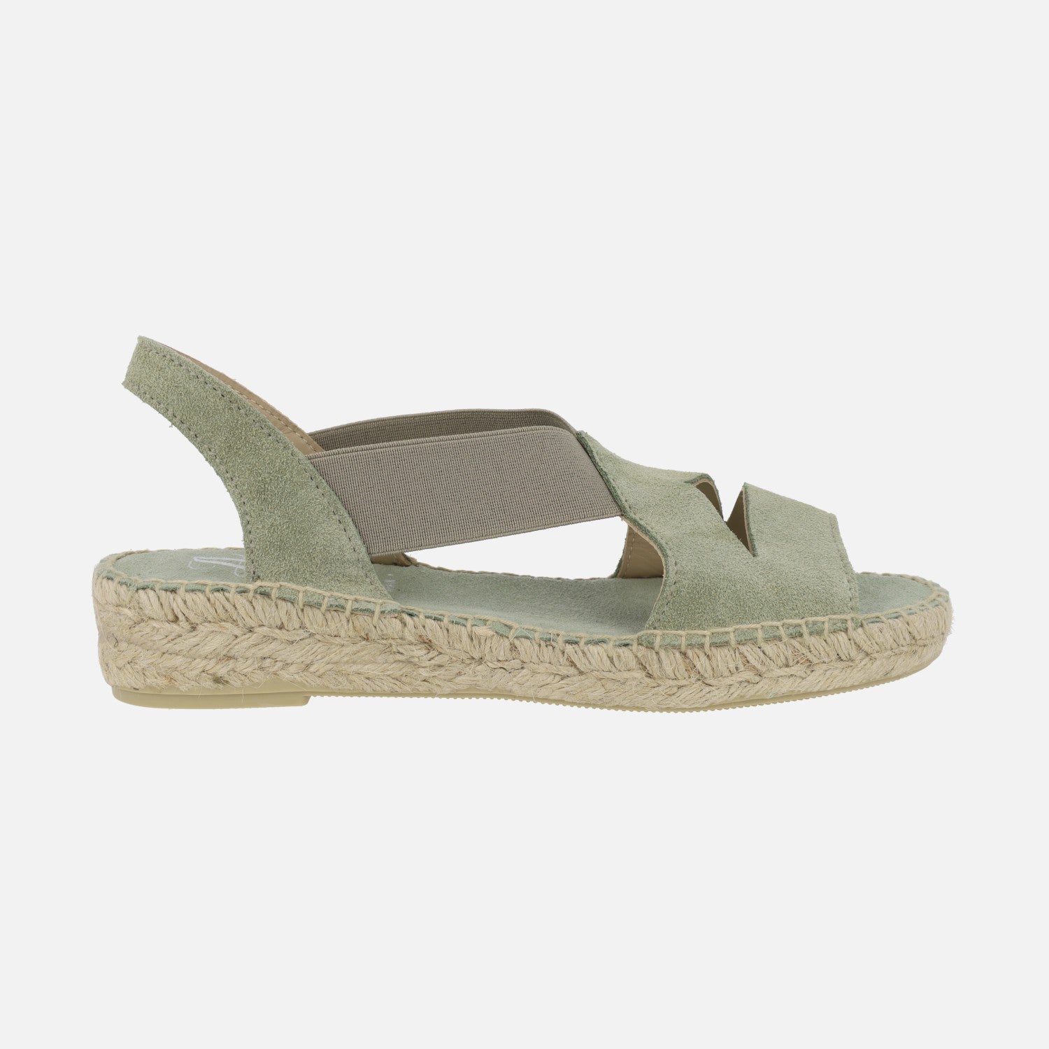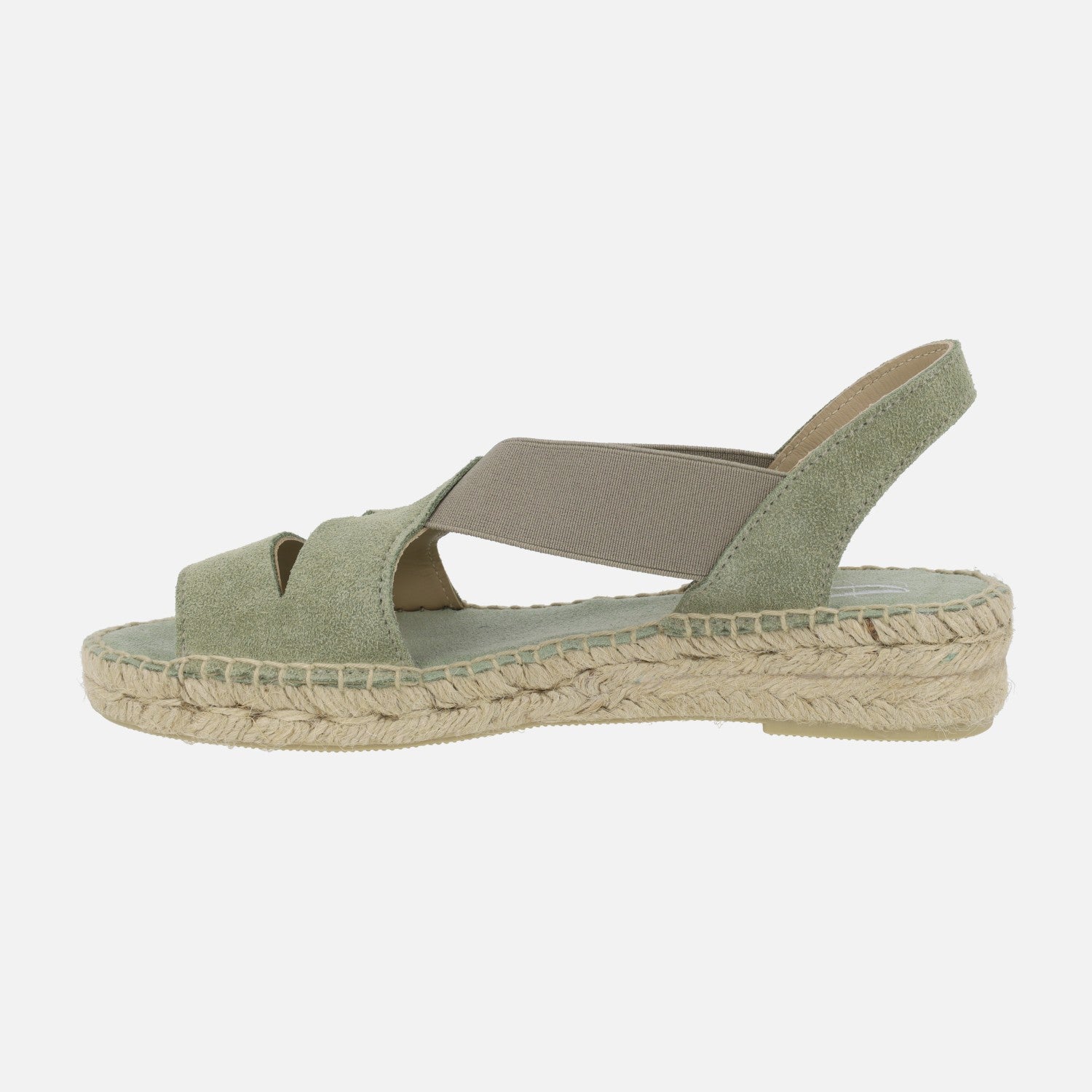 Alpargatas de esparto para mujer de la marca española Juncal Aguirre modelo 2714, disponibles en avellana (beige ) y rosmari (verde kaki). Zapatillas elaboradas en piel serraje con elásticos laterales para una óptima sujeción al pie. Interior mixto de piel y tejido. Cuñas bajas de esparto natural, con una altura trasera de 3,5 cms (2 cms parte delantera). Made in Spain.