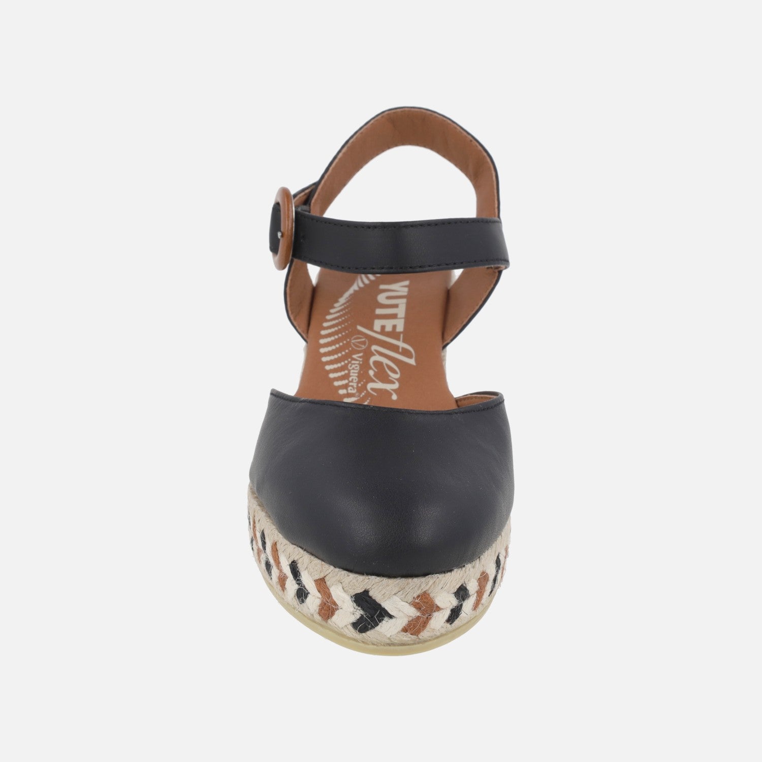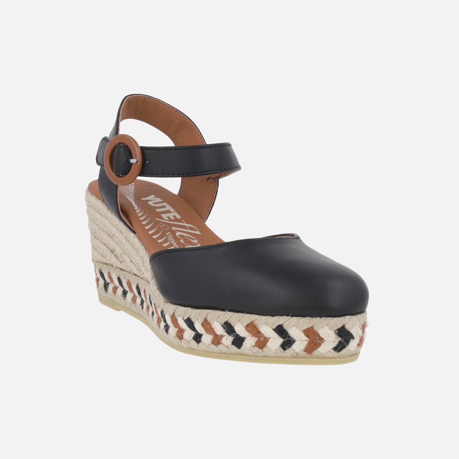 Alpargatas estilo valencianas de la marca española Viguera, modelo 2316 elaboradas en piel seda negra o cuero. Zapatillas de esparto de piel, con puntera cerrada y abiertas de talón. Pulsera al tobillo con hebilla ajustable. Interior textil. Cuña de esparto con cenefa en la parte baja. Altura de cuña aproximadamente 8,5 cm (2,5 cm de plataforma delantera). Suela Yuteflex, muy cómoda, ligera y flexible. Made in Spain.