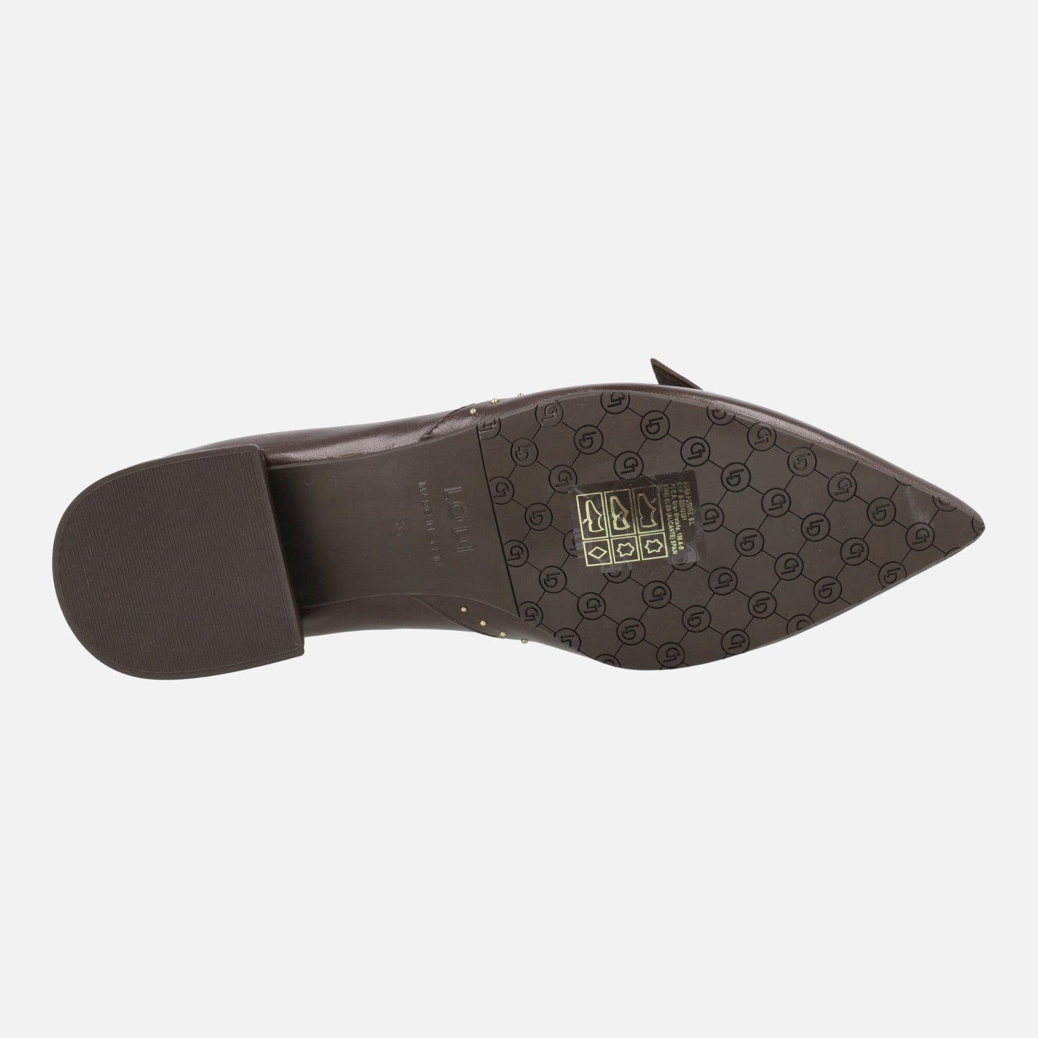 Bailarinas marrones de piel de la marca Lodi, modelo Amistad en soft testa. Bailarinas escotadas por los laterales, con adorno de lazo y pequeñas tachas metálicas doradas. Elaboradas en piel marrón chocolate. Puntera afilada. Interiores forrados de piel. Planta new gel. Suela sintética, con tacones anchos de 3 cm de altura. Fabricadas en España.