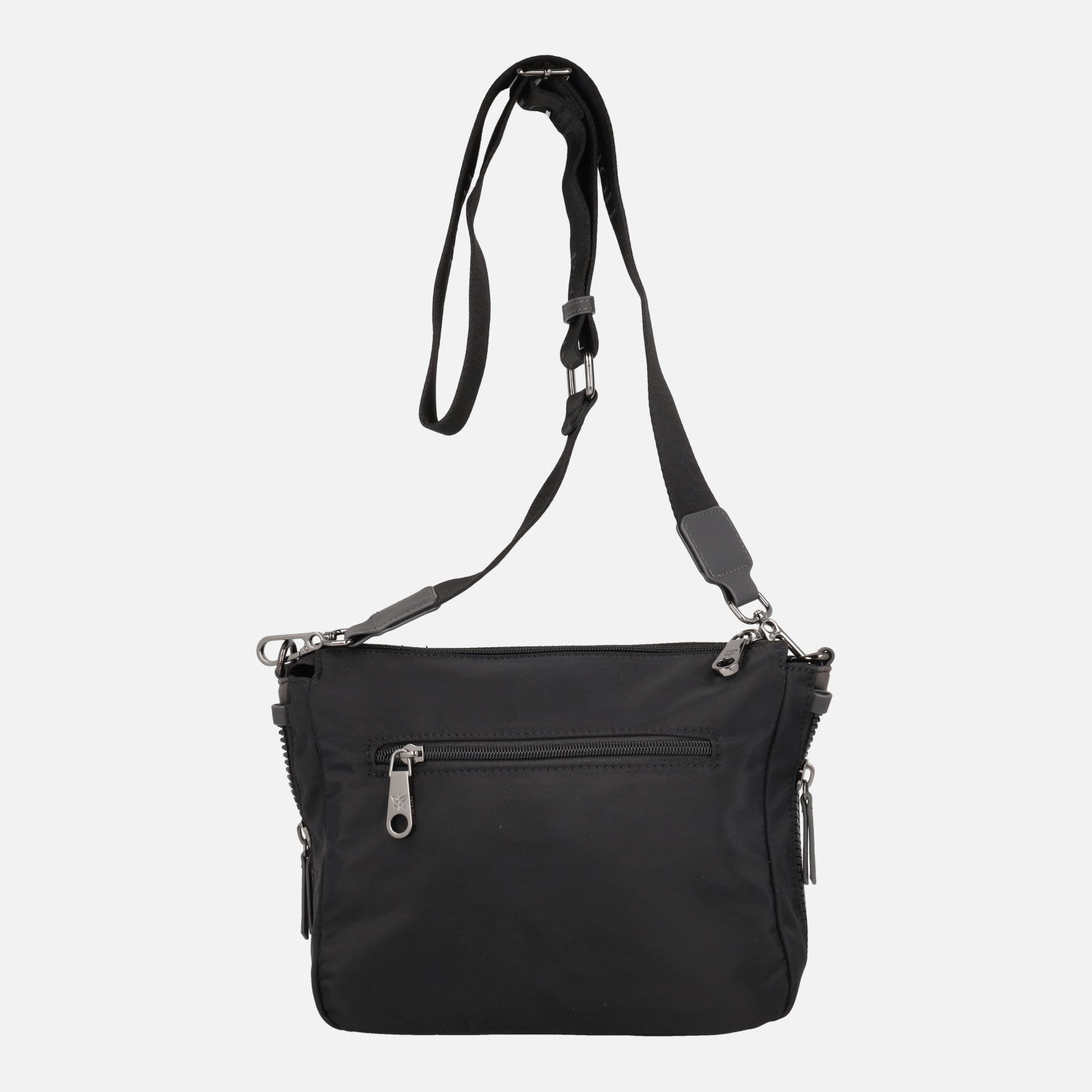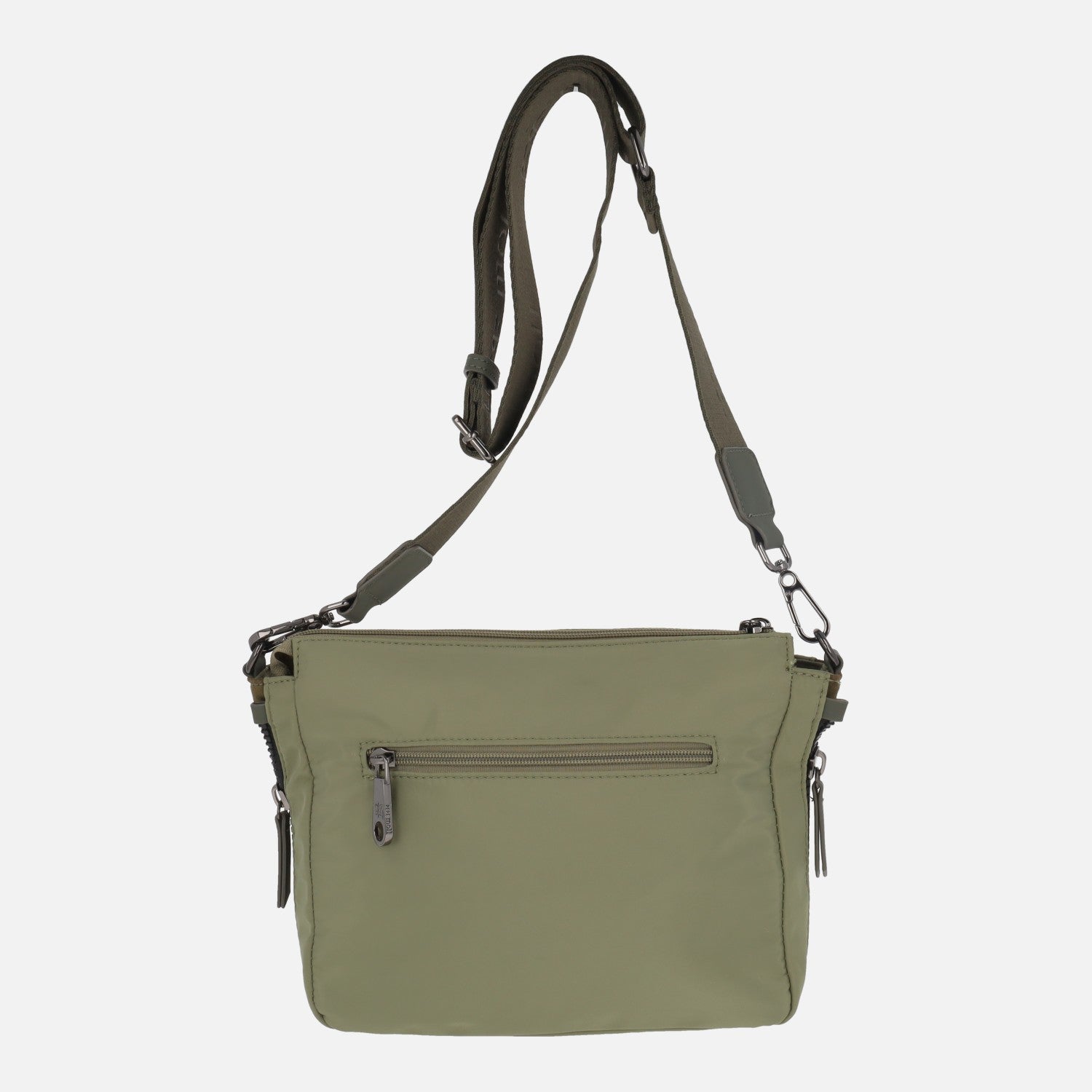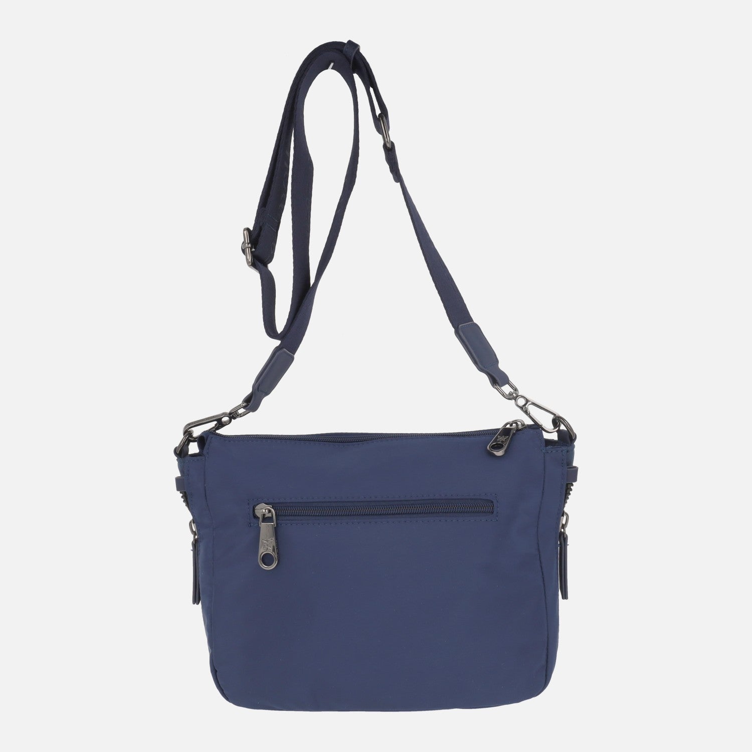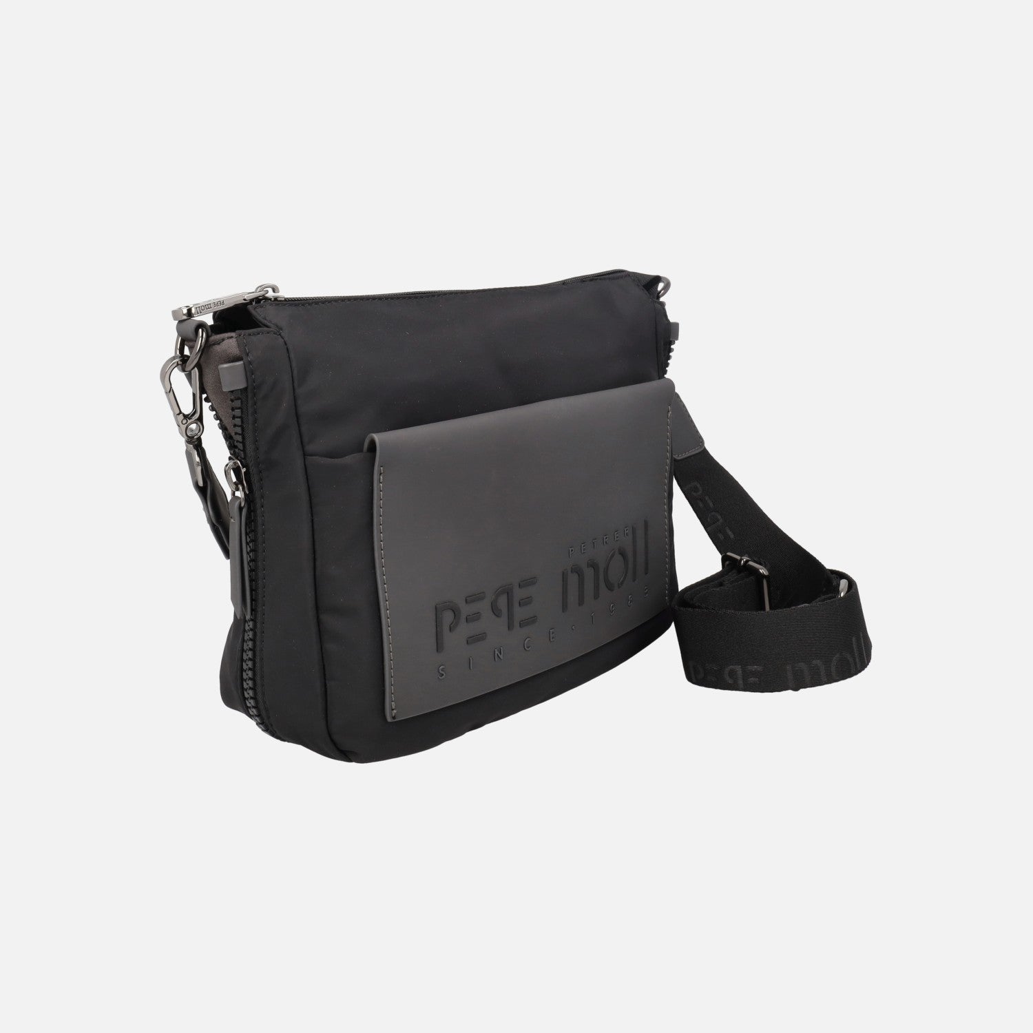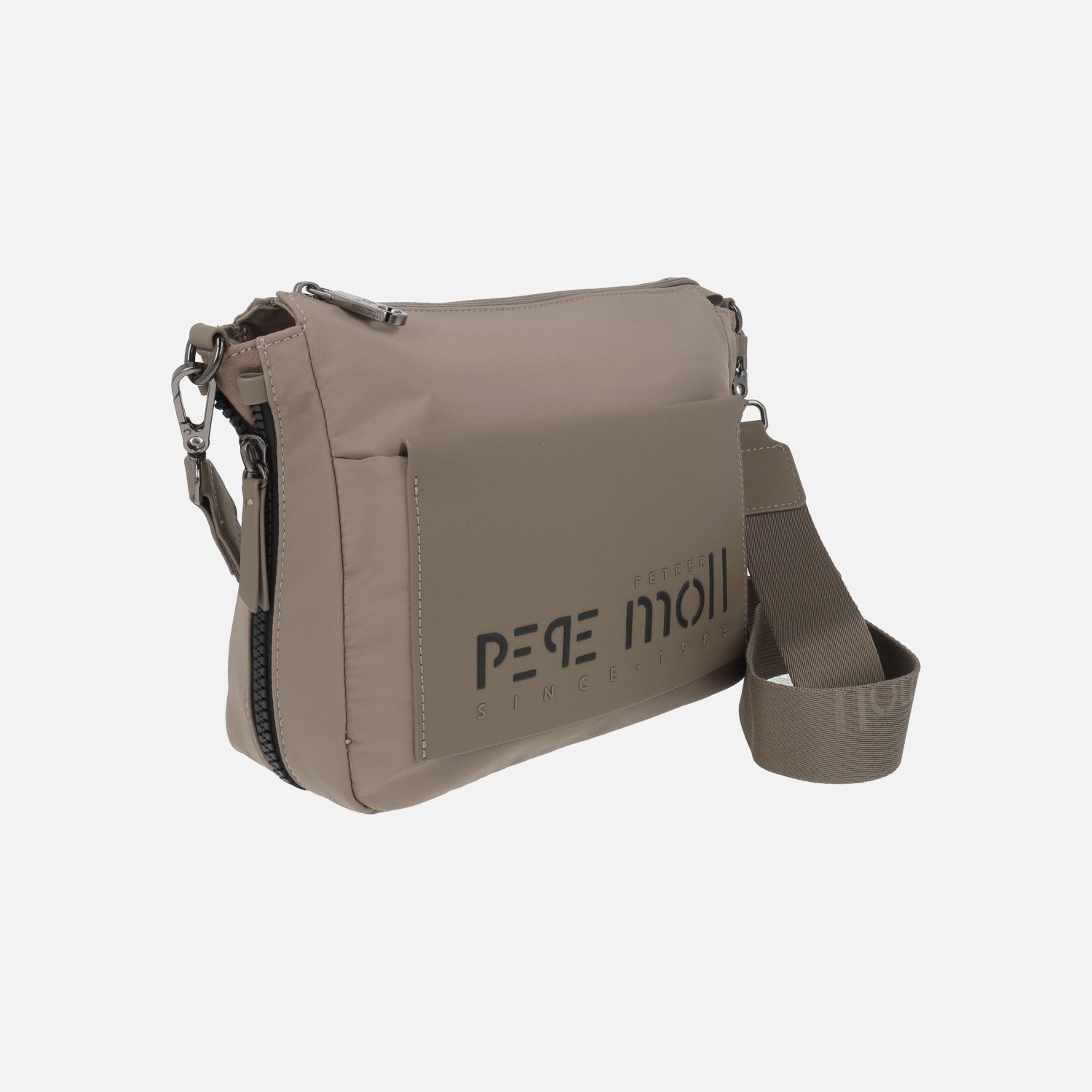 Bolsos bandolera Pepe moll modelo 252362, disponibles en combinado azul, negro, taupe o verde oliva. Bandoleras elaboradas en poliéster (95%) y poliuretano (5%). Bolsillo delantero con cierre de broche imantado.  Bolsillo trasero y compartimento principal, ambos con cierre de cremallera.  Cremalleras en los laterales para variar el volumen. Interior textil con bolsillos. Asa extraíble y ajustable para bandolera. Medidas: 20 cm de alto x 26 cm de ancho x 9 cm de fondo.