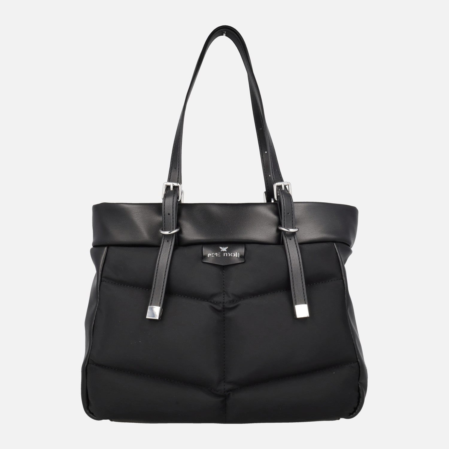 Bolsos Pepe moll modelo 252100 Leonor black. Bolso para hombro elaborado en materiales textiles y sintéticos, en color negro, con efecto acolchado. Bolsillo trasero y compartimento principal con cierre de cremallera. Interior textil con bolsillos. Dos asas regulables para hombro. Medidas: 25 cm de alto x 34 cm de ancho inferior x 33 cm de ancho superior x 14 cm de fondo.