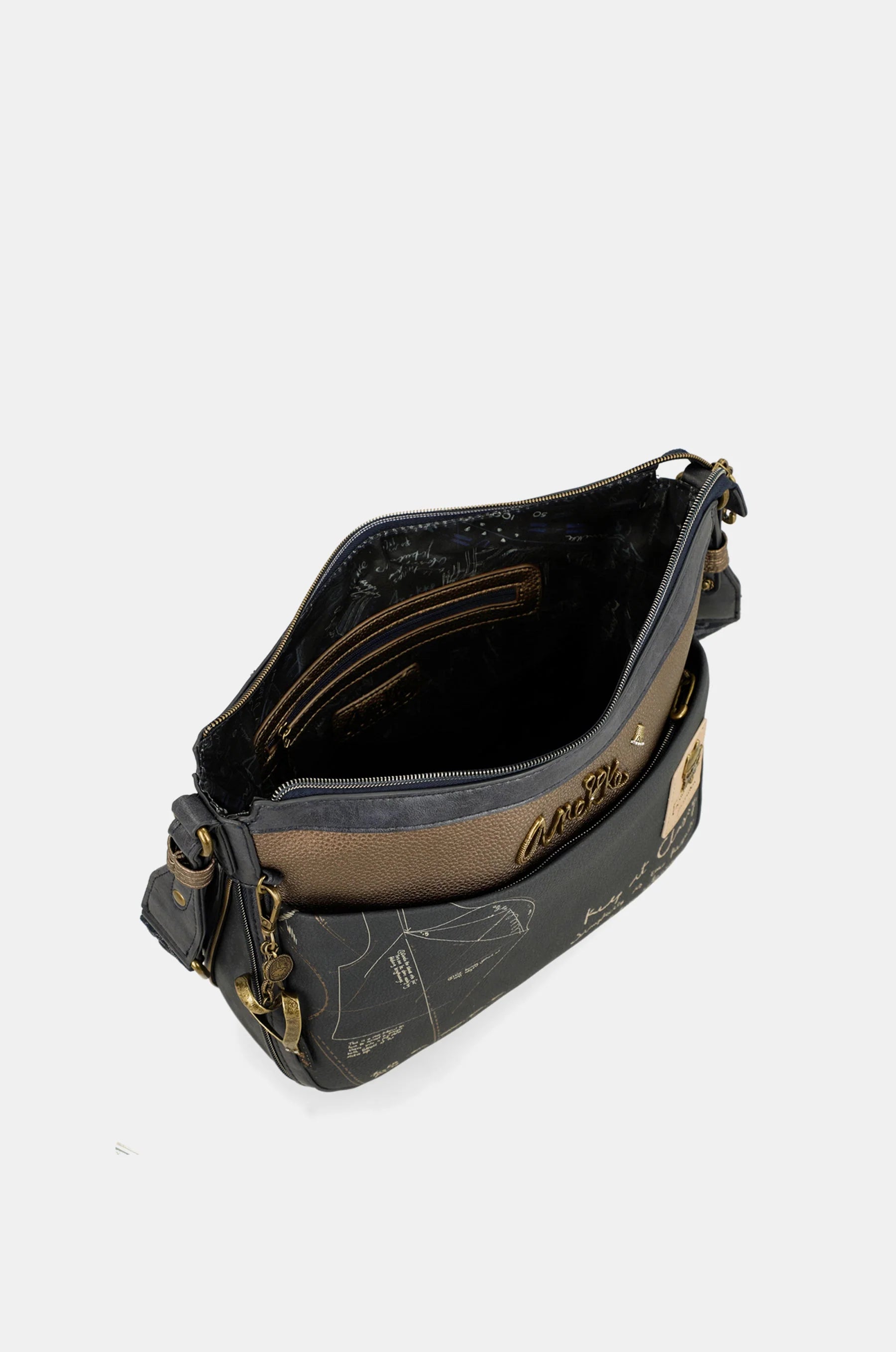 Bolsos bandolera de la marca Anekke modelo Boutique 41853-138. Bolsos bandolera en combinado azul y taupe metalizado, elaborados en materiales sintéticos. Cierre principal con cremallera. Bolsillos delantero y trasero con cremallera. Adorno de llavero. Interior textil con bolsillos. Asa bandolera ajustable de 62 cm como máximo al hombro. Cremallera en la parte inferior del bolso para darle más cabida. Medidas: 25 cm de alto x 34 cm de ancho superior x 29 cm de ancho inferior x 13 cm de fondo (con cremallera abierta, si está cerrada serían 4 cm).