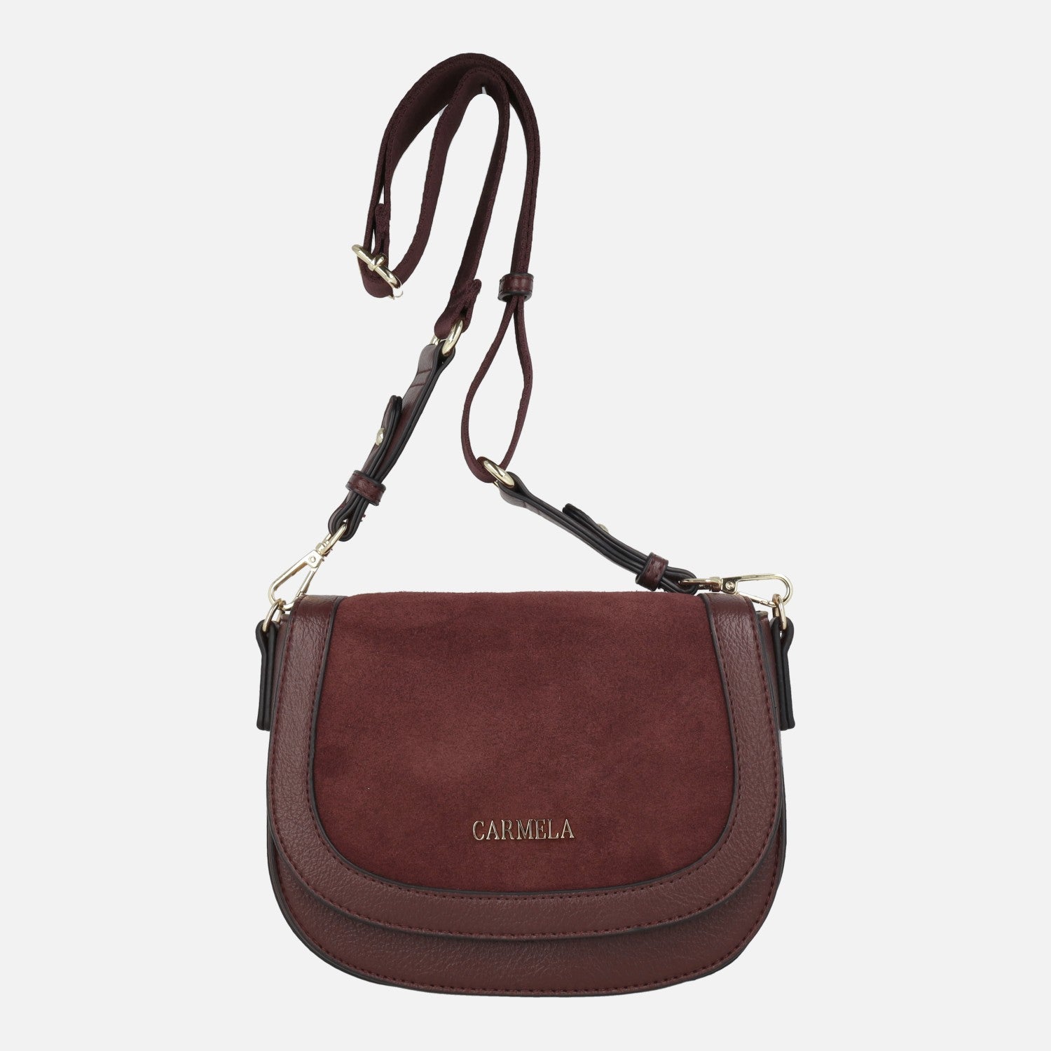 Bolsos bandolera para mujer de la marca Carmela, modelo 186177, disponibles en camel, burdeos, verde kaki y negro. Bolsos elaborados en combinado de piel y sintéticos, con cierre de tapa con broche imantado. Cierre de cremallera central. Interior textil con bolsillos. Asa bandolera ajustable con hebilla. Medidas: 17 cm de alto x 21,5 cm de ancho x 9 cm de fondo.