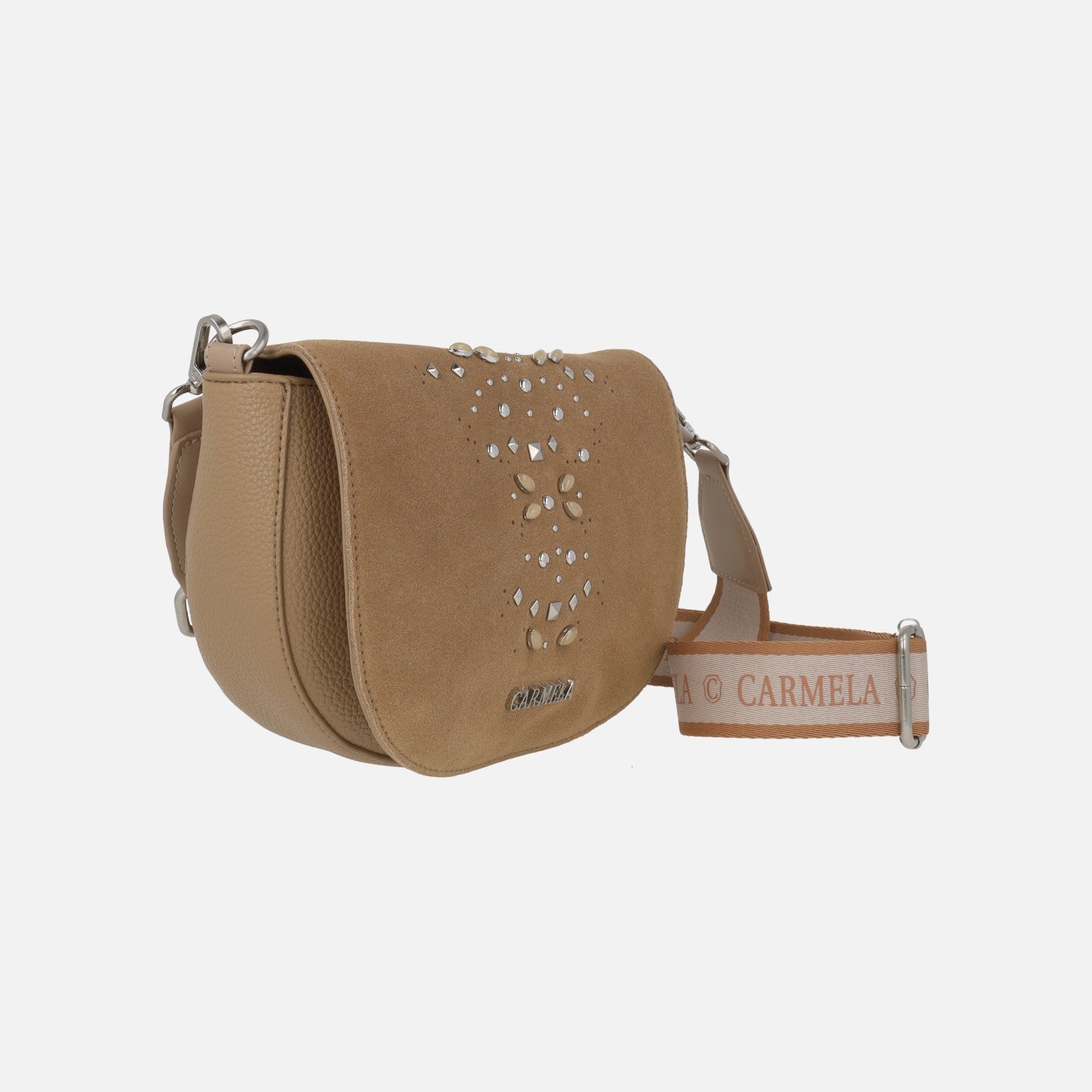 Preciosos bolsos estilo bandolera de la marca Carmela shoes, modelo 186207. Bolsos con tapa elaborada en serraje camel y parte trasera en combinado de serraje y sintéticos imitando piel. Detalle de piedras y tachas en la tapa, así como logo metálico Carmela. Cierre de broche imantado y cremallera central. Interior textil con un bolsillo con cremallera. Asa bandolera ajustable con hebilla. Medidas aproximadas: 16 cm de alto x 22 cm de ancho x 5,5 cm de fondo.