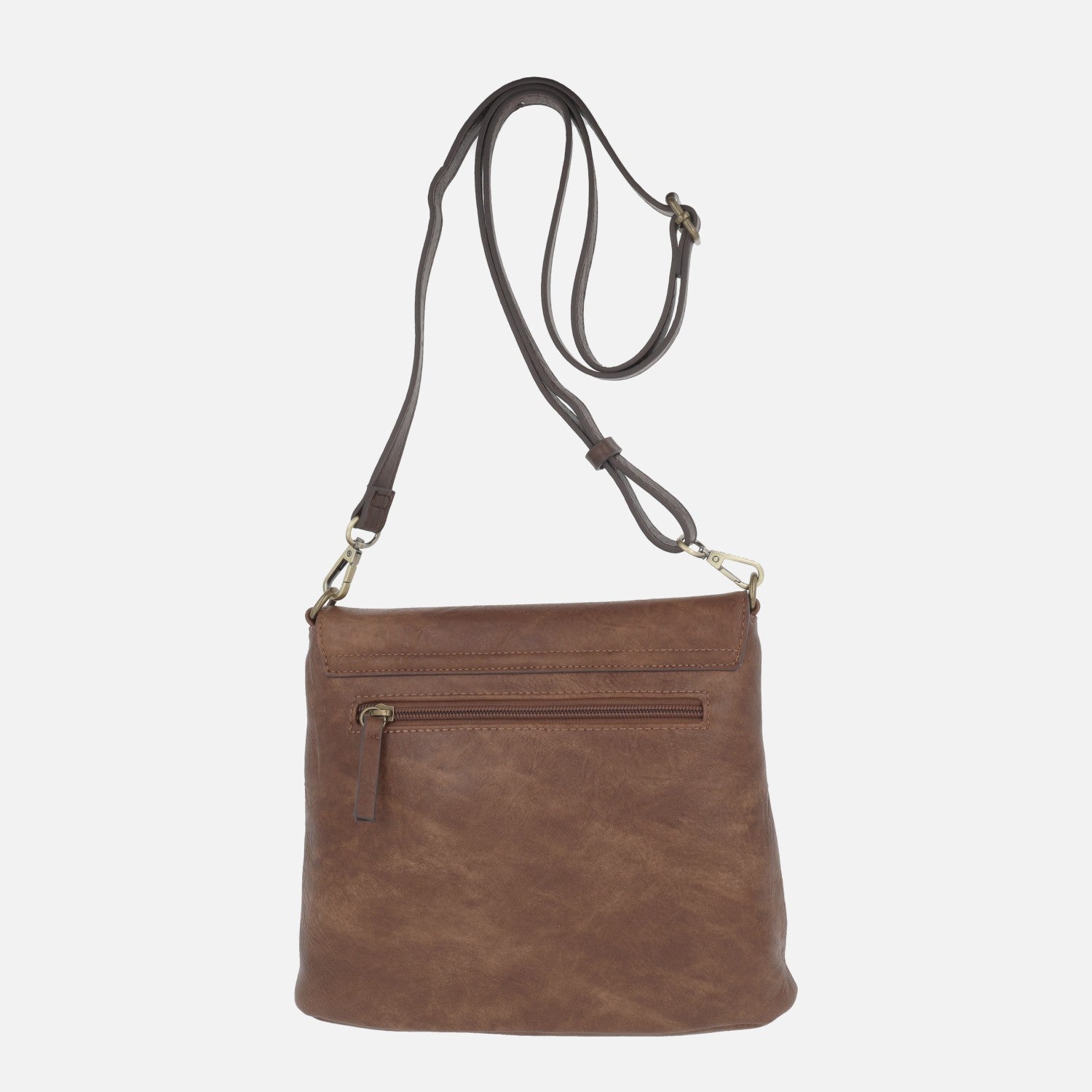 Bolsos bandolera Matties modelo 20972 Verota. Bolsos elaborados en polipiel (sintéticos) en color marrón cuero, con tapa y hebilla (broche imantado). Detalle de tachas metálicas. Bolsillo trasero con cremallera. Interior textil, cierre de cremallera central. Asa bandolera ajustable. Medidas: 23 cm de alto x 28 cm de ancho x 7 cm de fondo.