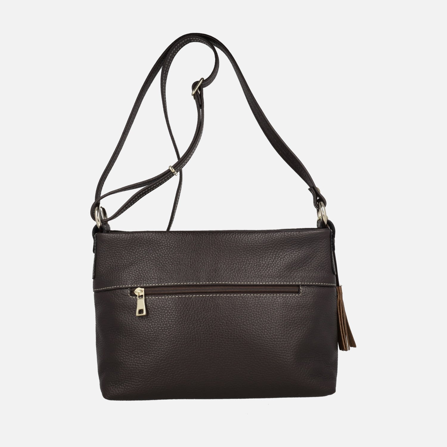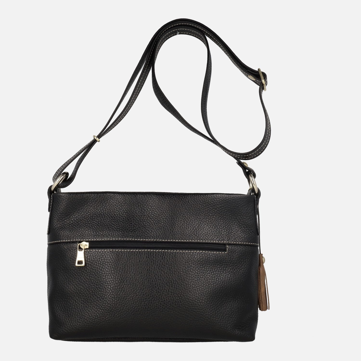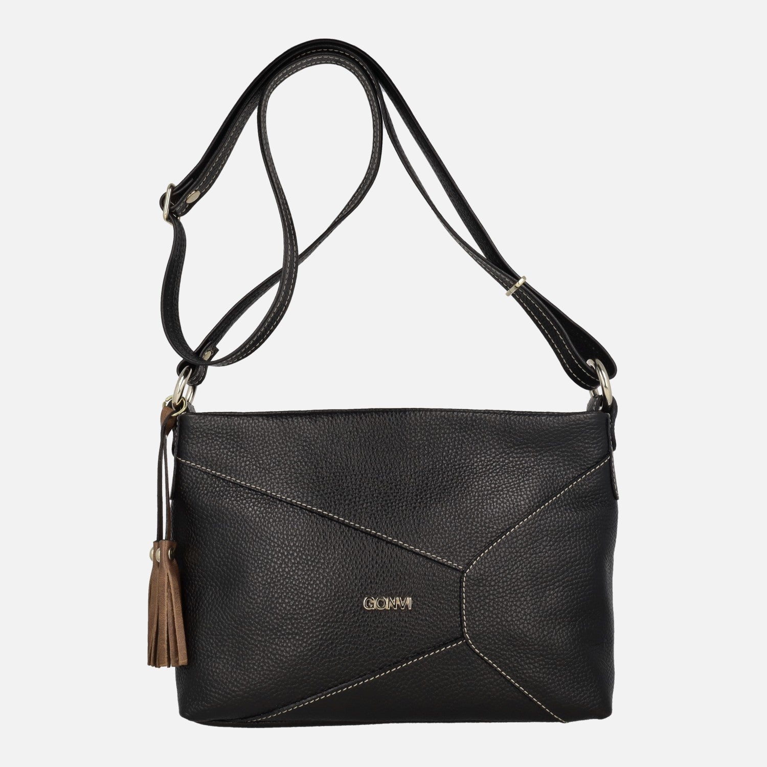 Preciosos bolsos estilo bandolera de la marca Gonvi, modelo 301, disponibles en azul marino, marrón chocolate y negro. Bolsos de piel con detalle de pespuntes en la parte delantera y adorno de borlas en marrón cuero en el lateral. Cierre principal de cremallera. Bolsillo trasero con cremallera. Asa bandolera regulable. Interior textil con bolsillos. Logo metálico GONVI en la parte delantera. El asa tiene un máximo de 70 cm. Medidas: 20 cm de alto x 26 cm de ancho inferior x 28 cm de ancho superior x 10 cm de fondo.