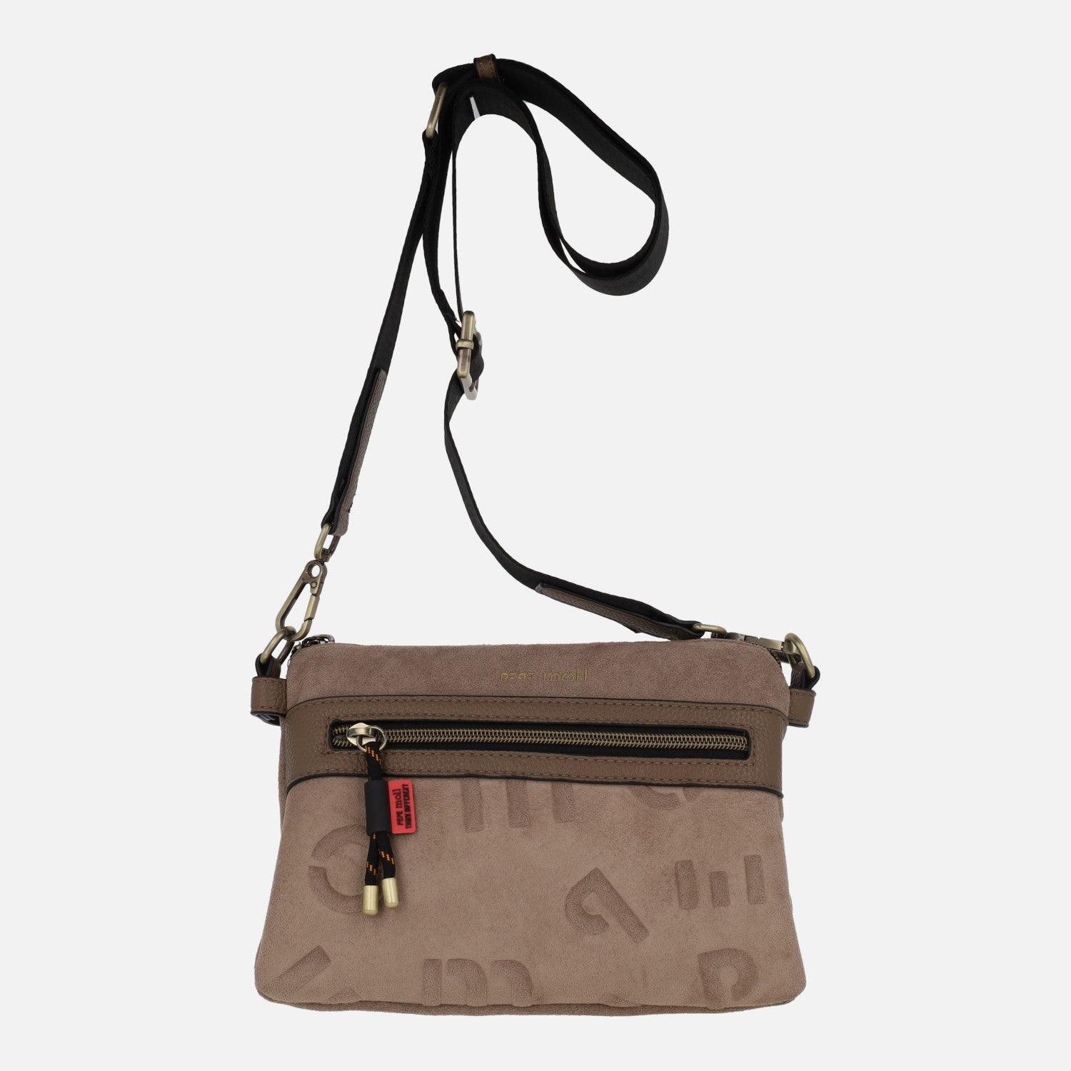 Bolsos bandolera de la marca Pepe moll, modelo 252344 Taupe. Bolsos con exterior 80% poliéster 20% poliuretano, en color taupe. Compartimento principal con cierre de cremallera, al igual que los bolsillos delantero y trasero. Letras en relieve en la parte delantera. Interior textil con tres compartimentos diferenciados, forrados en tejido y con bolsillos interiores. Asa extraíble y ajustable para llevar de bandolera. Medidas: 17 cm de alto x 23 cm de ancho x 8 cm de fondo.