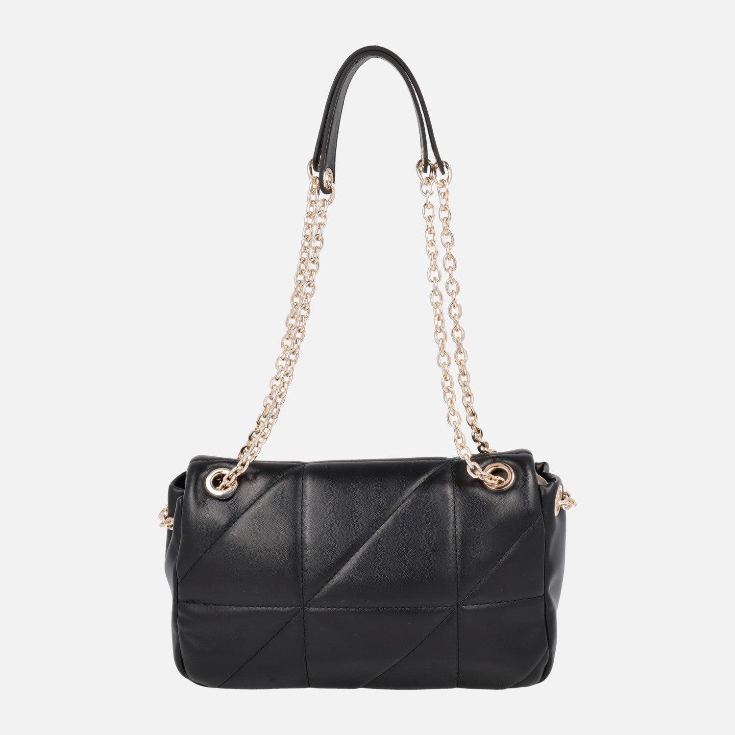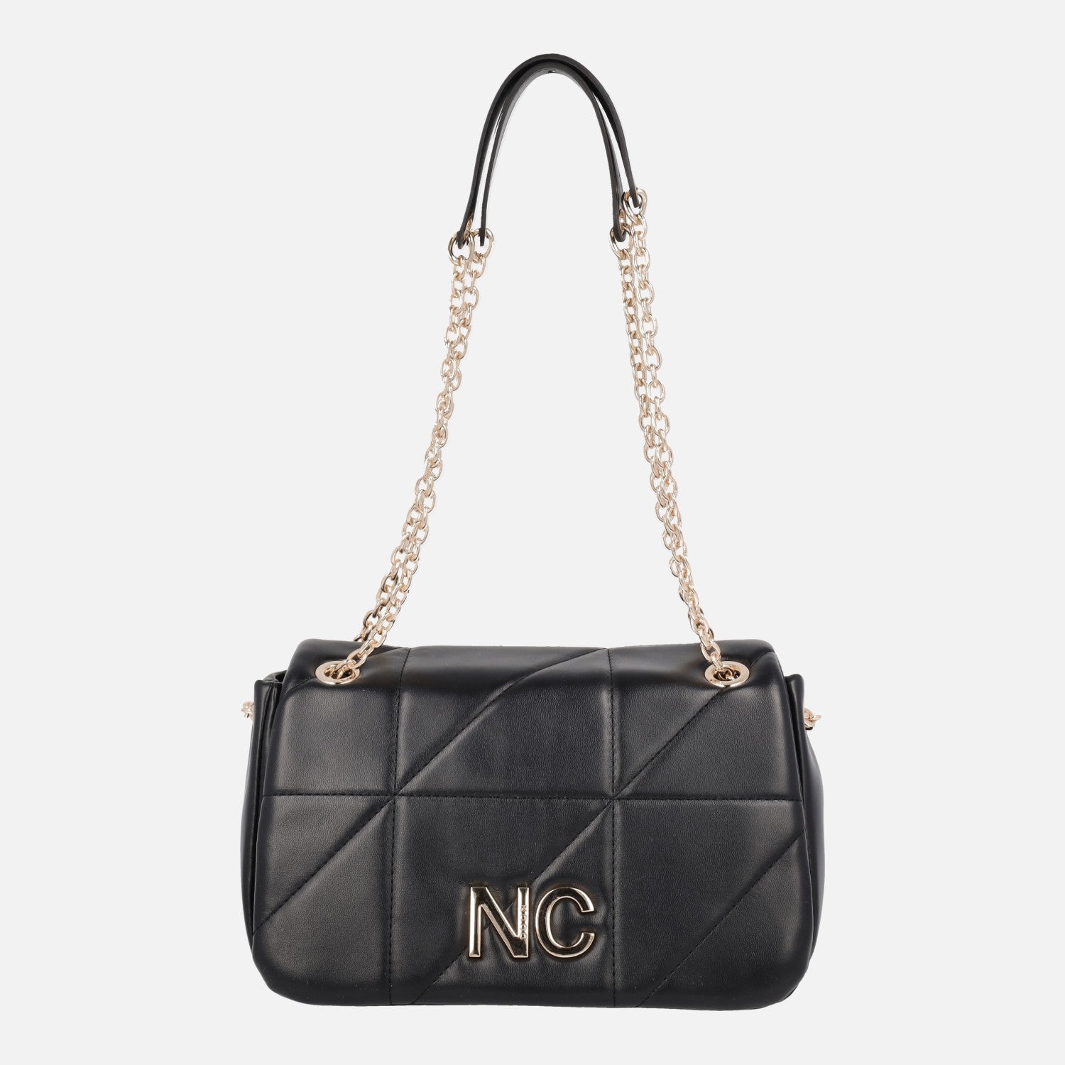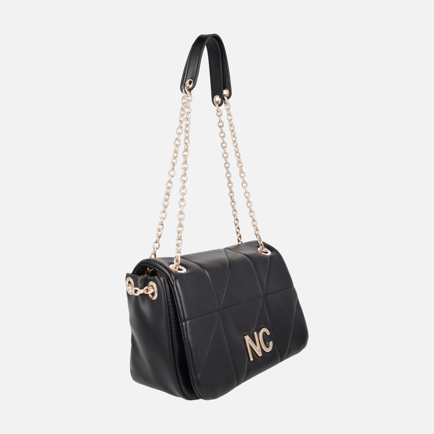 Bolsos Noco modelo 252564N Negro. Bolsos elaborados en materiales sintéticos, en negro, efecto piel acolchada. Llevan dos asas formadas por cadena dorada y pieza sintética, pudiendo tirar de una para hacerlo bandolera. Cierre de tapa con broche imantado. Detalle de logo Noco NC con letras metálicas doradas. Cierre central con cremallera. Interior textil con dos bolsillos, uno de ellos con cremallera. Medidas: 15 cm de alto x 26 cm de ancho x 10 cm de fondo (parte inferior).