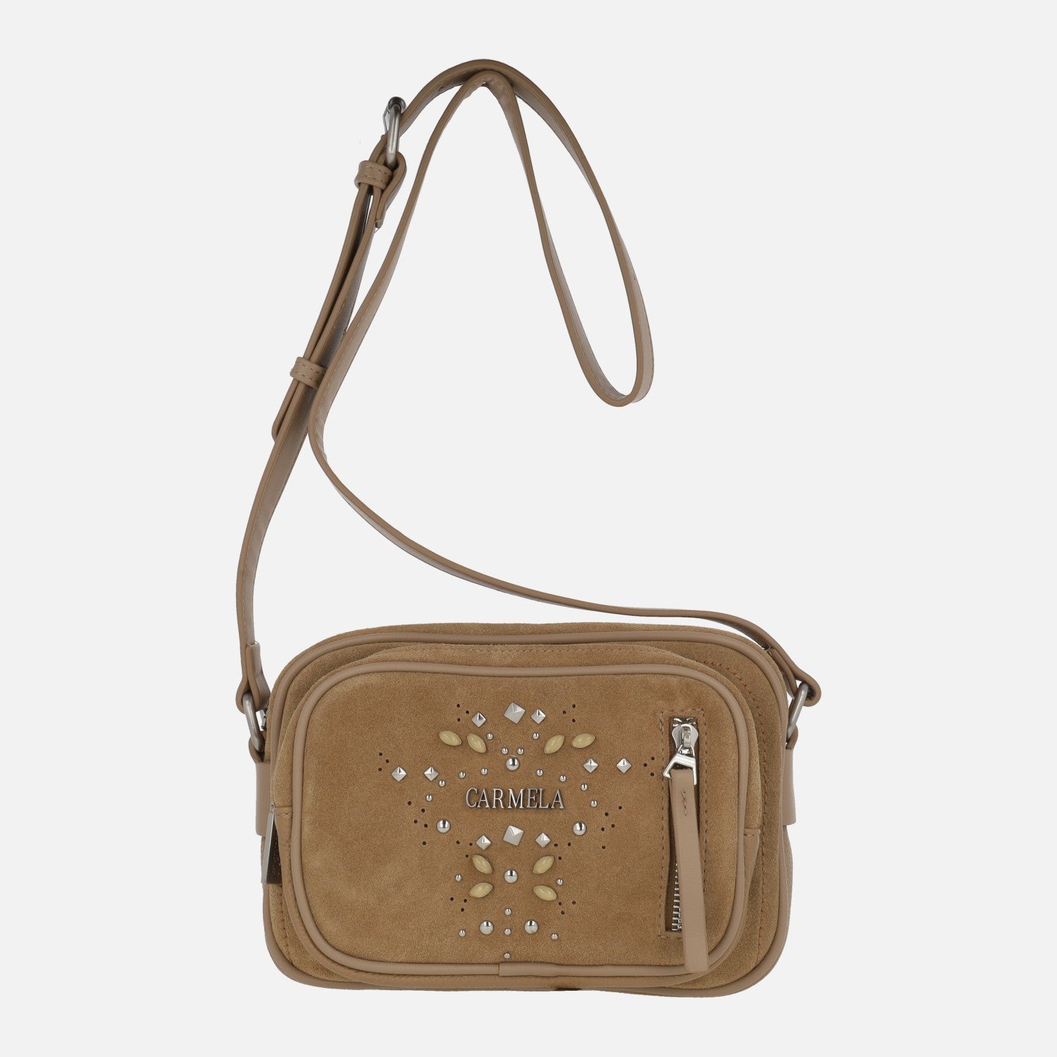 Bolsos bandolera en serraje camel con pedrería y tachas