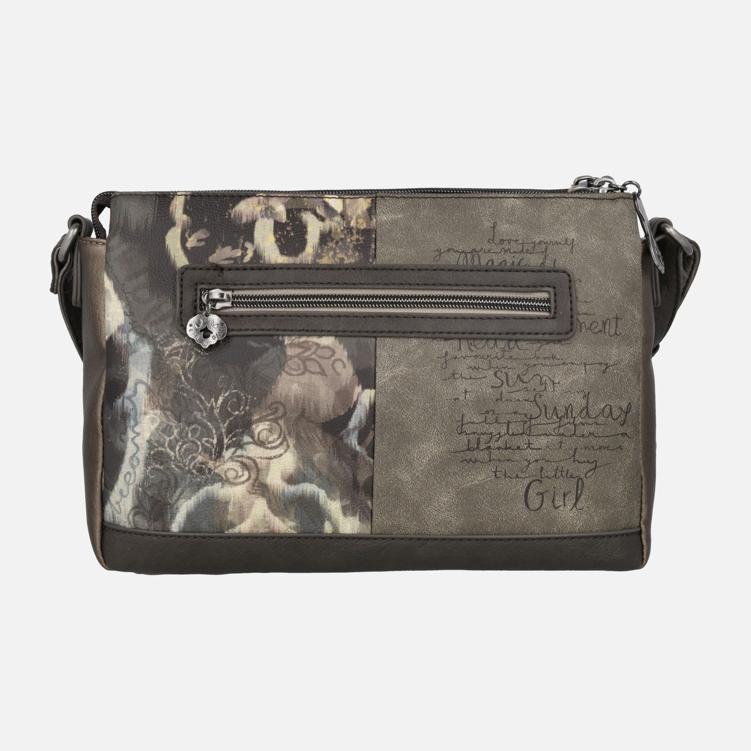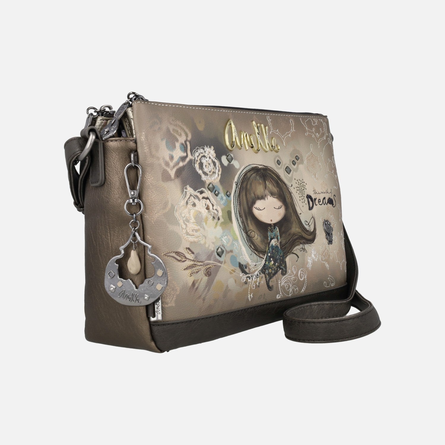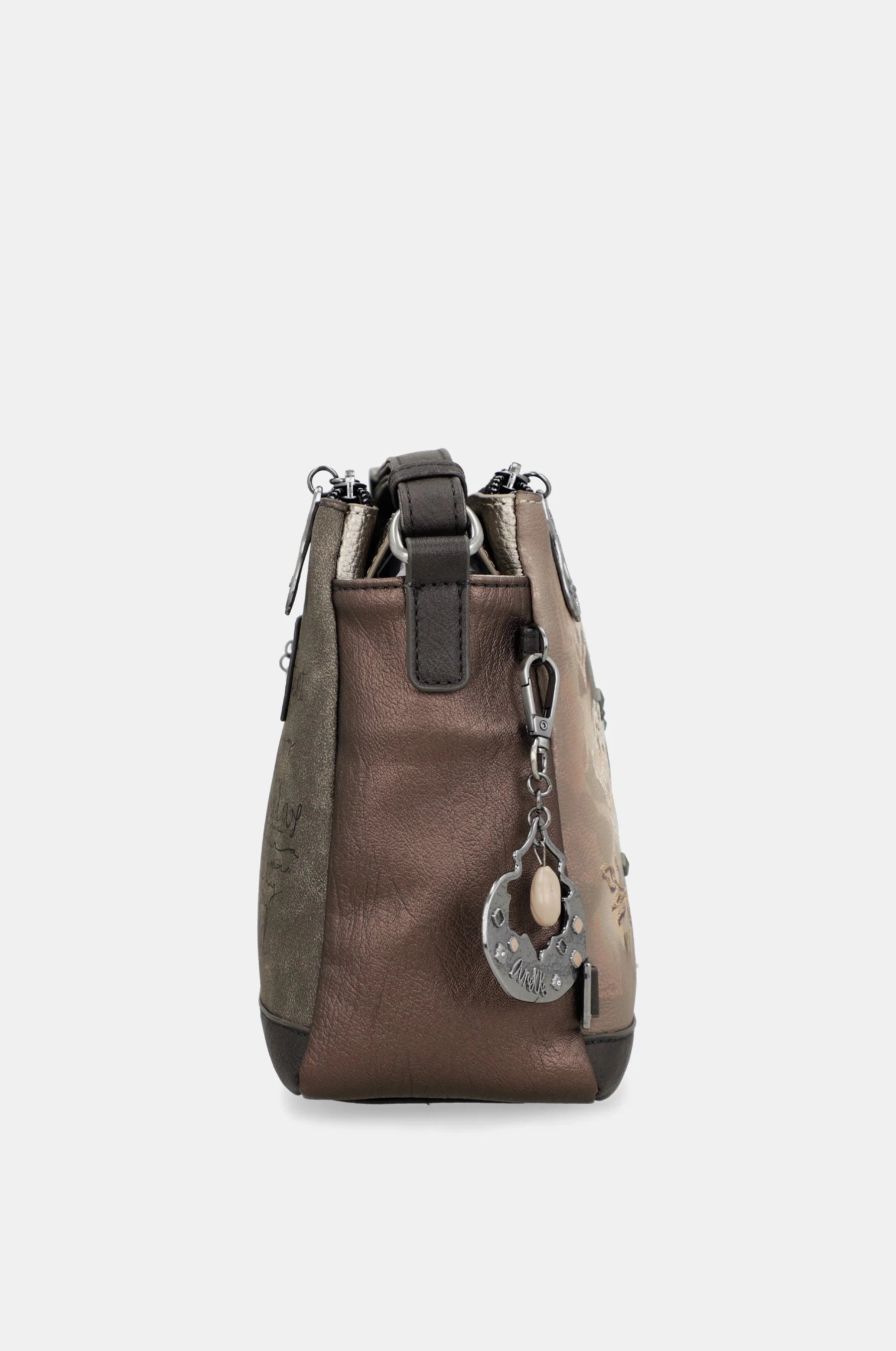 Bolsos bandolera modelo Real 41703-184 de la marca Anekke. Bolsos elaborados en materiales sintéticos en combinado taupe y bronce, con detalle de tachas, bordados y pedrería. 3 compartimentos independientes con cierre de cremallera, al igual que el bolsillo trasero. Interior textil con bolsillos. Asa ajustable de 65 cm al hombro como máximo. Medidas: 19 cm de alto x 27,5 cm de ancho x 10 cm de fondo.