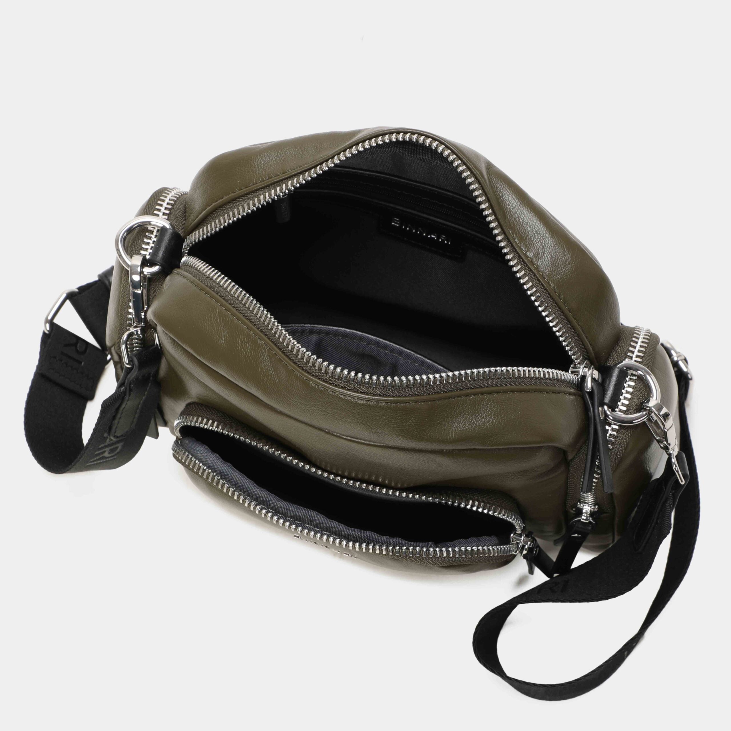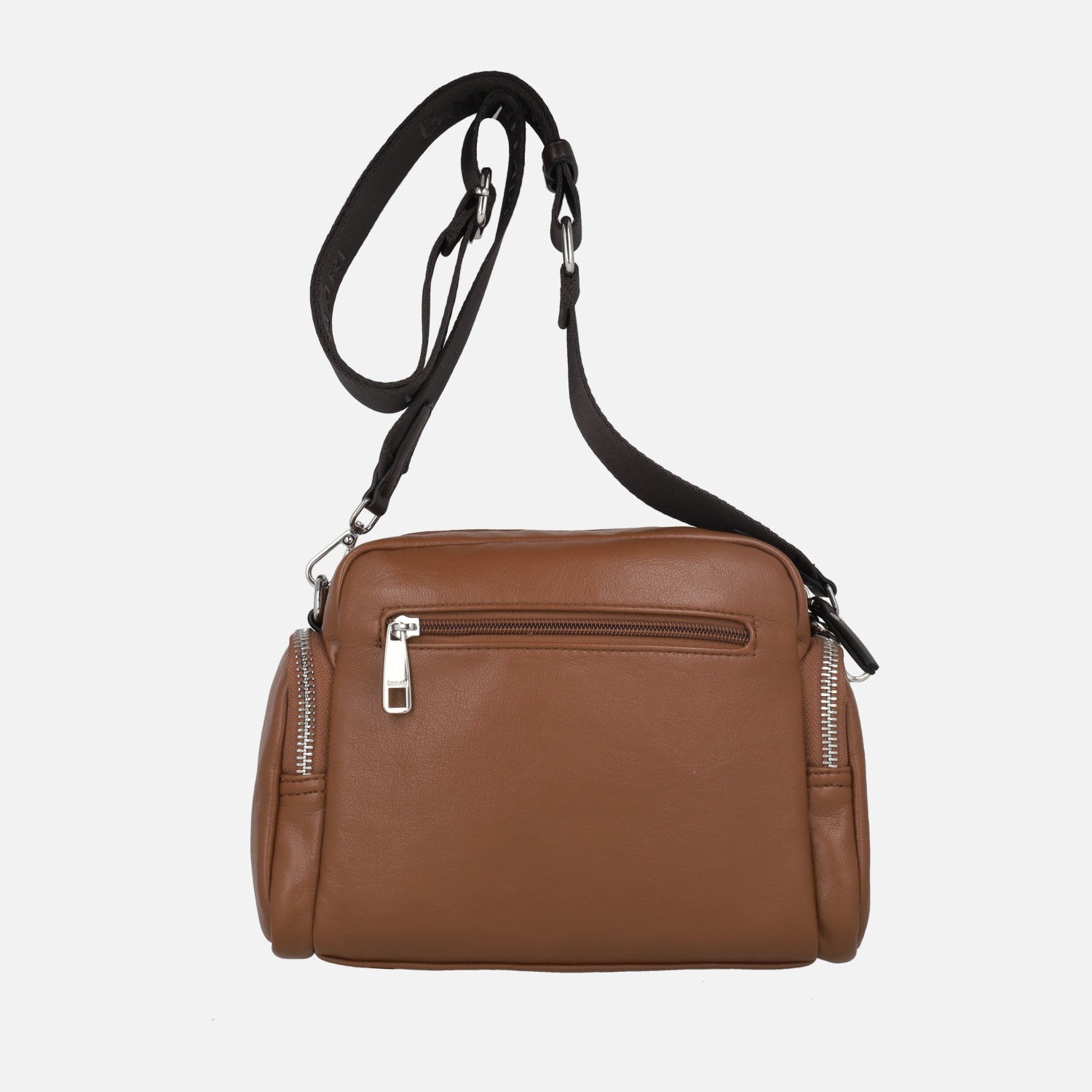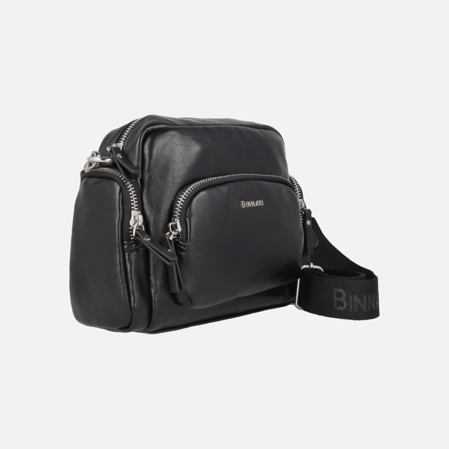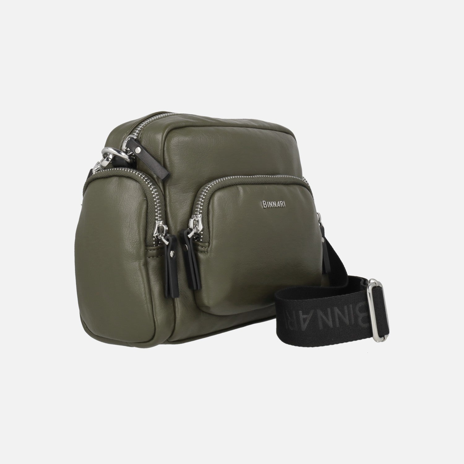 Bolsos bandolera de la marca Binnari modelo Rosie 20890, disponibles en marrón cuero, verde kaki y negro. Bolsos elaborados en materiales sintéticos (PU soft de alta calidad) con cierre principal de cremallera. Bolsillos delantero, trasero y laterales también con cremallera. Interior textil. Asa bandolera ajustable con hebilla. Medidas: 18,5 cm de alto x 26 cm de ancho x 8 cm de fondo. Logo metálico Binnari en la parte frontal.