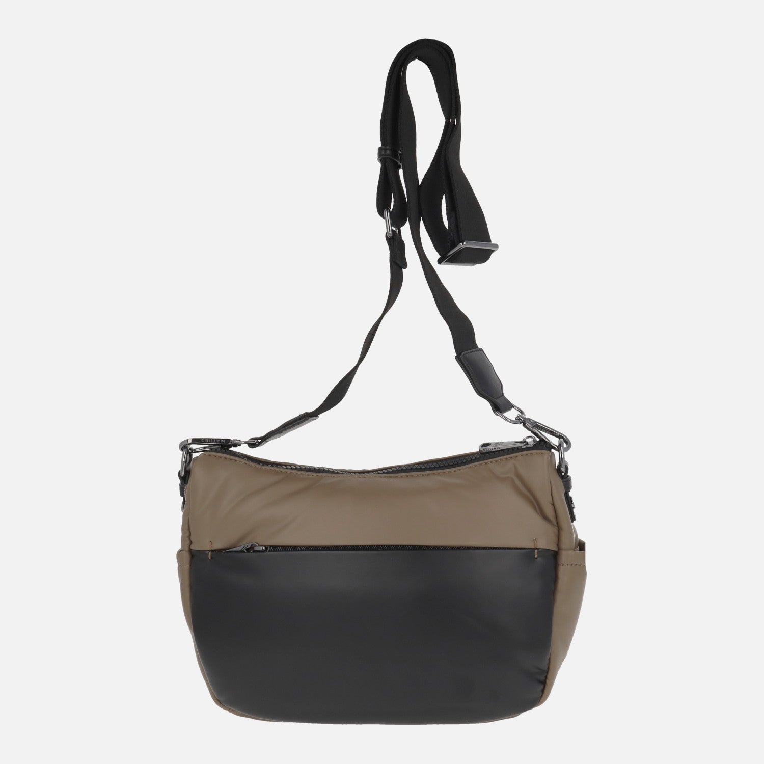 Bolsos bandolera marca Matties modelo 21001 línea Velside. Bolsos elaborados en materiales sintéticos y textiles, combinando negro con taupe o verde metalizados. Cierre principal de cremallera. Bolsillos delantero y trasero ambos con cremallera. Interior textil con bolsillos, uno con cremallera. Medidas: 17 cm de alto x 26 cm de ancho x 10 cm de fondo.