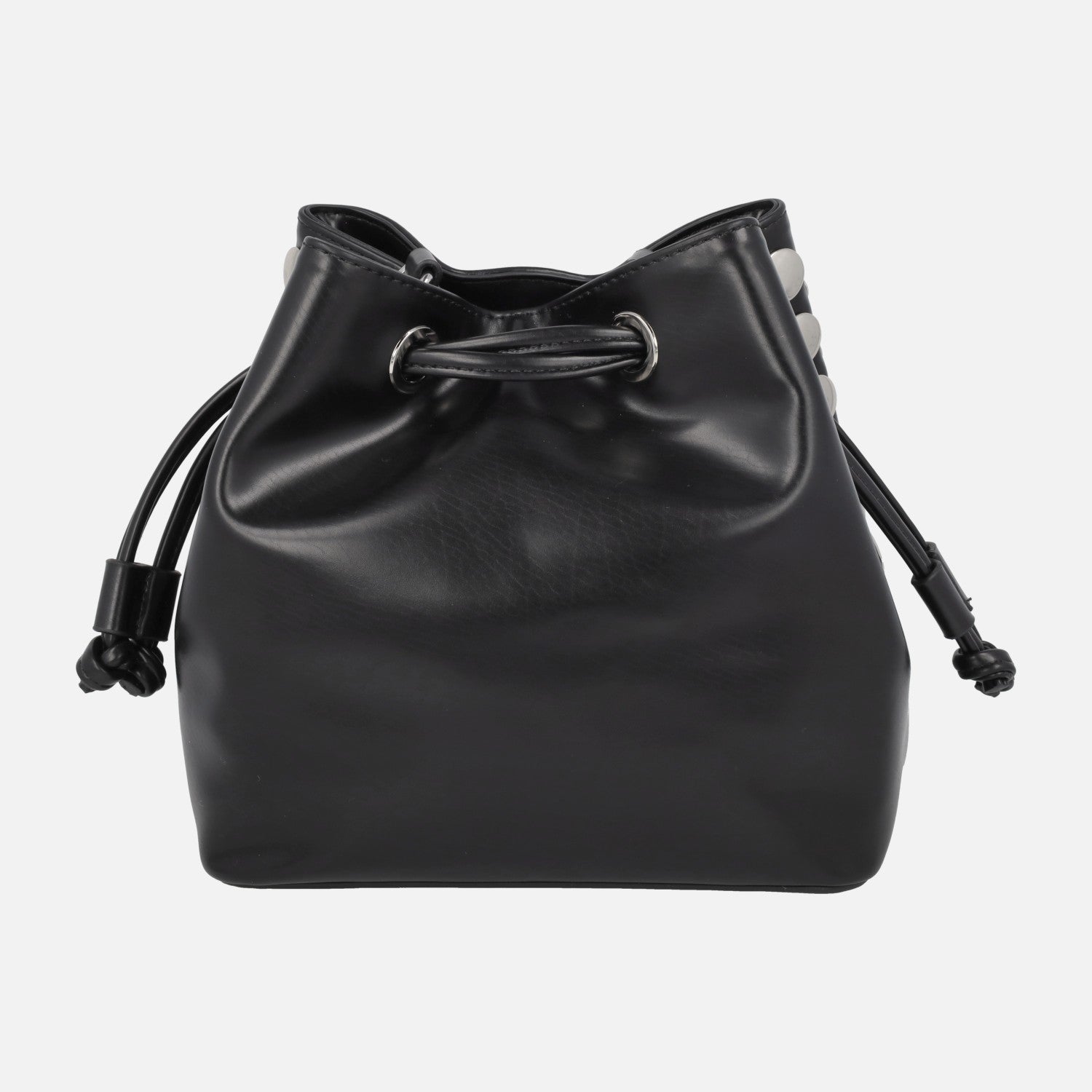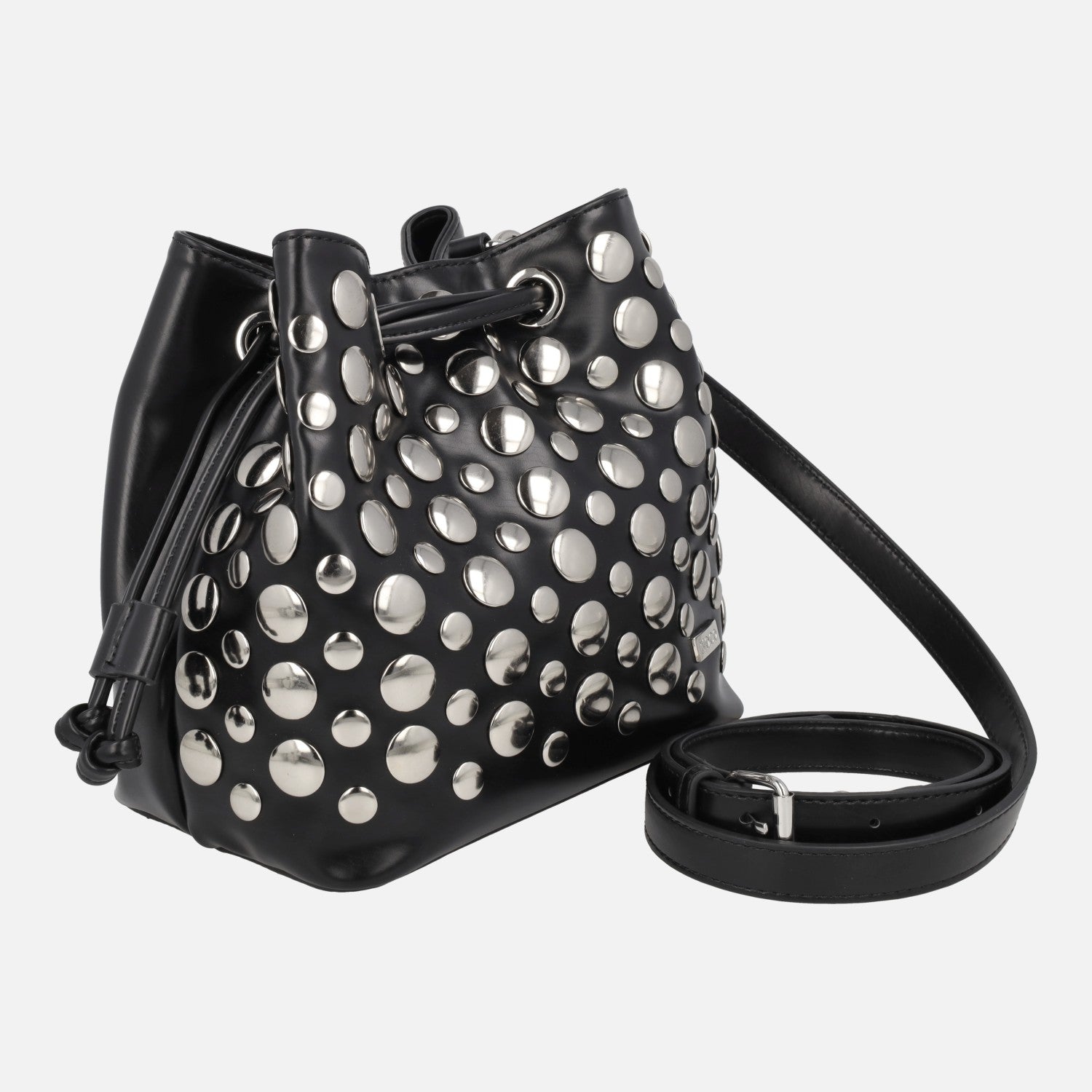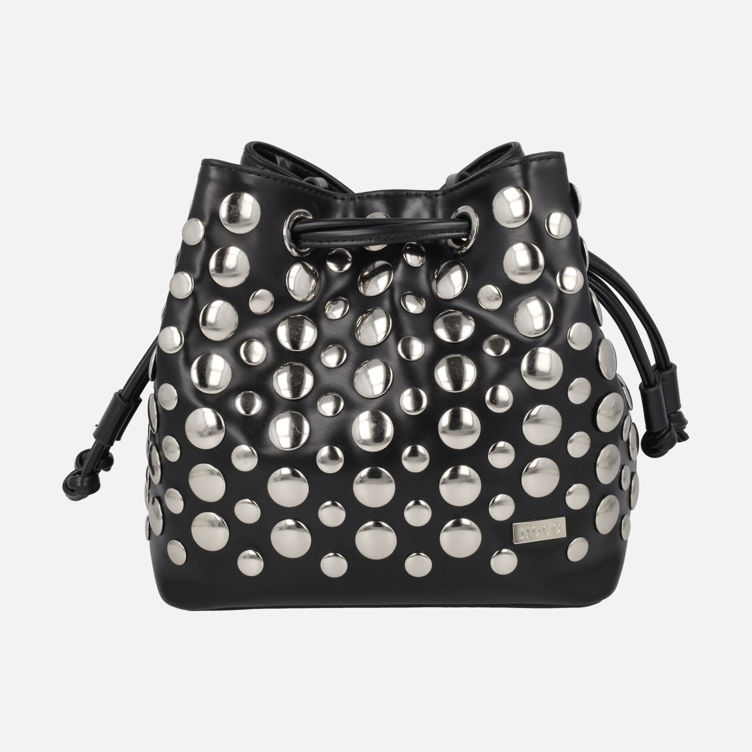 Elegantes bolsos bombonera de la marca Noco modelo 2525616 N Negro. Bomboneras elaboradas en materiales sintéticos en color negro, con tachas grandes circulares plateadas. Asa pequeña fija para llevar de mano y además asa bandolera ajustable con hebilla. Cierre de tiras ajustables. Interior textil con bolsillos, uno de ellos también con cremallera. Medidas: 20 cm de alto x 17 cm de ancho superior x 20 cm de ancho inferior x 13 cm de fondo.