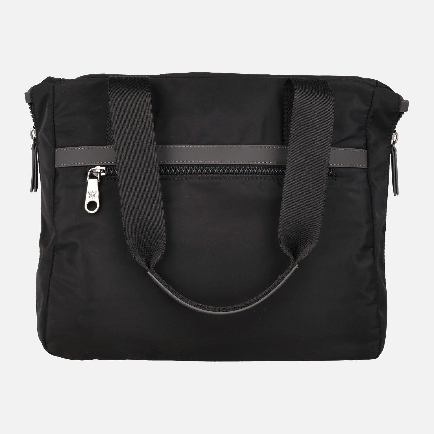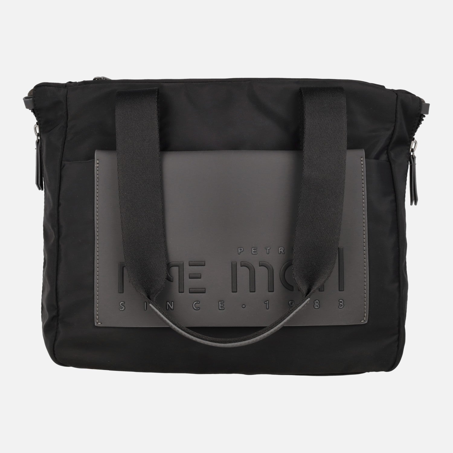 Bolsos estilo shopping de la marca Pepe moll modelo 252361 Black. Bolsos elaborados en tejido y poliuretano, combinando negro con gris. Bolsillo delantero grande que cierra con broche. Bolsillo trasero con cremallera. Cierre principal con cremallera. Interior textil con un bolsillo con cremallera. En la parte trasera compartimento para tablet o portatil, con broche. Dos asas fijas para llevar al hombro. Cremalleras laterales para variar la capacidad. Medidas: 26 cm de alto x 33 cm de ancho x 11 cm de fondo.