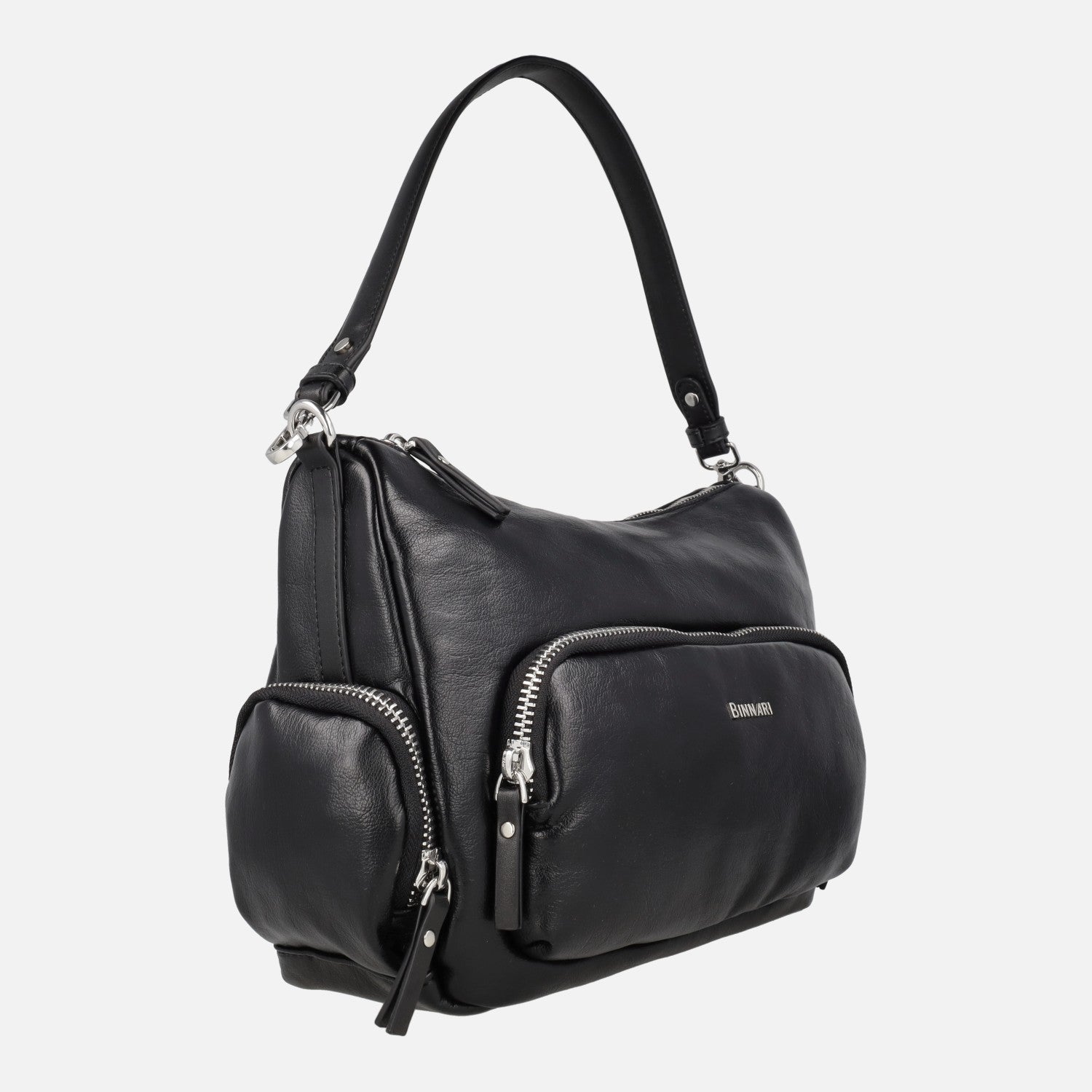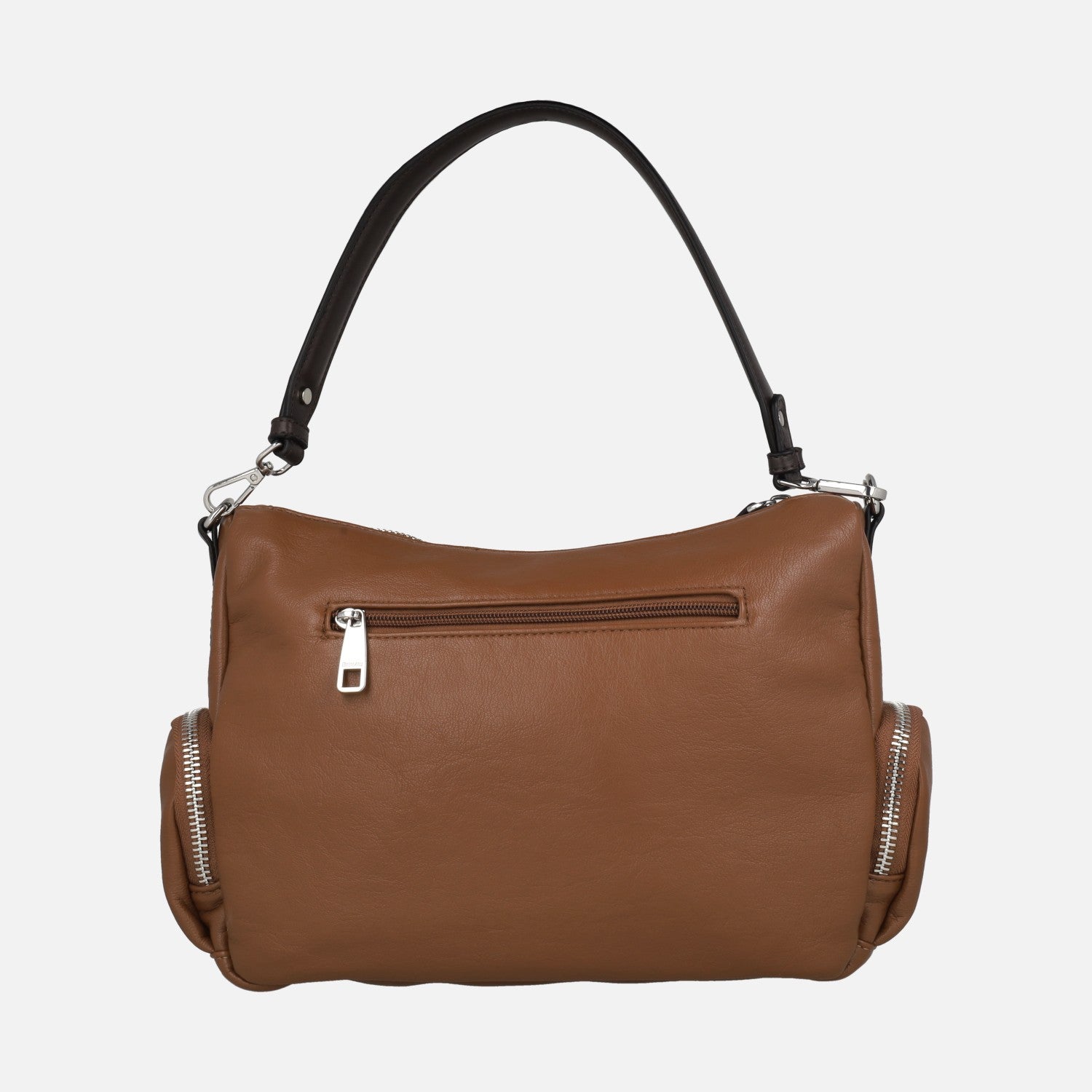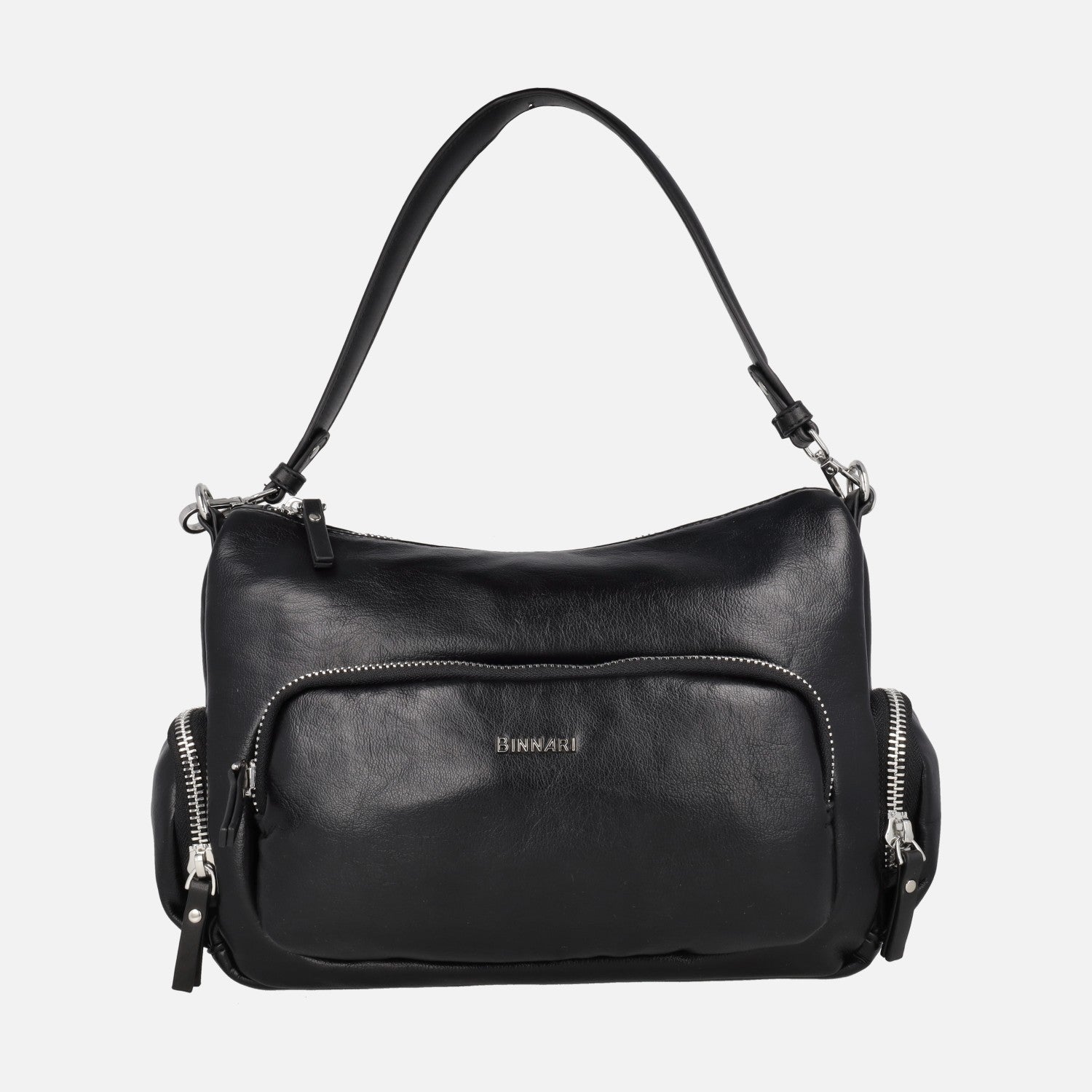 Bolsos doble posición de la marca Binnari modelo Rosie 20891, disponibles en marrón cuero, verde kaki y negro. Bolsos elaborados en materiales sintéticos (PU soft de alta calidad) con cierre principal de cremallera. Bolsillos delantero, trasero y laterales también con cremallera. Interior textil. Asa para hombro y además asa bandolera ajustable con hebilla. Medidas: 22 cm de alto en los laterales x 20 cm alto en la parte central x 33 cm de ancho x 11 cm de fondo. Logo metálico Binnari en la parte frontal.