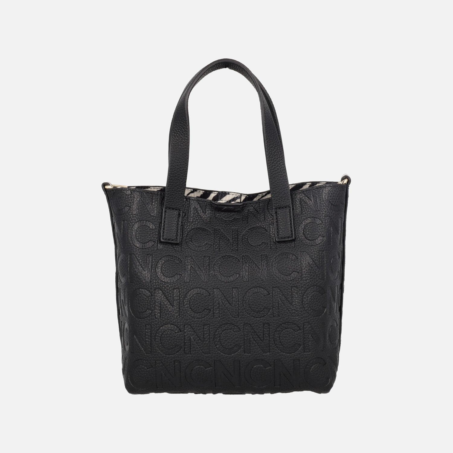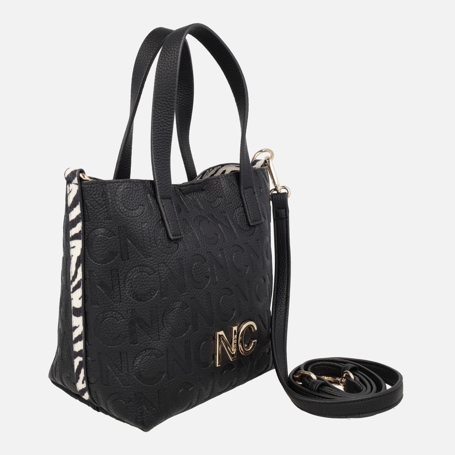 Bolsos formato cubo en tamaño pequeño de la marca Noco, modelo 2525635N Negro/Cebra. Bolsos elaborados en materiales sintéticos en color negro, con detalles en tejido print cebra en los laterales. Letras del logo Noco en relieve. Cierre con broche. En el interior lleva un neceser con una correa para que pueda usarse de bandolera (medidas del neceser: 16 cm de alto x 19 cm de ancho x 9 cm de fondo, con cierre de cremallera). Dos asas para llevar de mano, además bandolera ajustable con hebilla (vale para el bolso y para el neceser). Medidas: 19,5 cm de alto x 21 cm de ancho x 13 cm de fondo.