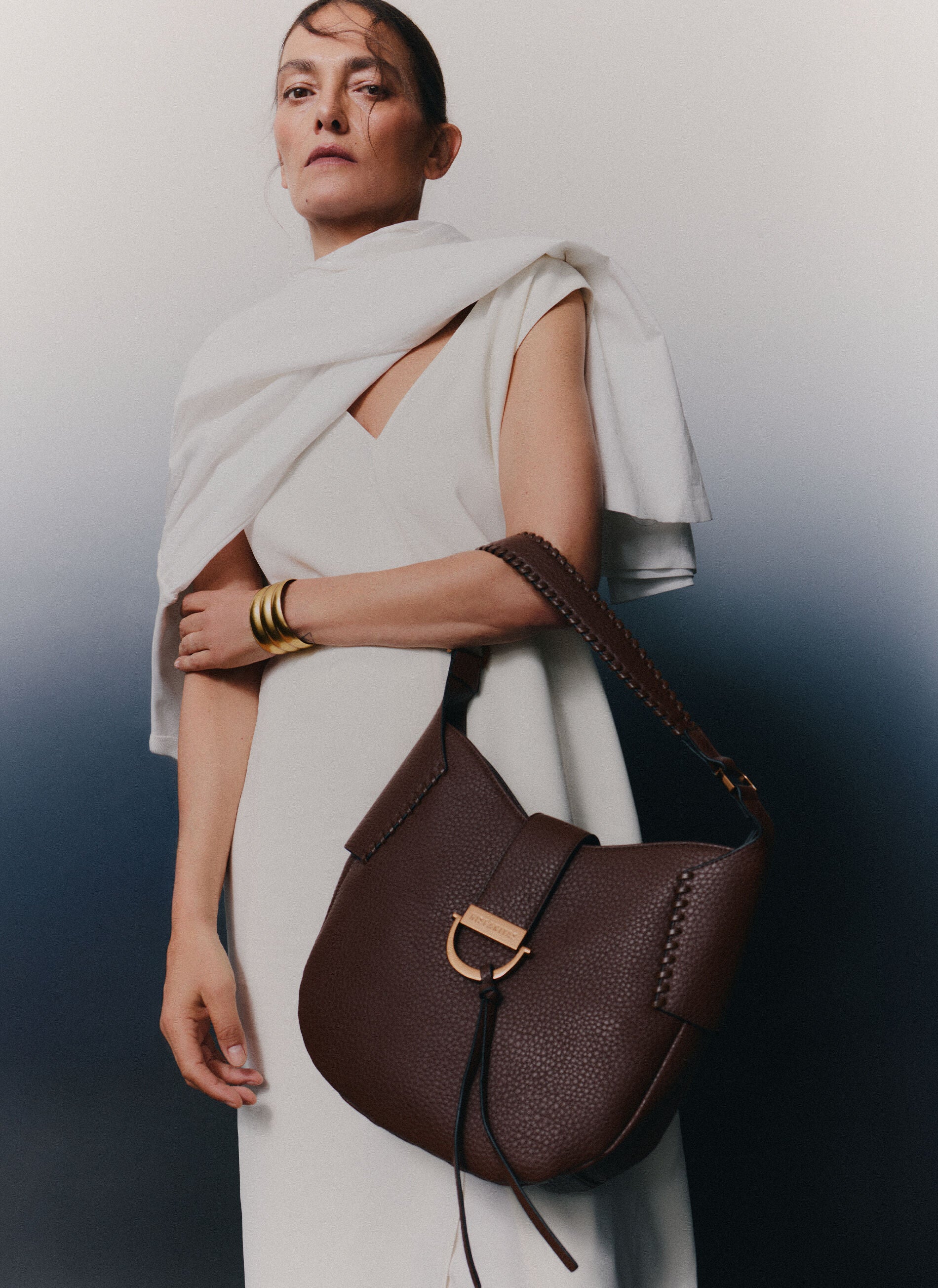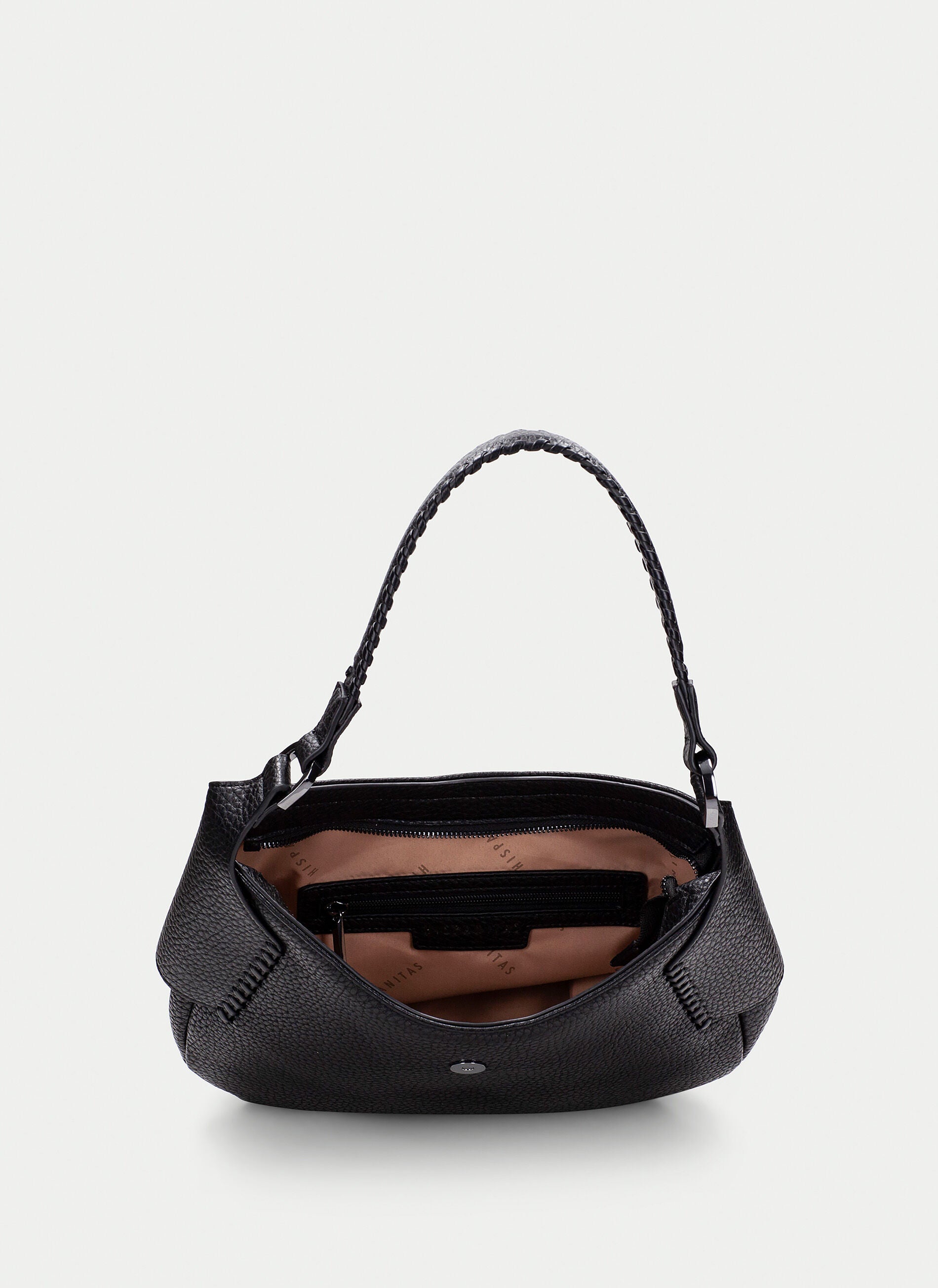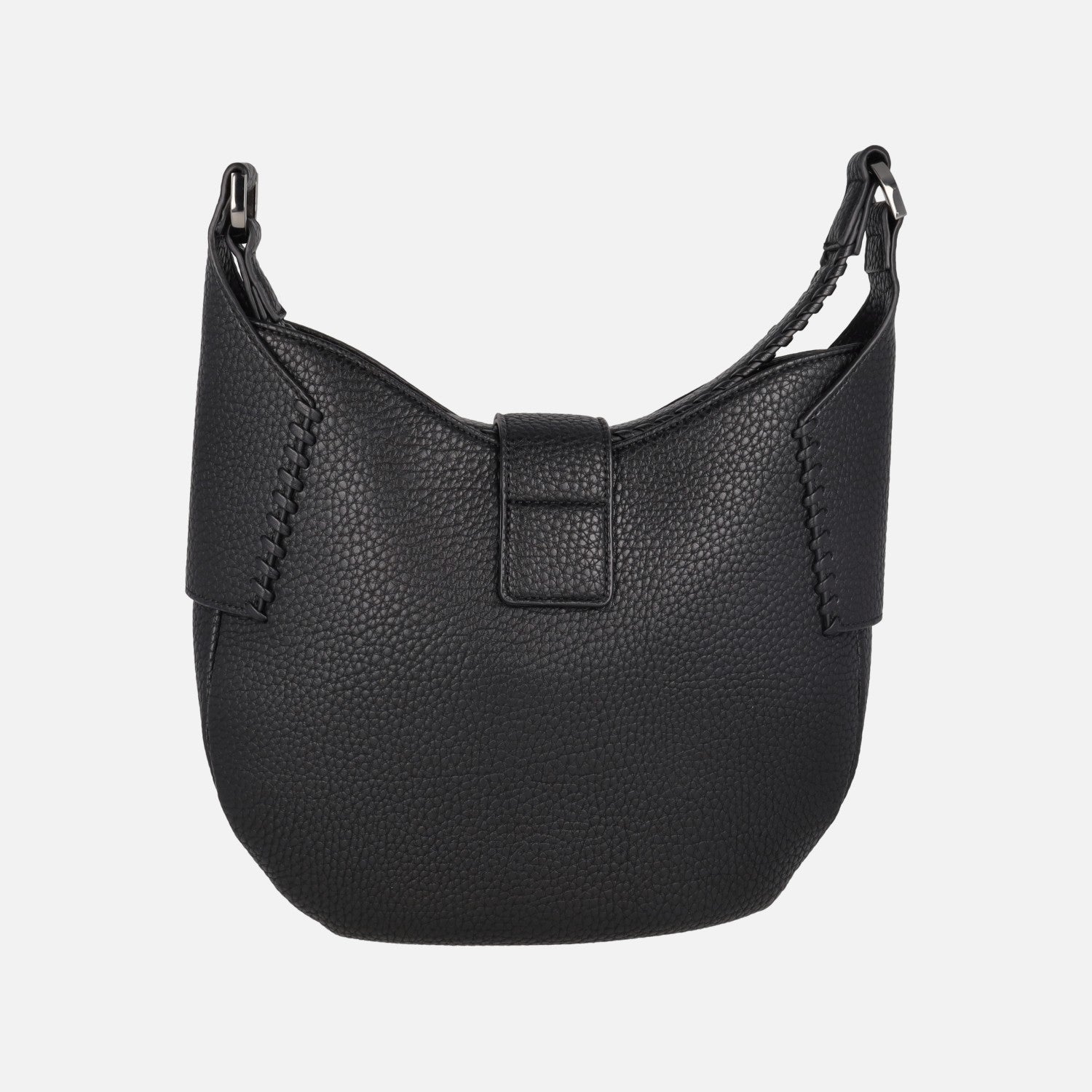 Bolsos Hobo de Hispanitas modelo BI254147, disponibles en negro y marrón avellana. Bolsos elaborados en materiales sintéticos, con forma redondeada. Cierre de cremallera central, con tira y adorno metálico decorativos (con broche imantado). Interior textil con dos bolsillos, uno de ellos con cremallera. Asa corta fija, asa bandolera ajustable. Medidas: 23 cm de alto en la parte central (27 cm de alto en los laterales) x 32 cm de ancho x 14 cm de fondo.