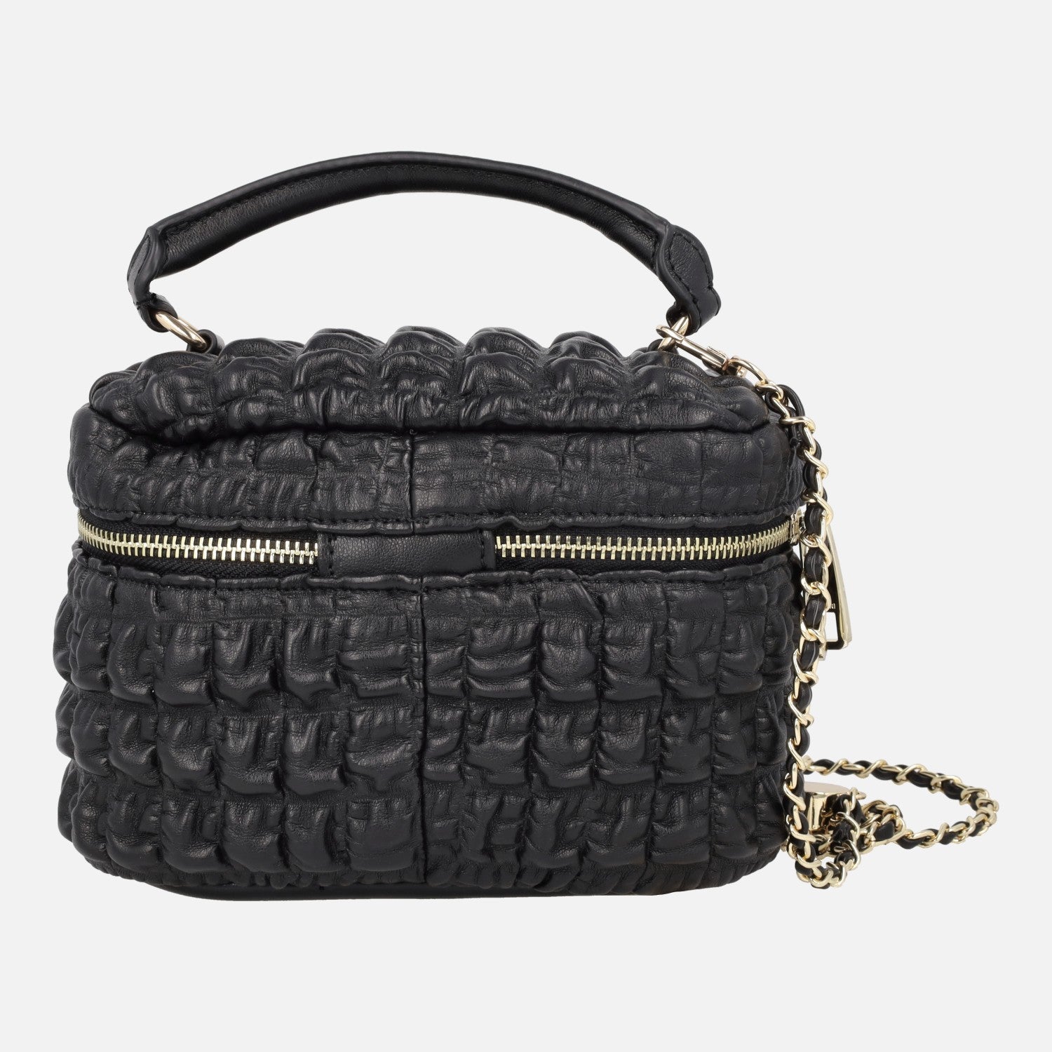 Preciosos bolsos marca Binnari modelo Luma 21052, disponibles en negro, camel, cava (oro) y hielo (beige). Bolsos con diseño acolchado, elaborados en materiales sintéticos (PU) efecto piel, con un cierre de doble cremallera rodeando al bolso que nos recuerda a un joyero. Asa fija en la parte superior, para llevar de mano, además asa bandolera en combinado de cadena dorada entrelazada con materiales sintéticos efecto piel. Interior textil con un bolsillo. Medidas: 13 cm de alto x 19 cm de ancho x 10 cm de fondo. Ideales para uso diario y también para vestir.