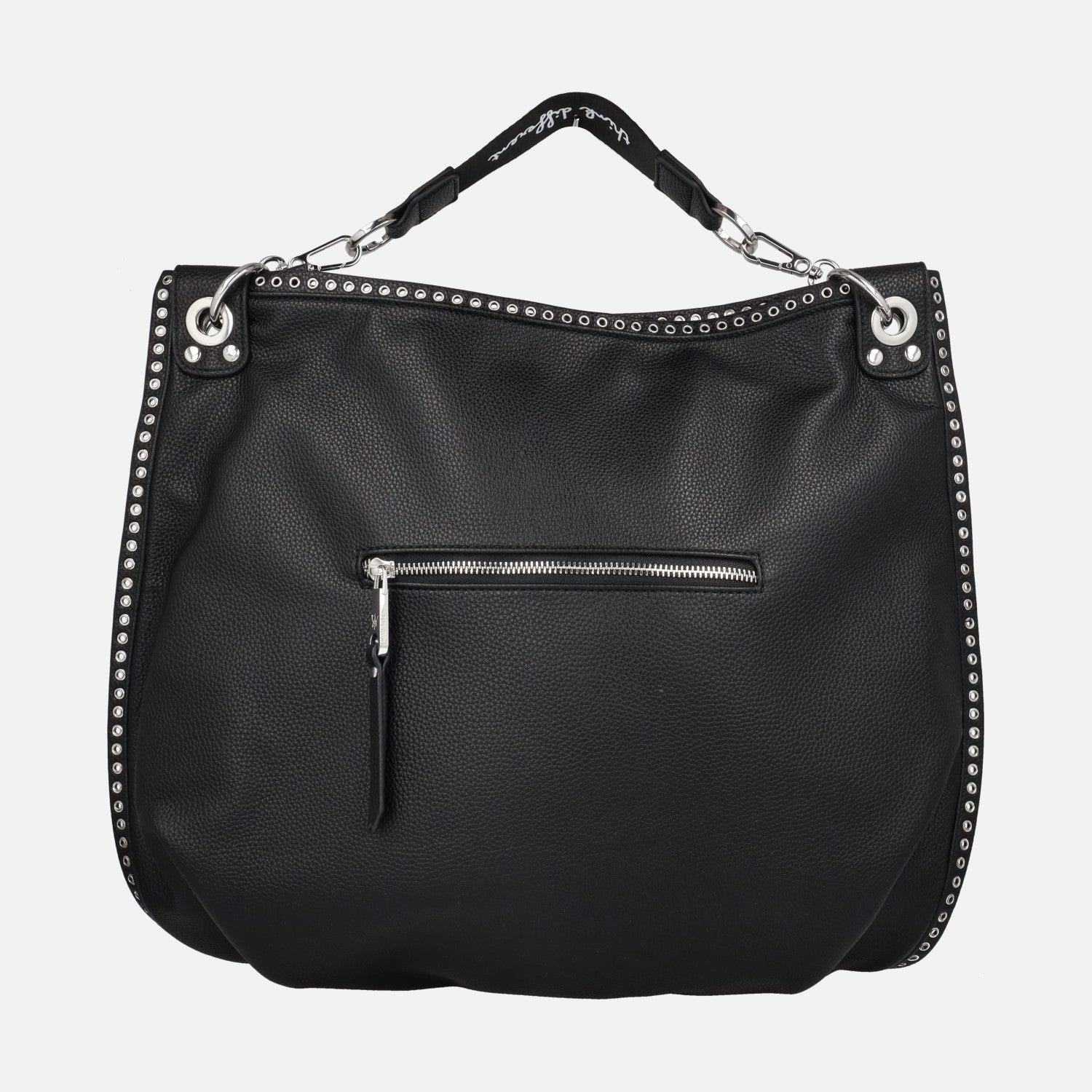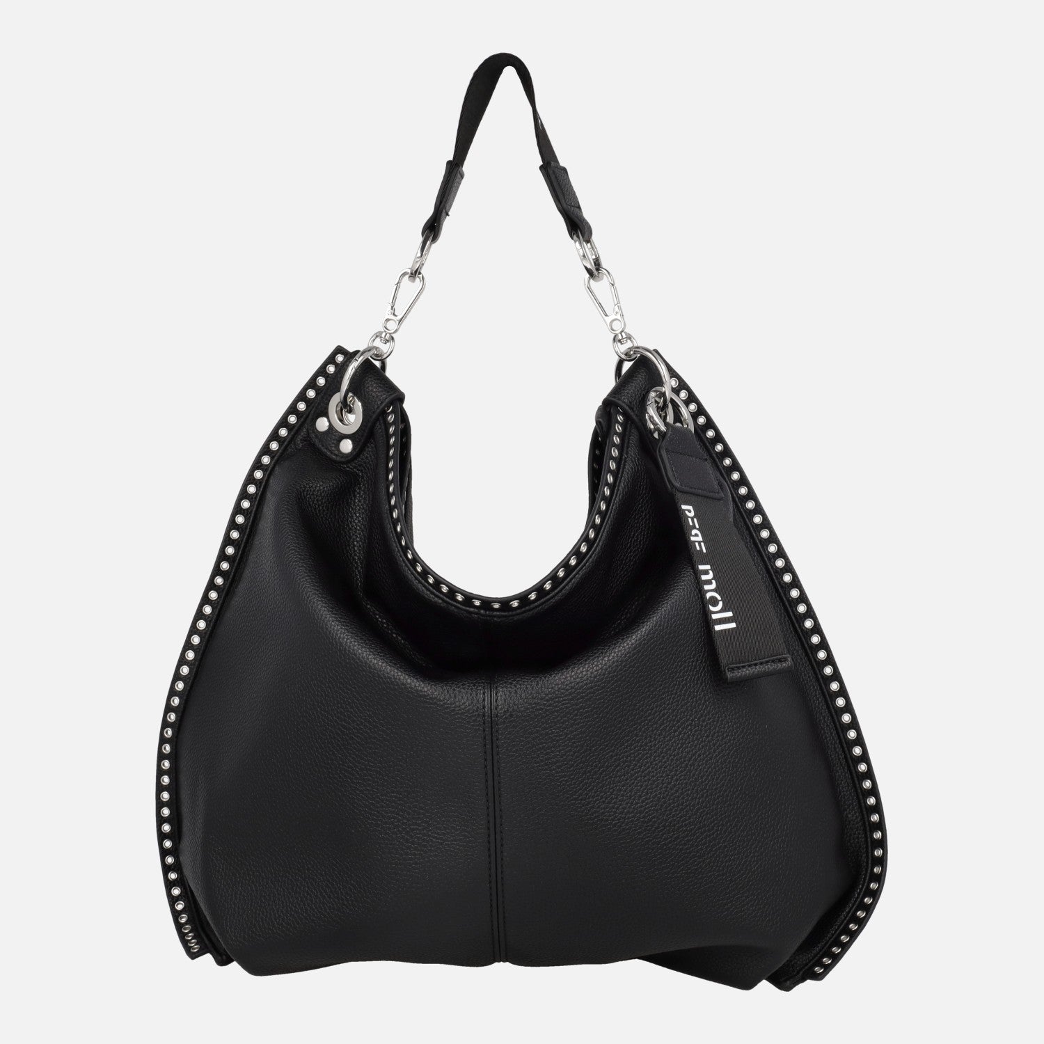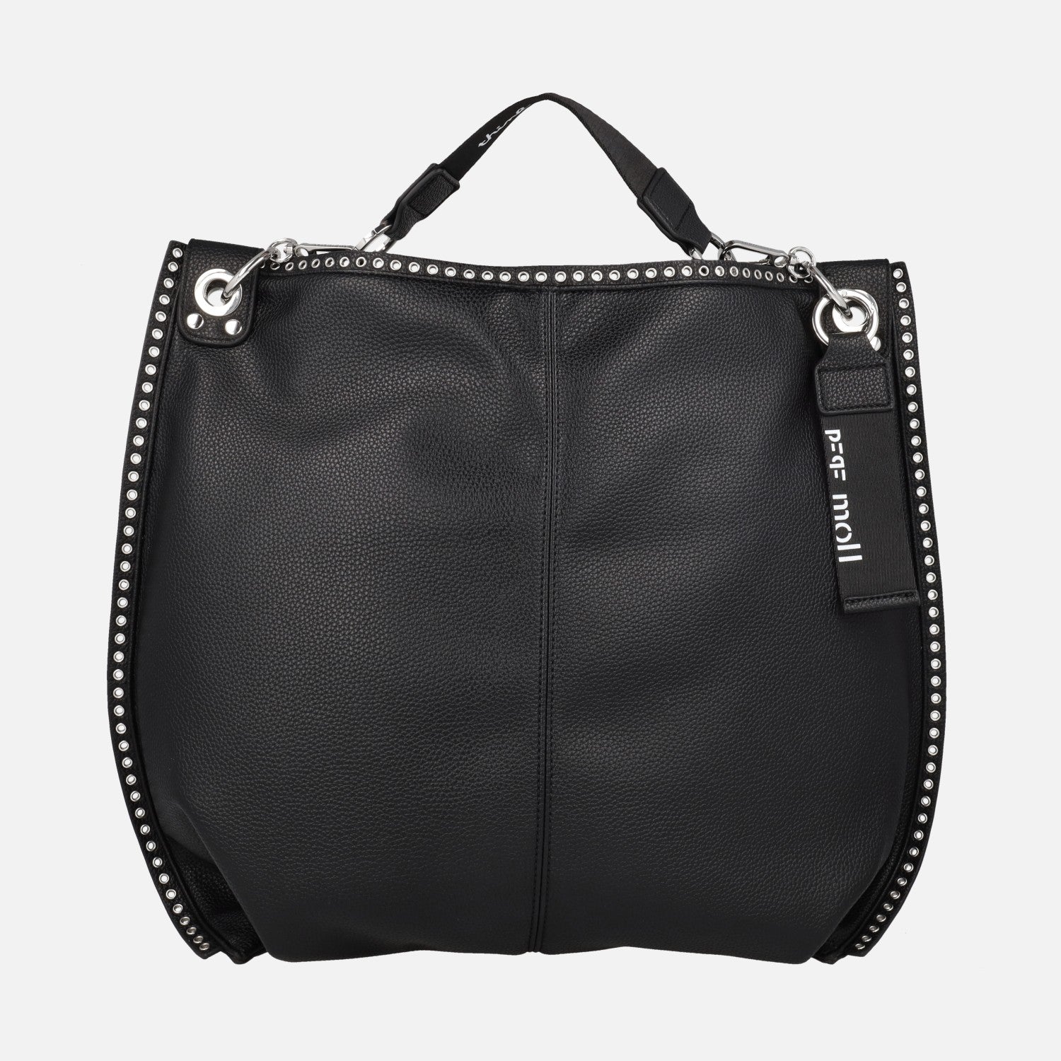 Bolsos Pepe moll modelo 261251 Jenifer Black. Bolsos de color negro, elaborados en poliuretano 100% con detalle de tachas metálicas en todo el contorno. Bolsillo trasero con cremallera. Cierre principal con cremallera. Interior textil con bolsillos. Asa extraíble corta y además asa bandolera ajustable y extraíble. Medidas aproximadas: 40 cm de alto x 48 cm de ancho central x 6 cm de fondo.