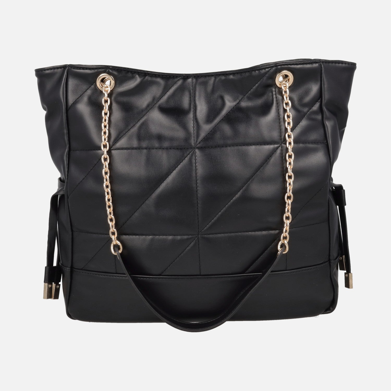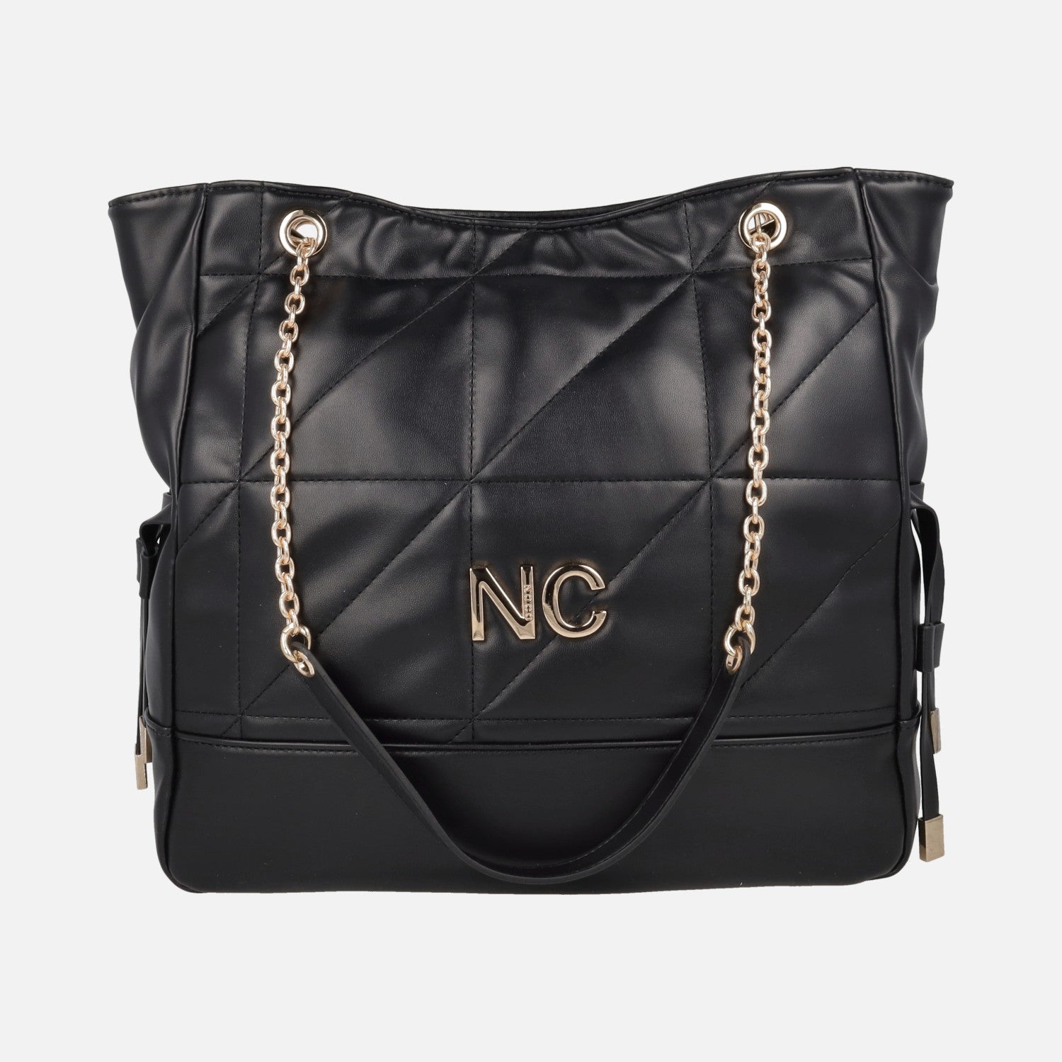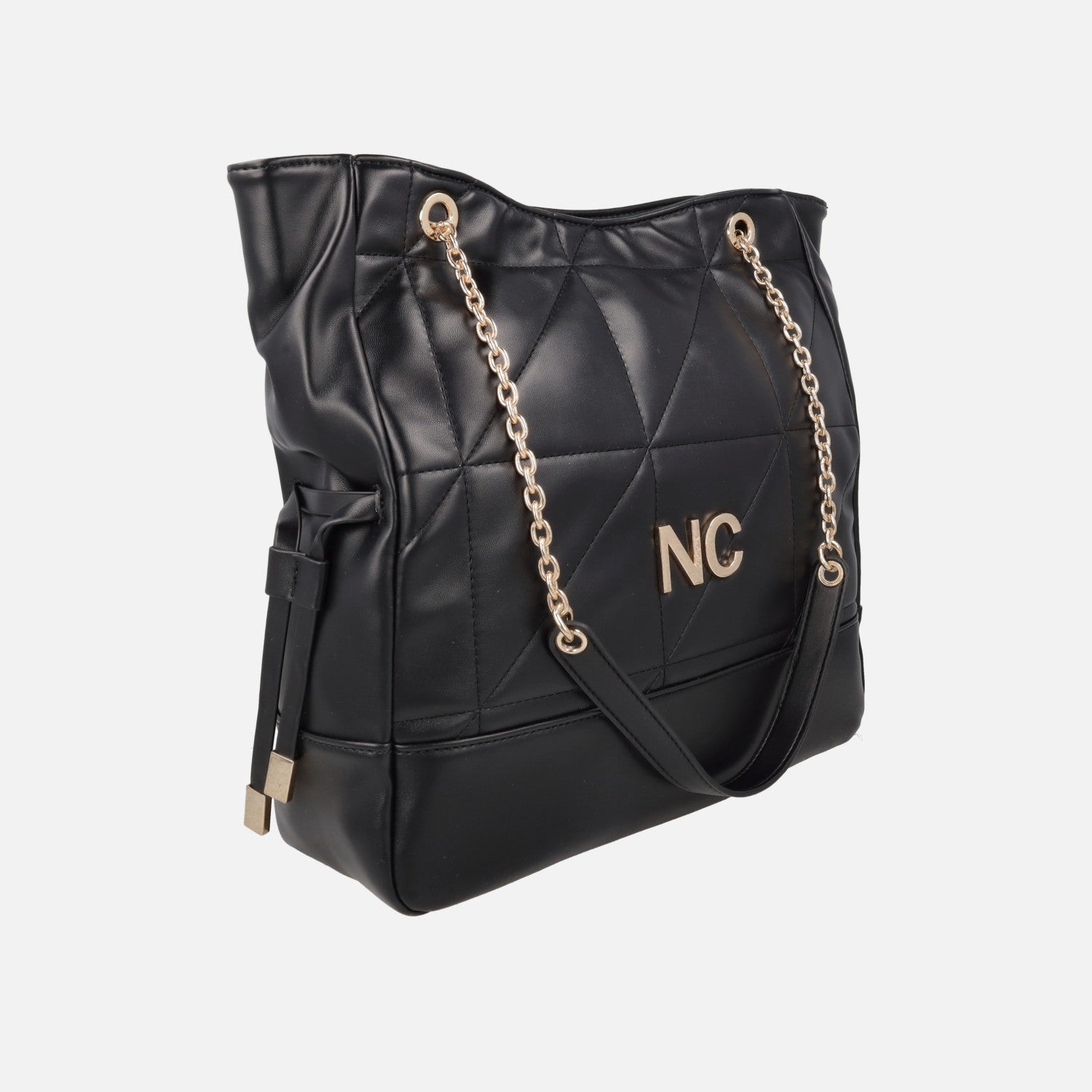 Bolsos para hombro de la marca Noco, modelo 2525639 Negro. Bolsos elaborados en materiales sintéticos en color negro. Cierre de cremallera central, logo metálico de letras Noco NC en la parte delantera. Interior textil con dos bolsillos, uno de ellos con cremallera. Dos asas con cadena dorada. Medidas: 30 cm de alto x 32 cm de ancho x 10 cm de fondo. Lleva unos cordones laterales para ajustar el tamaño.