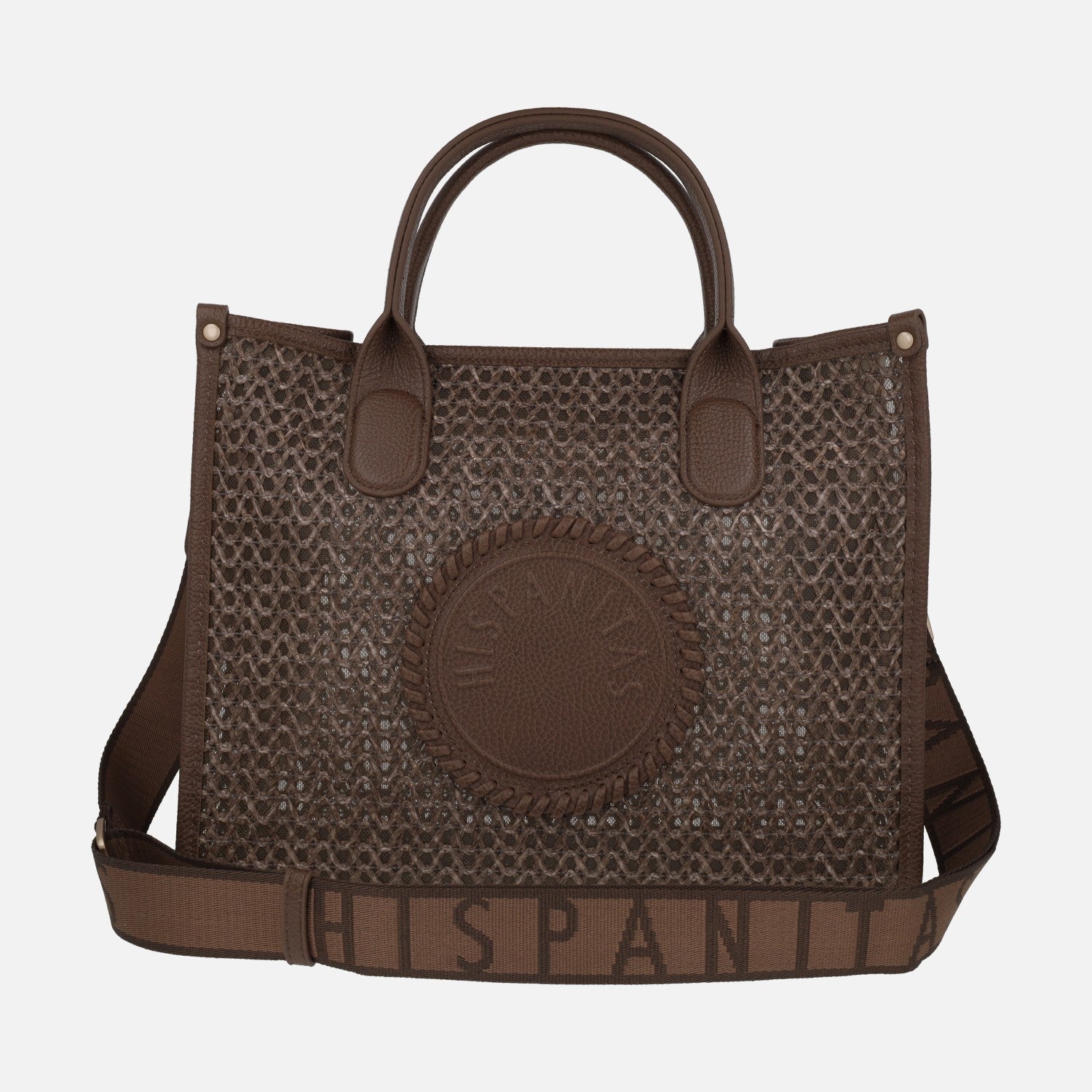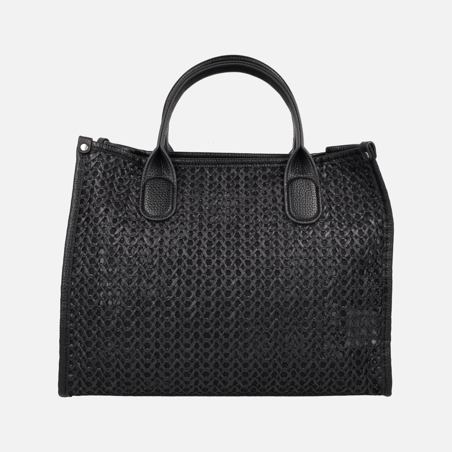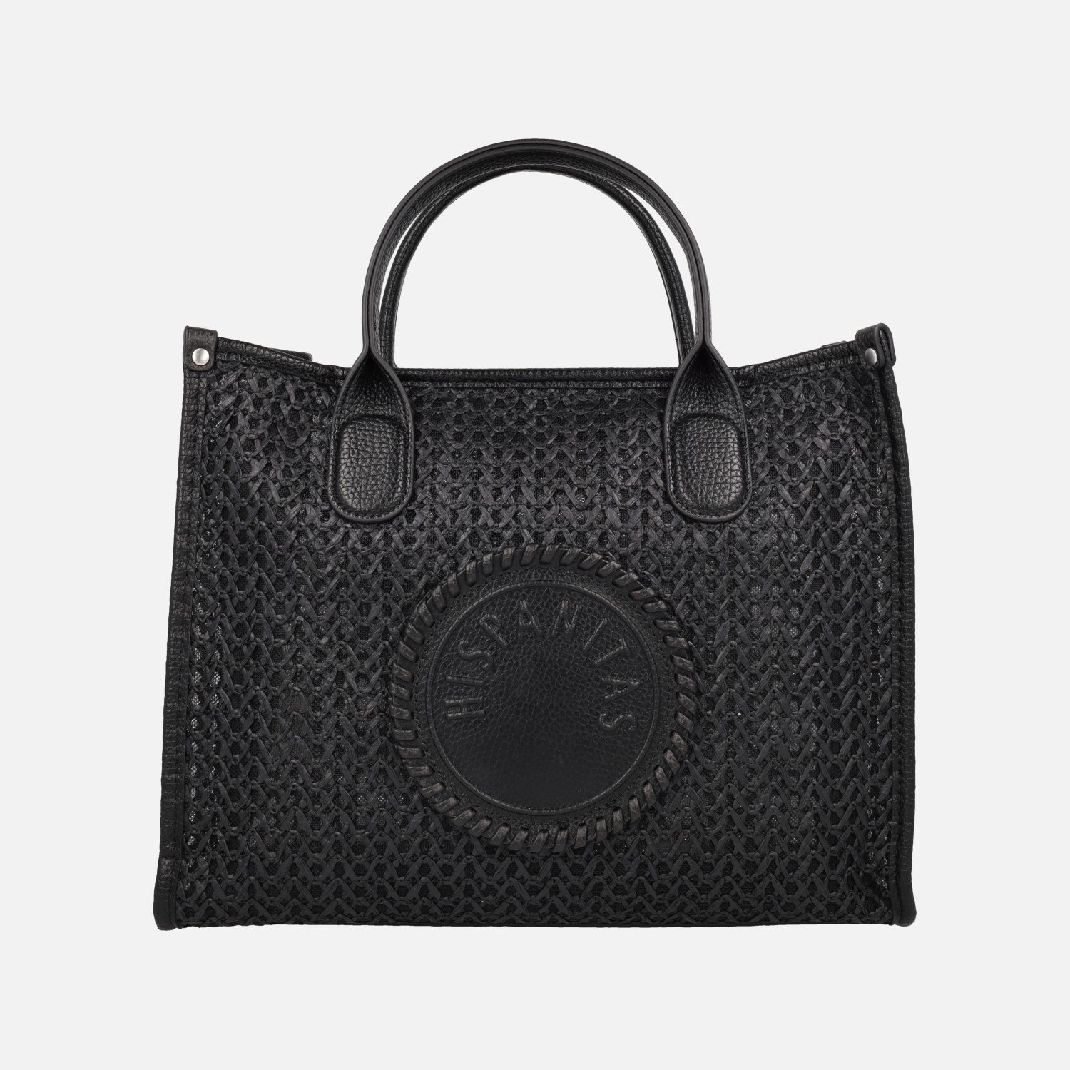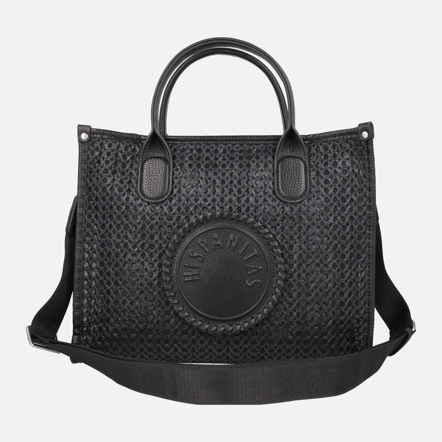 Bolsos Hispanitas modelo BV264717 Black. Bolsos trenzados en color negro, elaborado 10% poliuretano 90% papel. Cierre central de cremallera. Interior sintético, estilo malla, con neceser incluido. El neceser tienen cierre de cremallera central e interior textil, con unas medidas de 17 cm de alto x 26 cm de ancho. Dos asas cortas y además un asa bandolera ajustable con hebilla. Medidas: 27 cm de alto x 34 cm de ancho x 10,5 cm de fondo.